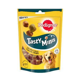 Share moments of happiness and joy with your dog using healthy and tasty Pedigree treats. Pedigree Tasty Minis Adult Dog Treats with Chicken and Duck Flavour Chunks are special treats for your furry friend that will bring a smile to their face and yours. These delicious, bite-sized treats contain less than 12 kcal per treat and are rich in flavour and texture, ideal for training, rewarding, or simply treating your dog any time of day. Pedigree Tasty Minis are complementary pet food for adult dogs. With low-fat content and the added goodness of Omega 3, they help keep your furry friend fit for life. They also contain Vitamin E, supporting natural defenses, and minerals like calcium that promote strong bones. These treats perfectly complement your dog’s complete and balanced meals, with no artificial colours or flavours. Suitable for adult dogs, feed as per the feeding guide on the pack based on your dog’s breed size. Give your furry friend the treat they deserve!