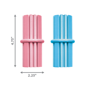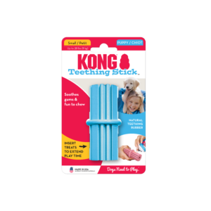 The KONG Puppy Teething Stick is made with unique KONG Classic puppy rubber. The ridges gently clean teeth and soothe sore gums when chewed. Fill them with Easy Treat or Peanut Butter to encourage long-lasting play sessions. Playing with the Puppy Teething Stick helps teach puppies appropriate chewing behavior. Use with puppies until they reach 9 months, then they can graduate to KONG Classic Rubber toys.