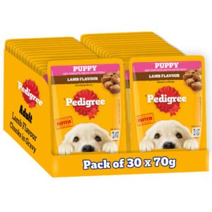 Make every mealtime a fusion of taste and nutrition for your Puppy with Pedigree. Made with real meat and high-quality protein, Pedigree Puppy Wet Dog Food, Lamb Flavour Chunks in Gravy, ensures that you are providing a meal that keeps your puppy happy and supports their well-being. This exciting meal is packed with gravylicious lamb flavour chunks that your furry companion will love. Packed with essential nutrients, it is a 100% complete and balanced meal that provides your dog with all the nutrients to grow up healthy and strong. Protein & Calcium support strong muscles & bones while DHA supports brain & vision development. Vitamin E & Selenium support a healthy natural defense. The water content in the meal ensures your dog is well-hydrated. At Pedigree, recipes are developed based on research from the Waltham Centre for Pet Nutrition. Every product from Pedigree meets the requirements laid down by NRC 2006 of the U.S. National Academy of Science. Give your dog the goodness of Pedigree to satisfy their cravings and support their good health.