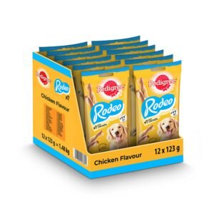 Share unforgettable moments of joy with your dog by rewarding them with the wholesome goodness of Pedigree treats. Pedigree Rodeo (4+ Months) Dog Treat in Chicken Flavour is a special treat to bond with your furry best friend. With its unique twist format, this treat offers a deliciously chewy texture bursting with succulent chicken flavour. Pedigree Rodeo is a carefully crafted complementary pet food designed to nourish dogs. Its low-fat formula, enriched with Omega 3, they help keep your furry friend fit for life. Vitamin E supports their natural defences, while essential minerals like calcium strengthen their bones. A perfect complement to your dog’s balanced diet as it has no artificial colours or flavours. Follow the feeding guide on the pack based on your dog’s size for optimal enjoyment. Give your loyal companion the treat they truly deserve!
