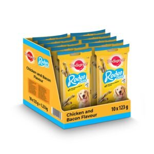 Share unforgettable moments of joy with your dog by rewarding them with the wholesome goodness of Pedigree treats. Pedigree Rodeo Duos (4+ Months) Dog Treat in Chicken & Bacon Flavour is a special treat to bond with your furry best friend. With its unique twist format, this treat offers a deliciously chewy texture bursting with succulent chicken flavour. Pedigree Rodeo is a carefully crafted complementary pet food designed to nourish dogs. Its low-fat formula, enriched with Omega 3, they help keep your furry friend fit for life. Vitamin E supports their natural defences, while essential minerals like calcium strengthen their bones. A perfect complement to your dog’s balanced diet as it has no artificial colours or flavours. Follow the feeding guide on the pack based on your dog’s size for optimal enjoyment. Give your loyal companion the treat they truly deserve!