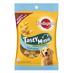 Share moments of happiness and joy with your dog using healthy and tasty Pedigree treats. Pedigree Tasty Minis Puppy Dog Treat in Chicken Flavour Chunks is a special treat for your furry friend that will bring a smile to their face and yours. These delicious bite-sized treats for puppies are rich in flavour and texture, ideal for training, rewarding, or simply treating your dog at any time of the day. Pedigree Tasty Minis are complementary pet food specially designed for puppies. The added goodness of Omega 3 helps keep your furry friend fit for life. The treat also contains Vitamin E, supporting natural defenses, and minerals such as calcium that supports strong teeth & bones. These treats perfectly complement your puppy’s complete and balanced meals, with no artificial colors or flavours added. Suitable for puppies aged over 4+ Months, feed as per the feeding guide on the pack based on your dog’s breed size. Give your furry friend the treat they deserve!