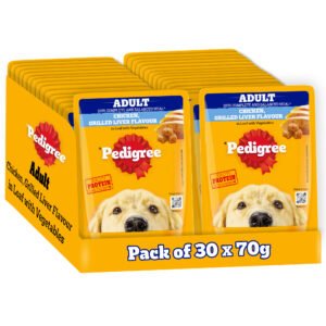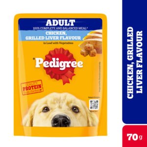 Make every mealtime a fusion of taste and nutrition for your Dog with Pedigree. Pedigree Adult Wet Dog Food, Grilled Liver Chunks Flavour in Gravy with Vegetables, ensures that you are providing a meal that keeps your dog happy and supports their well-being. This exciting meal is packed with gravylicious grilled liver chunks flavour with vegetables that your furry companion will love. Packed with essential nutrients, it provides complete and balanced nutrition for your dog to stay healthy and strong. When fed as per the feeding guidelines (refer to the back of the pack), you will see the 5 Signs of Good Health in your adult dog. These signs include healthy skin and coat (from Zinc and Omega 6); strong bones and teeth (from calcium and phosphorus); healthy digestive system (from dietary fibre); strong muscles (from Protein); effective working of the body system (from Vitamins and Minerals). The water content in the meal ensures your dog is well-hydrated. At Pedigree, recipes are developed based on research from the Waltham Centre for Pet Nutrition. Every product from Pedigree meets the requirements laid down by NRC 2006 of the U.S. National Academy of Science. Give your dog the goodness of Pedigree to satisfy their cravings and support their good health.