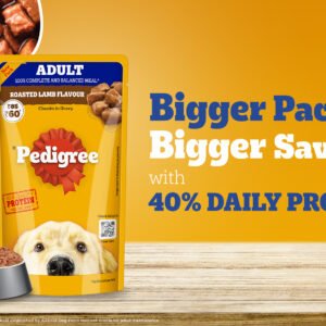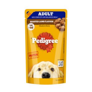 Make every mealtime a fusion of taste and nutrition for your Dog with Pedigree. Made with real meat and high quality protein, Pedigree Adult Wet Dog Food, Roasted Lamb Flavour Chunks in Gravy, ensures that you are providing a meal that keeps your dog happy and supports their well-being. This exciting meal is packed with gravylicious roasted lamb flavour chunks that your furry companion will love. Packed with essential nutrients, it is a 100% complete and balanced meal that provides your dog with all the nutrients to stay healthy and strong. Protein & Calcium support healthy muscles & bones while Dietary Fibre supports a healthy digestive system. Omega 6 and Zinc help keep your dog’s skin and coat healthy. The water content in the meal ensures your dog is well-hydrated. At Pedigree, recipes are developed based on research from the Waltham Centre for Pet Nutrition. Every product from Pedigree meets the requirements laid down by NRC 2006 of the U.S. National Academy of Science. Give your dog the goodness of Pedigree to satisfy their cravings and support their good health.