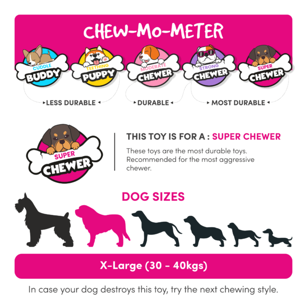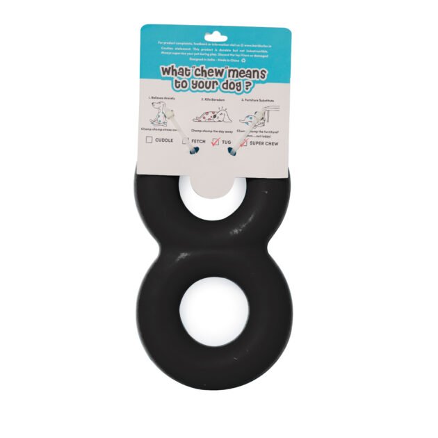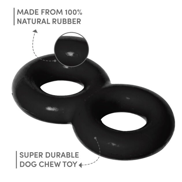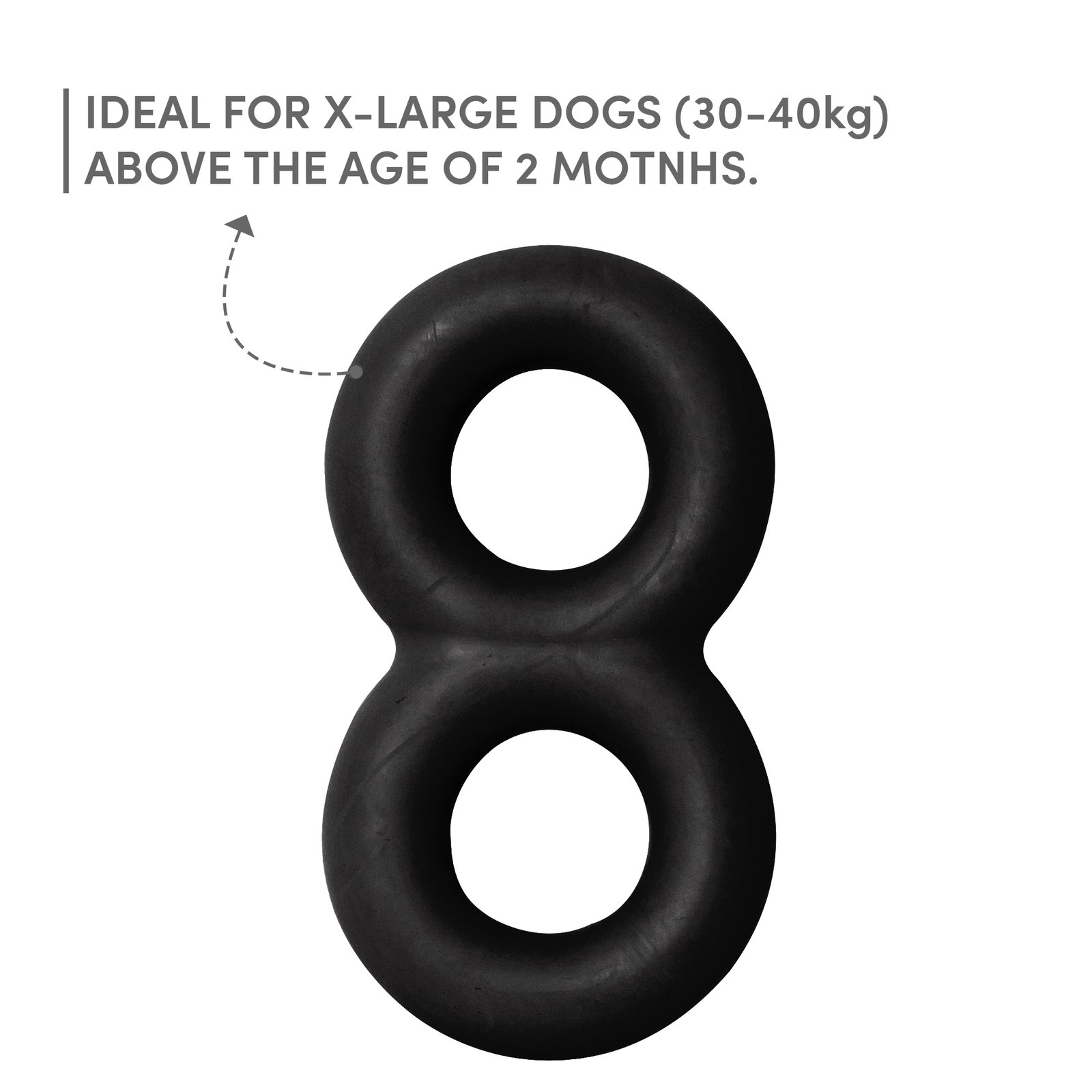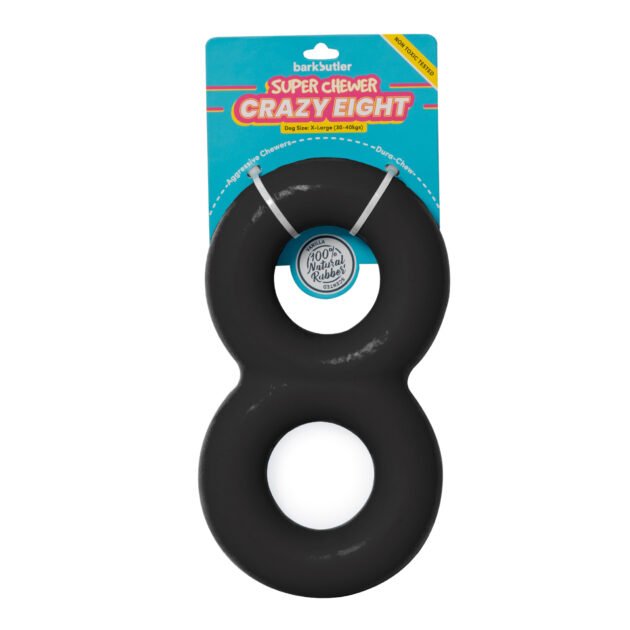 Barkbutler Crazy Eight toy is a durable super chewer dog toy that is long-lasting and is best suited for most aggressive chewers. The tough rubber infinity shape is strategically designed for fun games of tug. It is made from 100% natural rubber. This toy is vanilla scented. Interactive dog toys such as this allow your dog to chew, fetch, tug, and bite on it while getting the right amount of exercise. This toy is ideal for X-Large dogs (30-40kg) of various breeds such as st bernards, labradors, german shepherds, rottweilers, mastiffs etc. This super chew toy is strong and durable but not indestructible and is best suited for pet dogs that have aggressive chewing, fetching and tug playing styles. Recommended for most aggressive chewers.