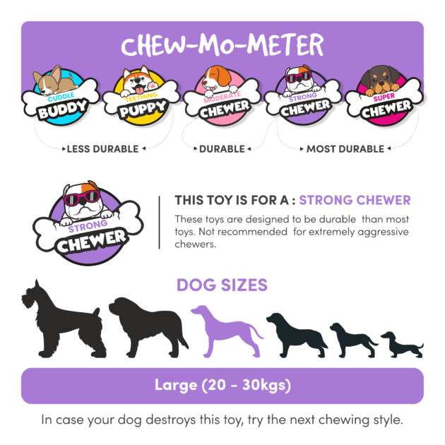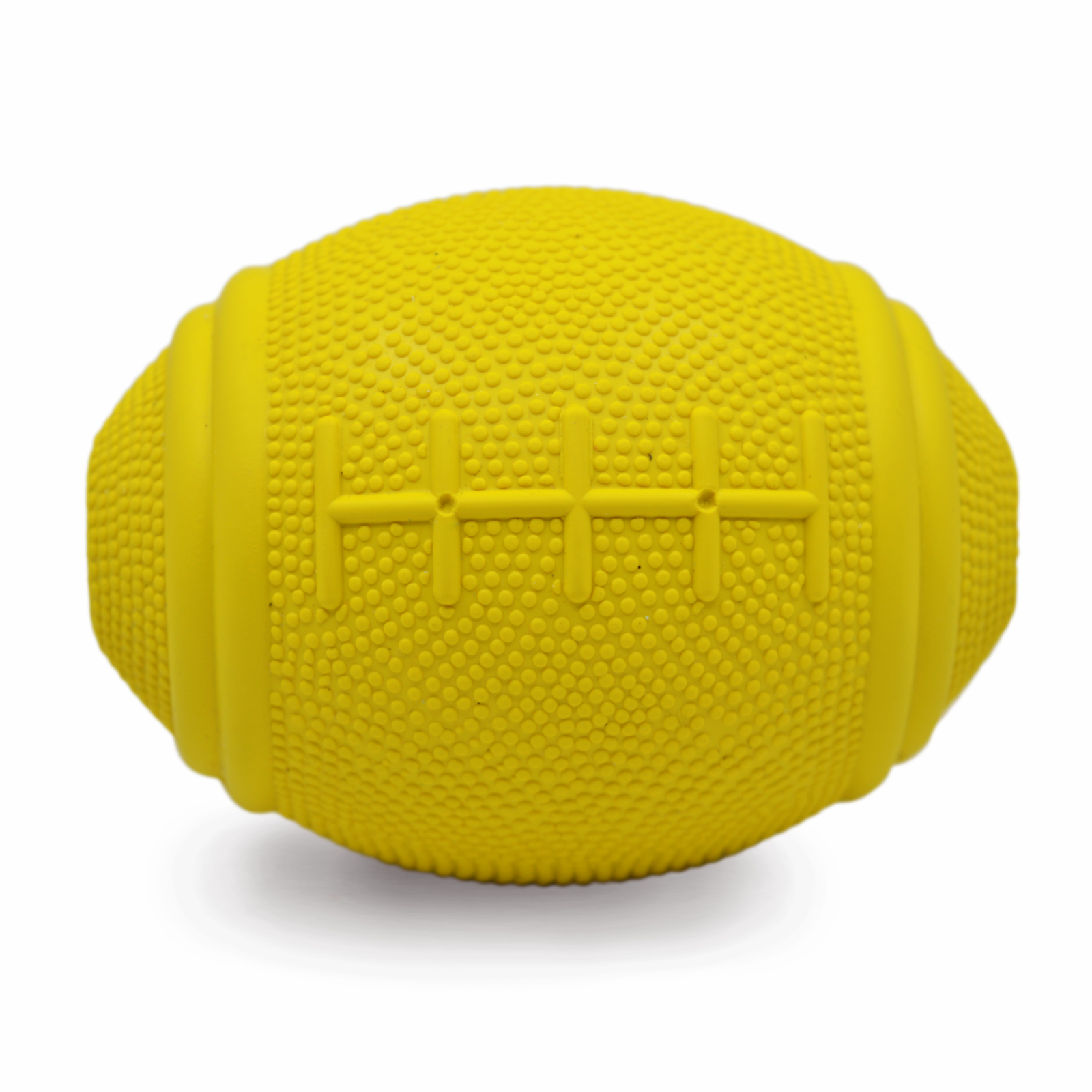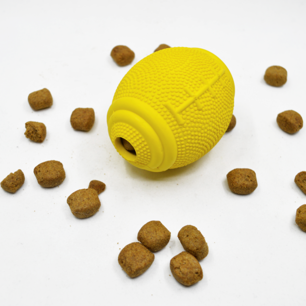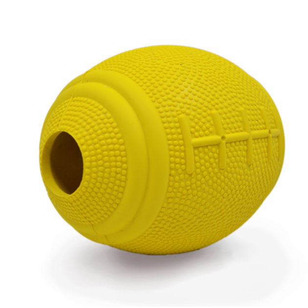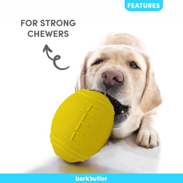 Barkbutler Basics – Just a fooball is a durable dog chew toy made from 100% natural rubber. It has an erratic bounce that makes playtime engaging for your puppy. Ball toys are perfect for a fun game of fetch, chase, and catch. This interactive toy is vanilla scented & treat-dispensing which means you can stuff food or treats inside the toy, keeping your dog busy and get the right amount of exercise. Fetching toys such as these are ideal for large dogs (20-30kg) of breeds such as Lab, Golden Retriever, German shepherd, Husky, etc. This toy is strong but not indestructible and is best suited for pet dogs that have aggressive chewing and fetch playing styles. Not recommended for extremely aggressive chewers.