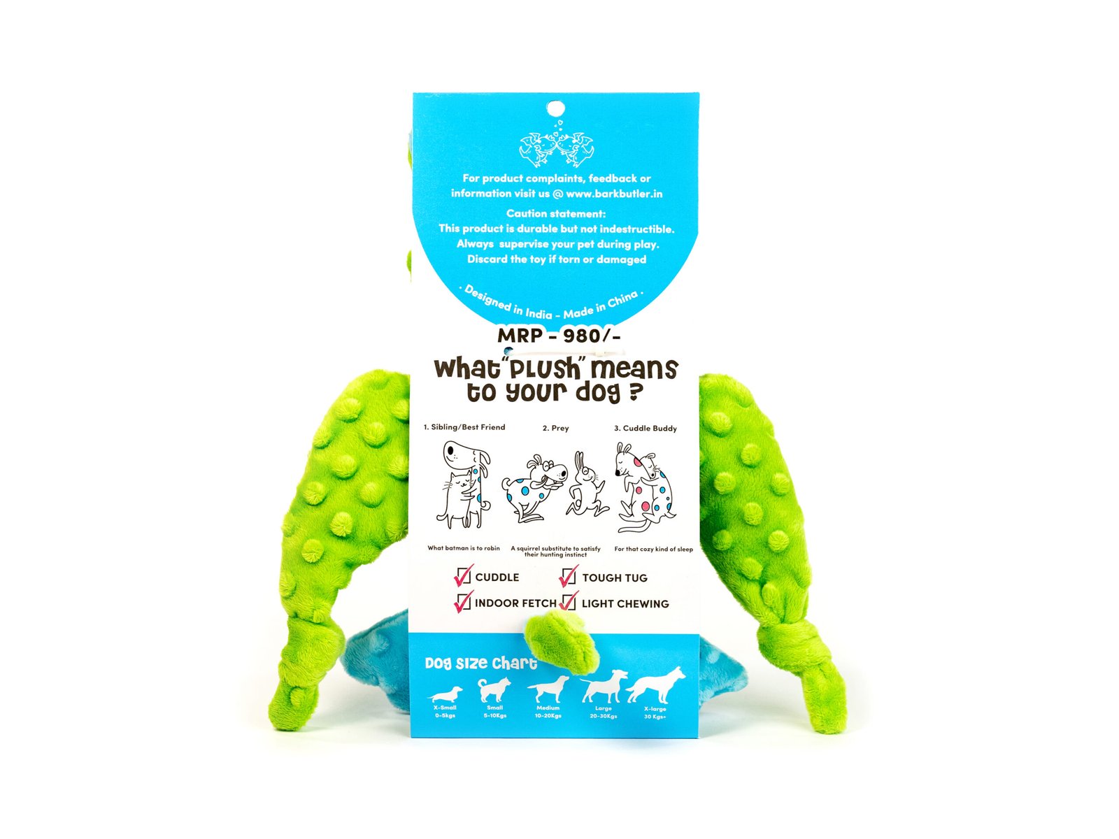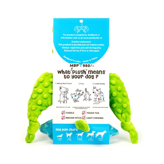 Let Pookie help your puppy get ready to deal in case of a dragon invasion, unfortunately, he doesn’t respond to the command ‘Dracarys’ but he will command your dog’s attention! Just like all our plushes, this super-soft bumpy plush comes with krinkle paper, two squeakers and also two sizes. Playing Styles: Cuddle, Tug, Indoor Fetch, chew toy. Pookie works best with Medium (10-20kgs) & Large (20-30kgs) sized dogs.