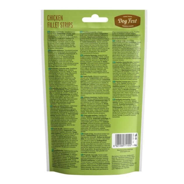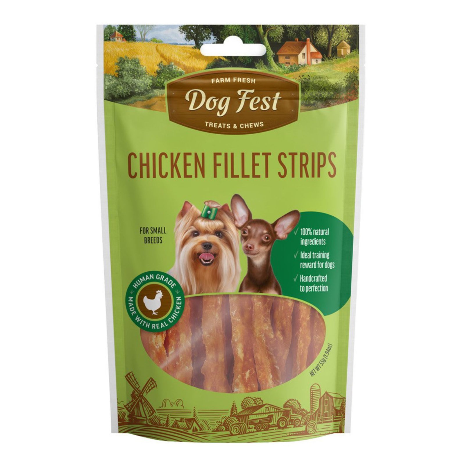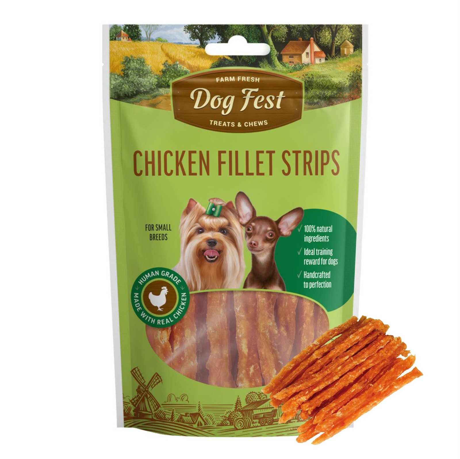 Dogfest Chicken fillet strips small dog breed treats are the perfect snack for your furry friend. Made with 100% natural and healthy ingredients, these treats are free from artificial flavors, colors, and preservatives. Our human-grade meat is sourced directly from farms and is the first ingredient, high in protein to provide your dog with energy. Ancestral to dogs, Chicken is a tasty treat that will make your pet feel like royalty. Recommended for all small dog breeds, from Shih Tzus to beagles, these soft, chewy treats are perfect for smaller dog breeds. Find the best, imported, premium, and dried dog treats that are healthy, natural, and delicious.