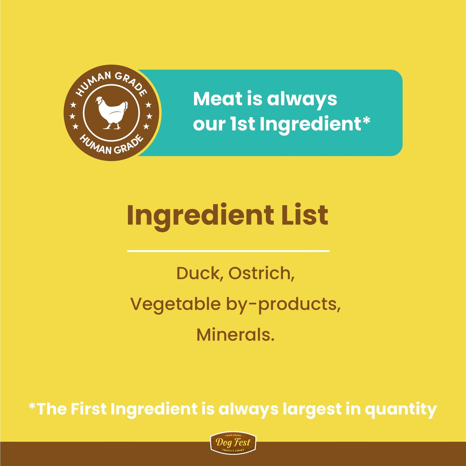 Dogfest Meat sticks duck & ostrich adult dog treats are the perfect snack for your furry friend. Made with 100% natural and healthy ingredients, these treats are free from artificial flavors, colors, and preservatives. Our human-grade meat is sourced directly from farms and is the first ingredient, high in protein to provide your dog with energy. Ancestral to dogs, duck & ostrich are tasty treats that will make your pet feel like royalty. Recommended for all adult dog breeds, from Shih Tzus to rottweilers, these soft, chewy treats are perfect for adult dog breeds. Find the best, imported, premium, and dried dog treats that are healthy, natural, and delicious.
