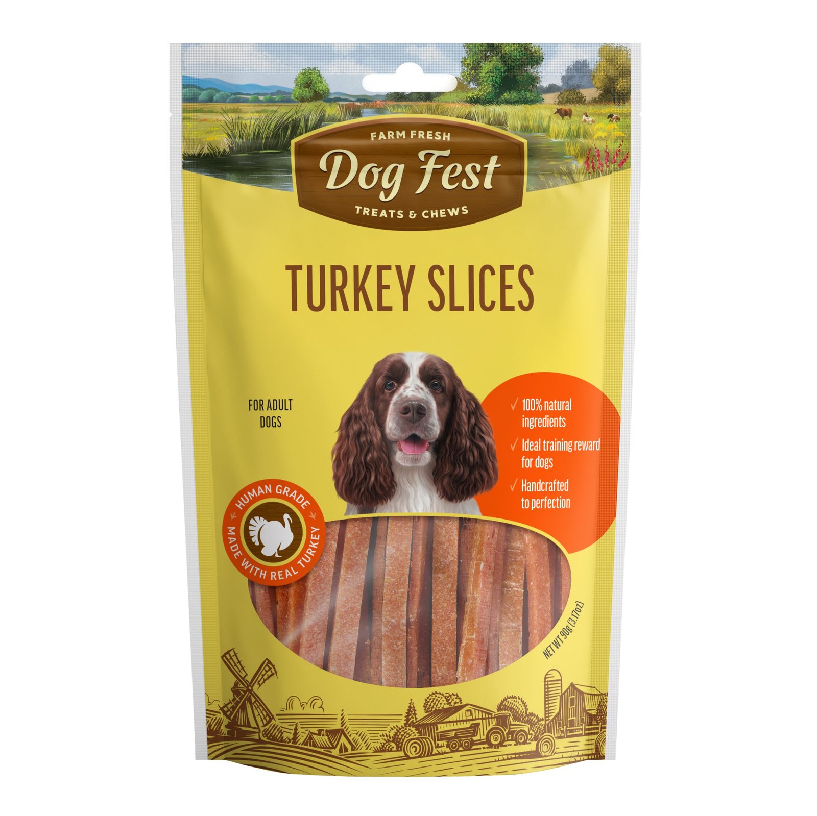 Dogfest Turkey slices adult dog treats are the perfect snack for your furry friend. Made with 100% natural and healthy ingredients, these treats are free from artificial flavors, colors, and preservatives. Our human-grade meat is sourced directly from farms and is the first ingredient, high in protein to provide your dog with energy. Ancestral to dogs, turkey is a tasty treat that will make your pet feel like royalty. Recommended for all adult dog breeds, from Shih Tzus to rottweilers, these soft, chewy treats are perfect for adult dog breeds. Find the best, imported, premium, and dried dog treats that are healthy, natural, and delicious.