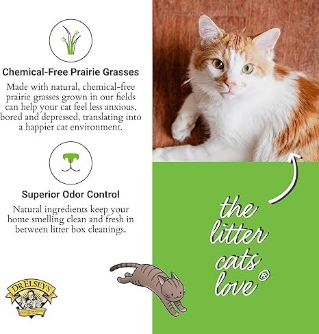 Bring the outdoor experience inside with Touch of Outdoors — made with prairie grass, using natural chlorophyll for odor control. Do you have a cat that wants to go outside or are you looking to enrich your cat’s environment? You may have observed stress behaviors like pacing, scratching furniture or rugs, aggression, increased vocalization, excessive grooming or urine marking. Touch of Outdoors with natural, chemical-free prairie grasses grown in our fields can help your cat feel less anxious, bored and depressed, translating into a happier cat environment. |