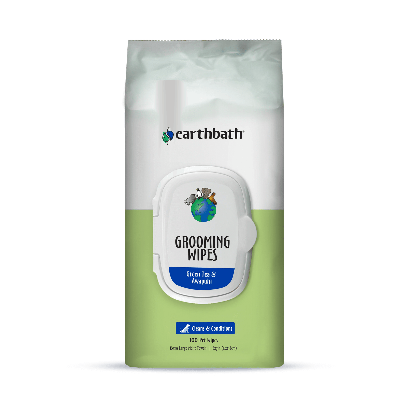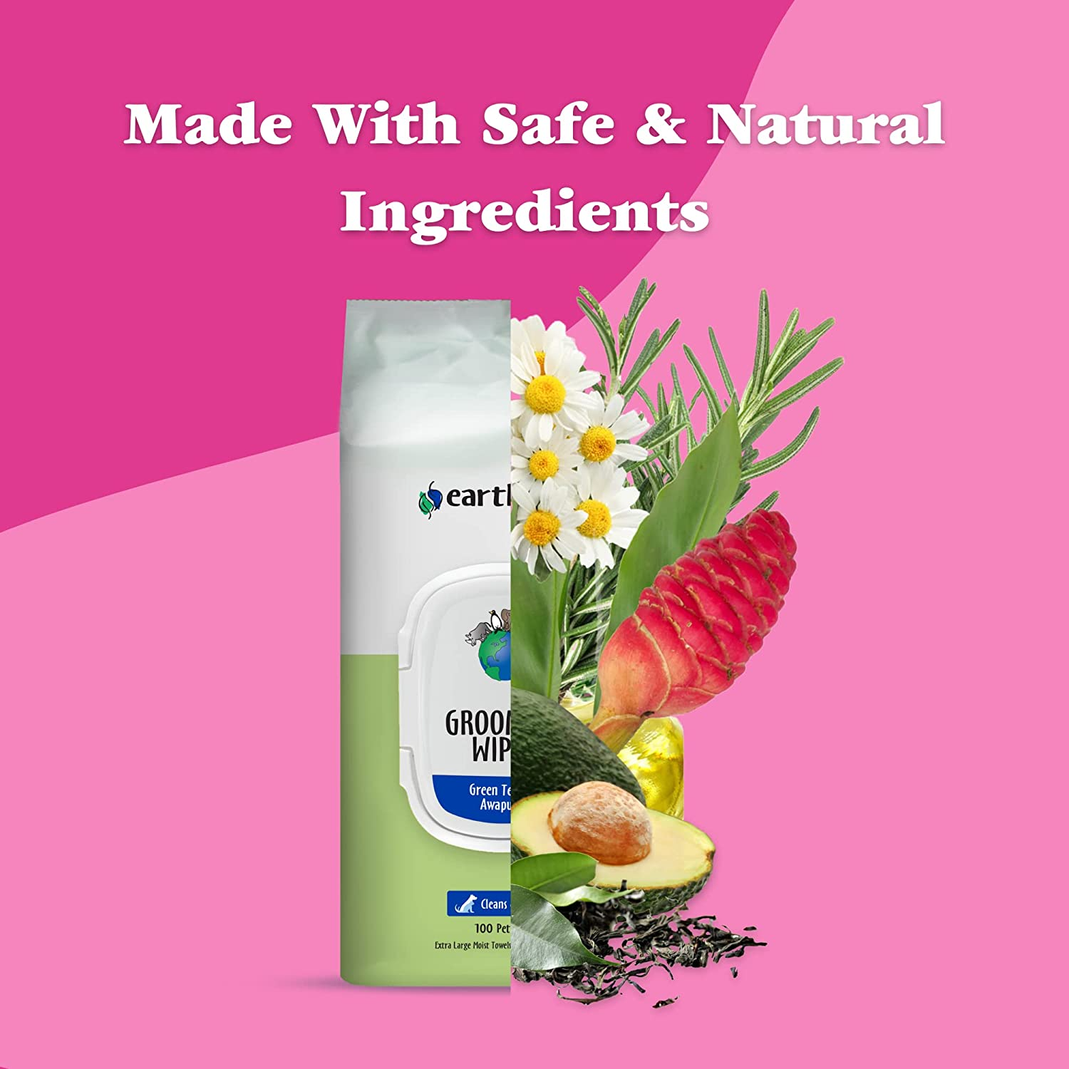 “earthbath Green Tea & Awapuhi Plant Based Grooming Wipes safely & easily wipes away your pets’ dirty paws & undercoat, removes dander, drool, discharge & cling-ons.