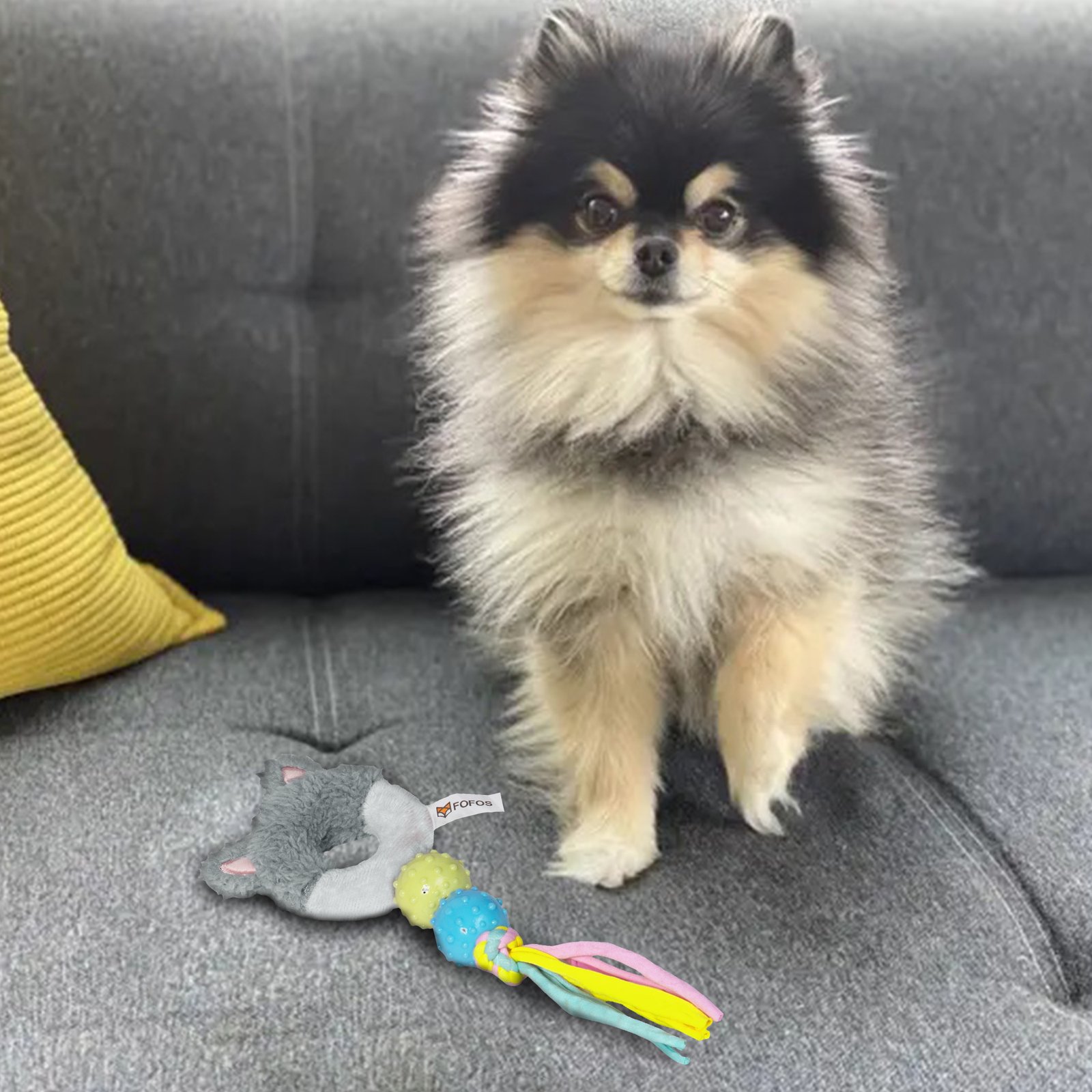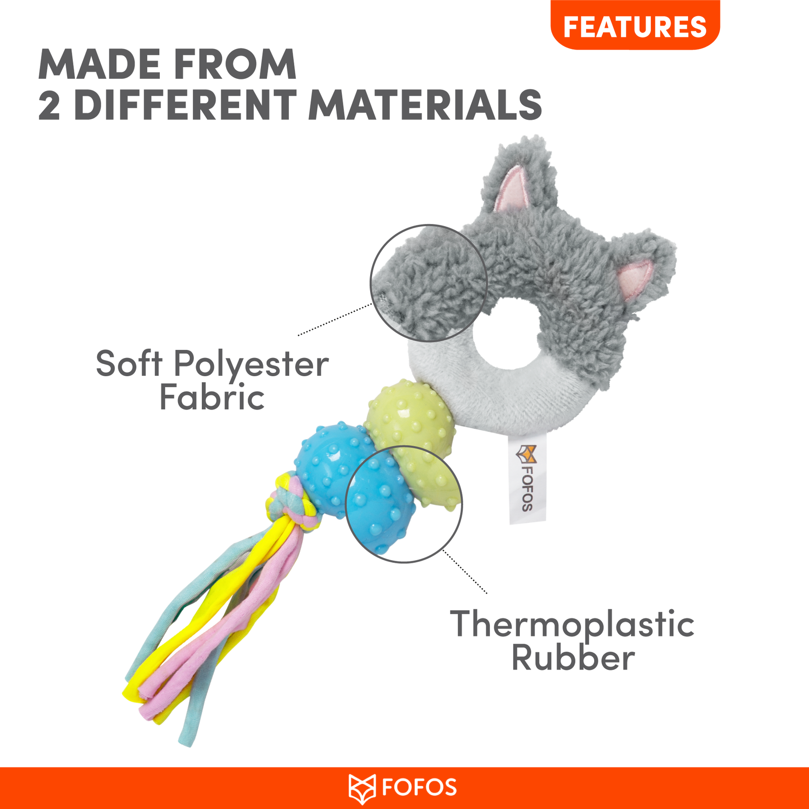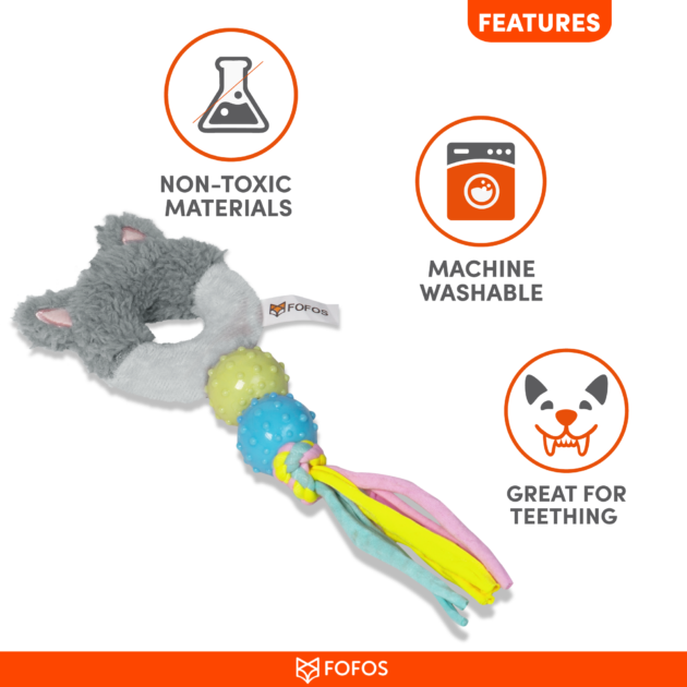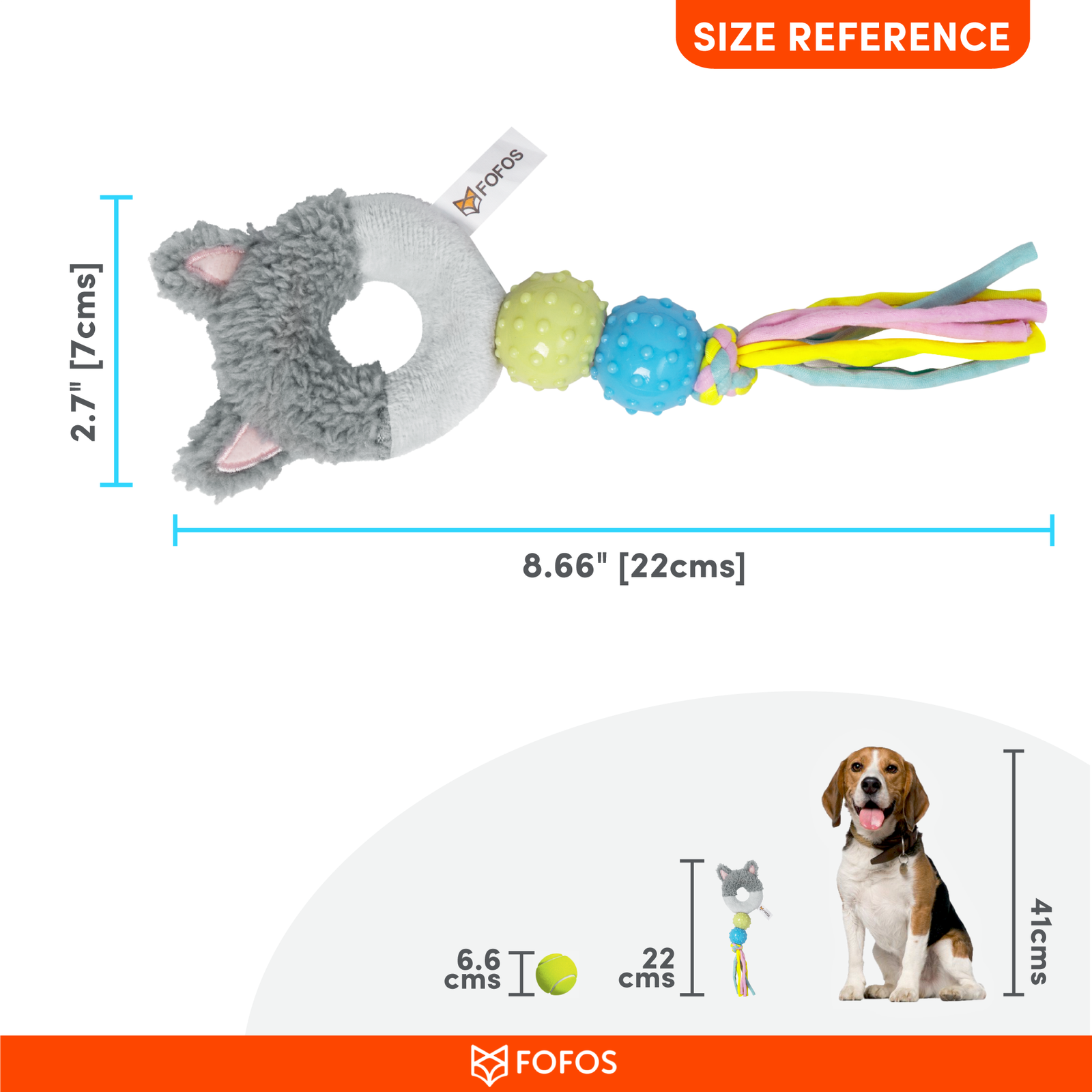 Fofos Babypet cat is a dog toy that helps soothe teething pain in puppies while being gentle on the gums.This toy comes with minimal stuffing and is made from a combination of 3 different materials to make playtime interactive for your dog. It is a perfect playmate for chewers who enjoy a fun game of tug. This chew toy is made from soft polyester fabric + TPR. and is machine washable. Engaging dog toys such as this allow your dog to chew, fetch, tug and bite on them while getting the right amount of exercise. This toy is ideal for x-small-small puppies (0-10kg) of various breeds such as dachshund, pom, spitz, Shih Tzu, pug, beagle, labrador, etc. Teething toys are soft and designed specifically to help soothe teething pain in puppies’ gums. It is a set of strong but not indestructible toys and is best suited for pet dogs that are teething, and have a chew, tugging, indoor fetch and cuddle playing style. Not recommended for dogs with adult teeth or aggressive chewers.