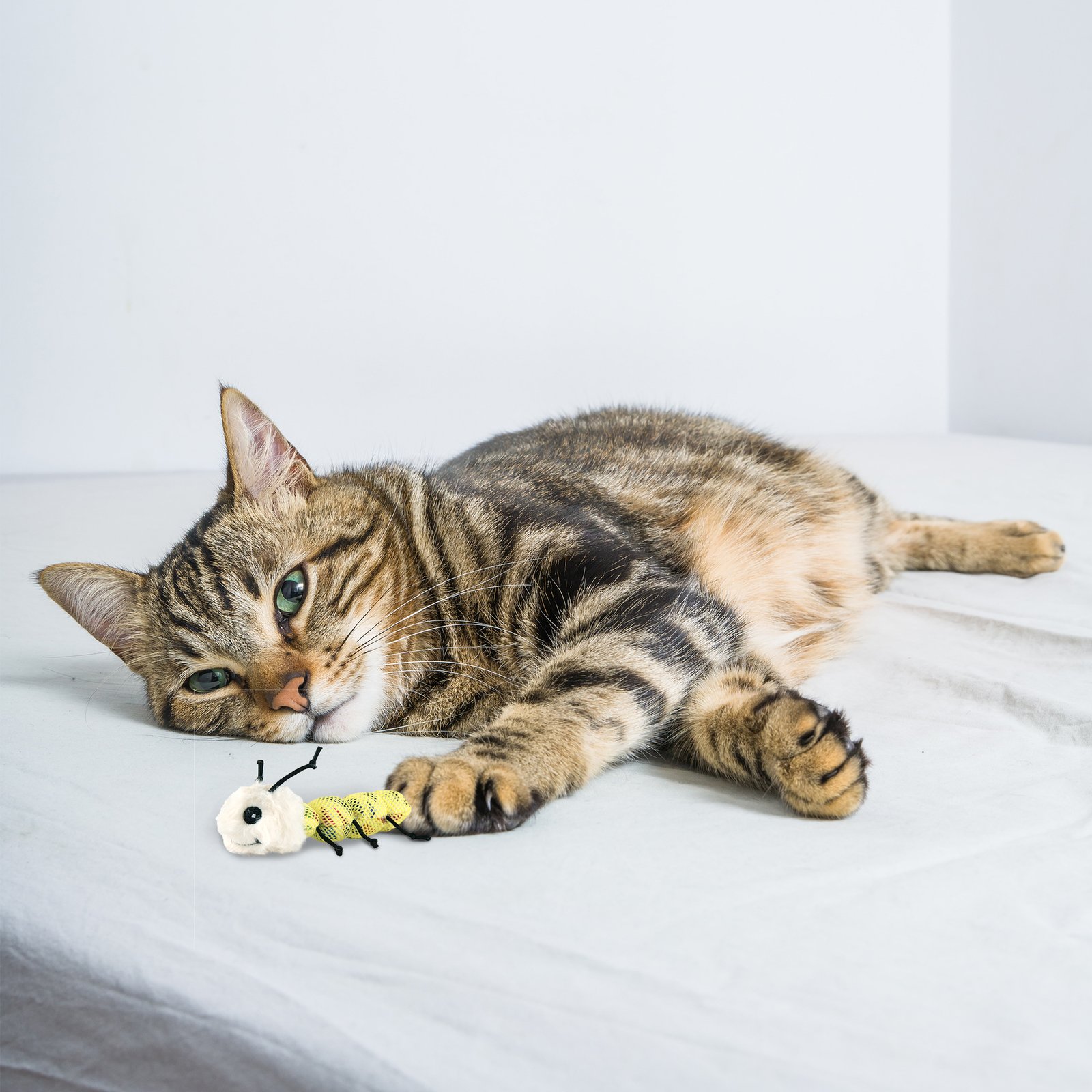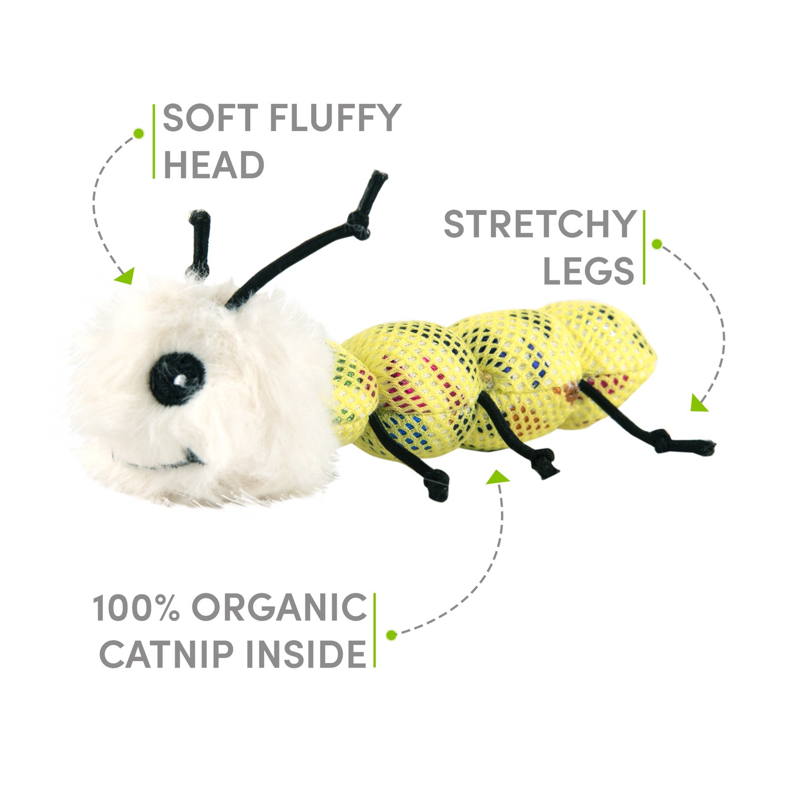 Catnip is a plant related to mint and contains an essential oil called nepetalactone that is known to cause euphoric, calming, and relaxing effects on cats. Catnip in small doses is completely safe, non-addictive for your kitten as the effects last about 10 mins for most cats. Fofos blocky Meow Worm is a cute cat playing toy filled with imported US grade dried catnip leaves and grass powder. The fun stretchy legs, bead shaped body and fur of this interactive toy allows your cat to chew, swat, nip, play, and even promotes harmless biting and scratching and soothes the gums for teething kittens. Fun engaging cat toys give your cat a mouse chase-like feeling ensuring good physical stimulation while the catnips give them a calm and relaxing experience. Ideal for small pet kittens as well as for older cats of Persian and other breeds as well. How to use: For maximum utility allow playtime for 30mins a day, then take away and repeat the following day.