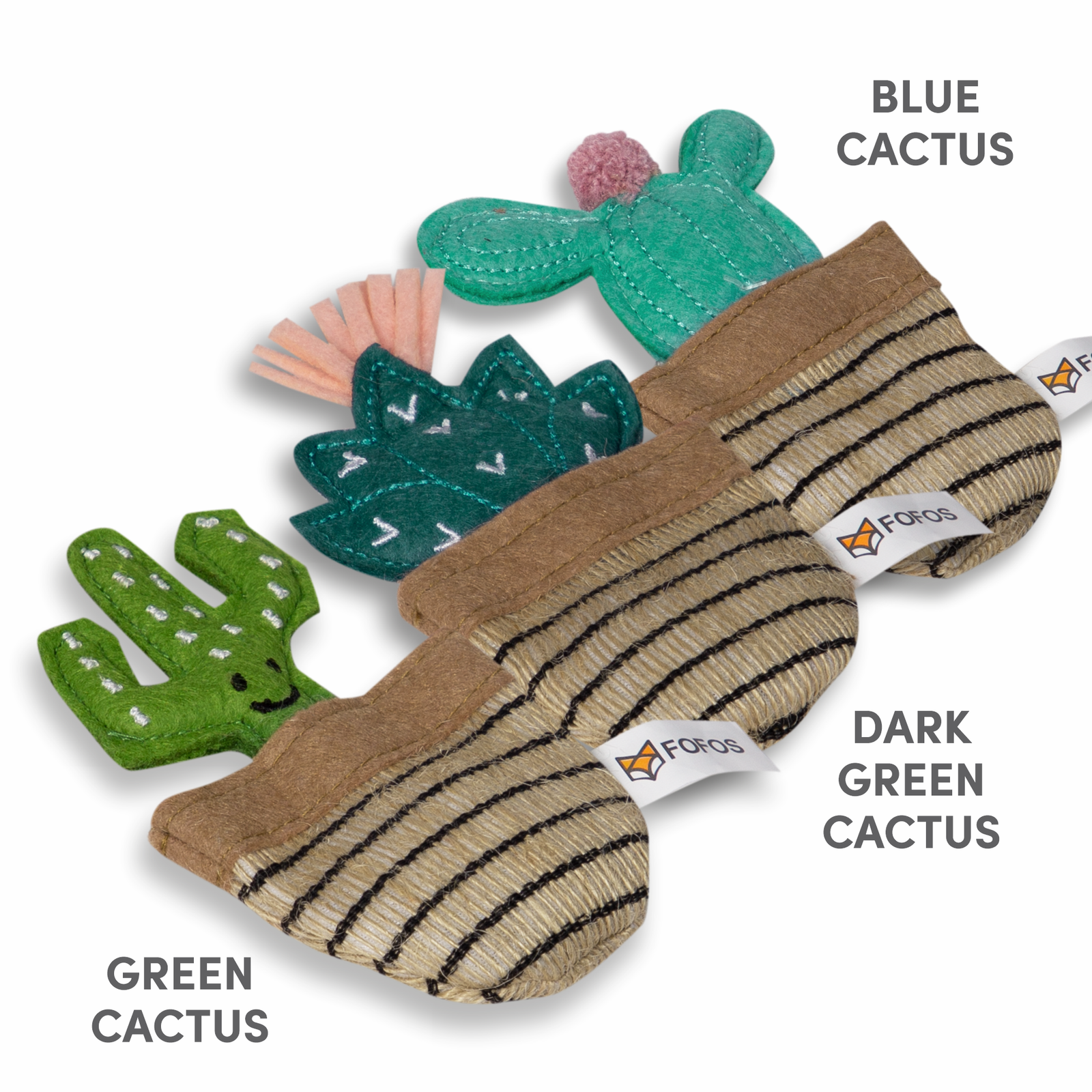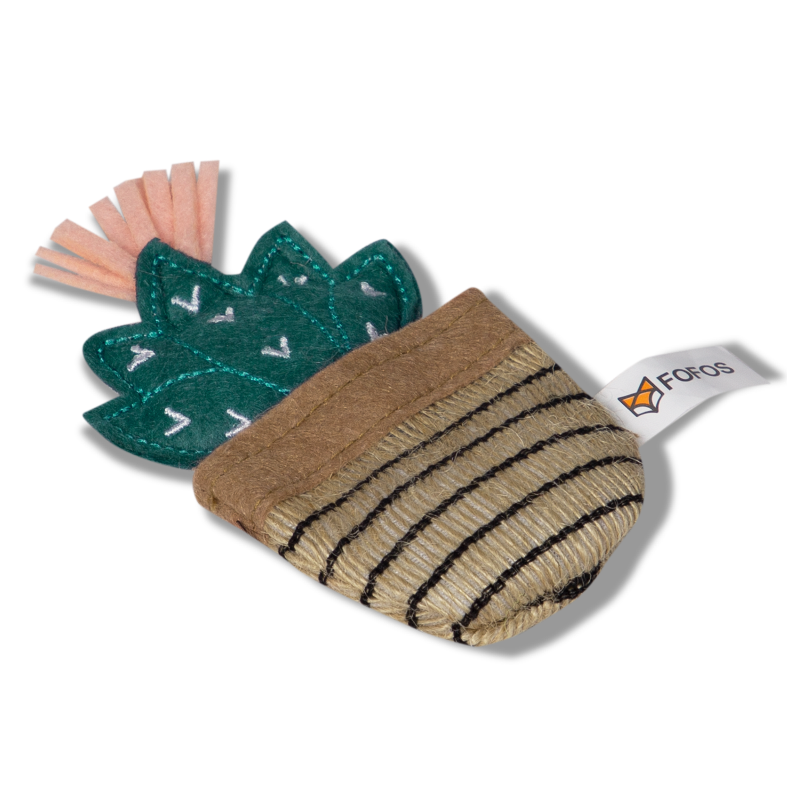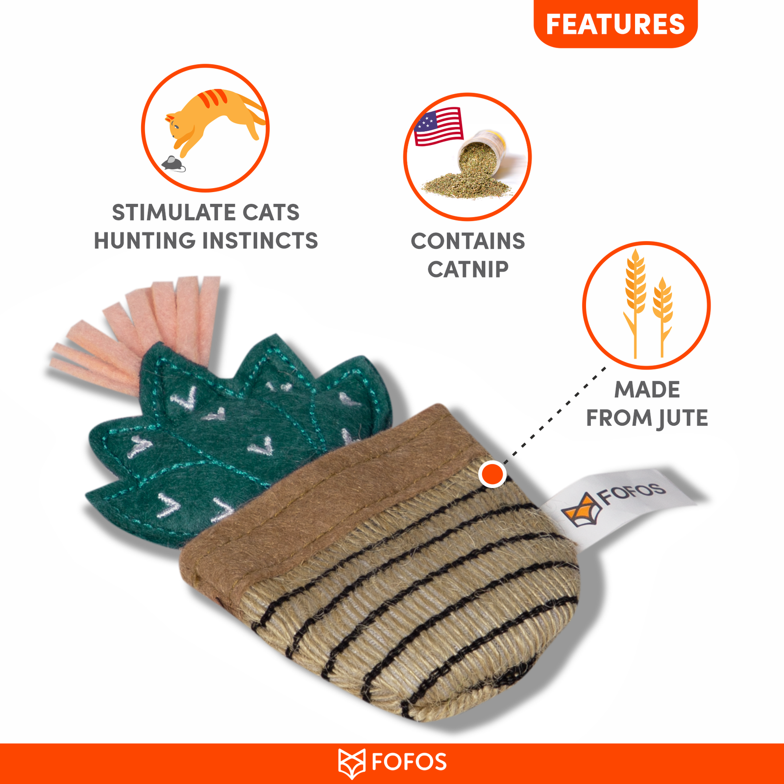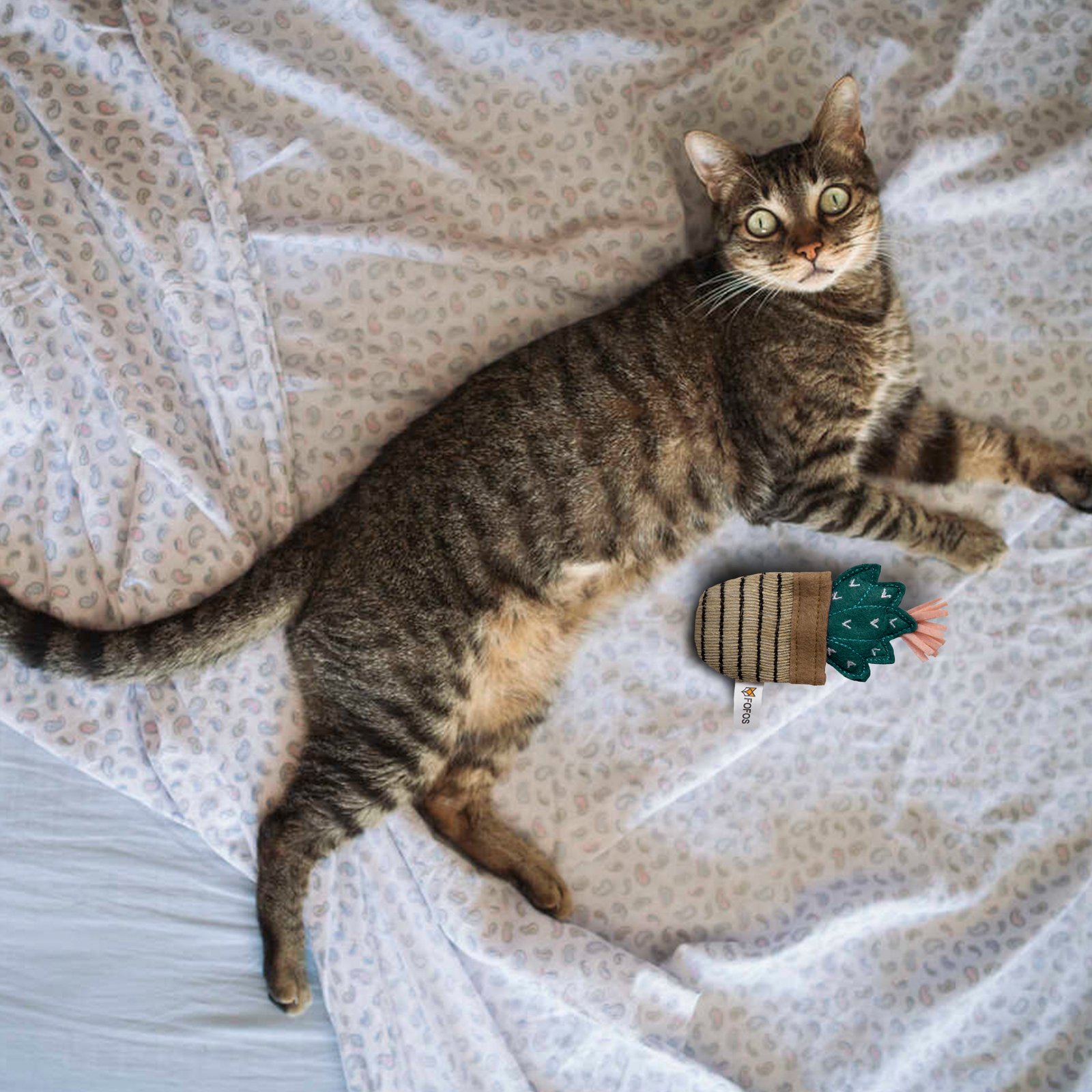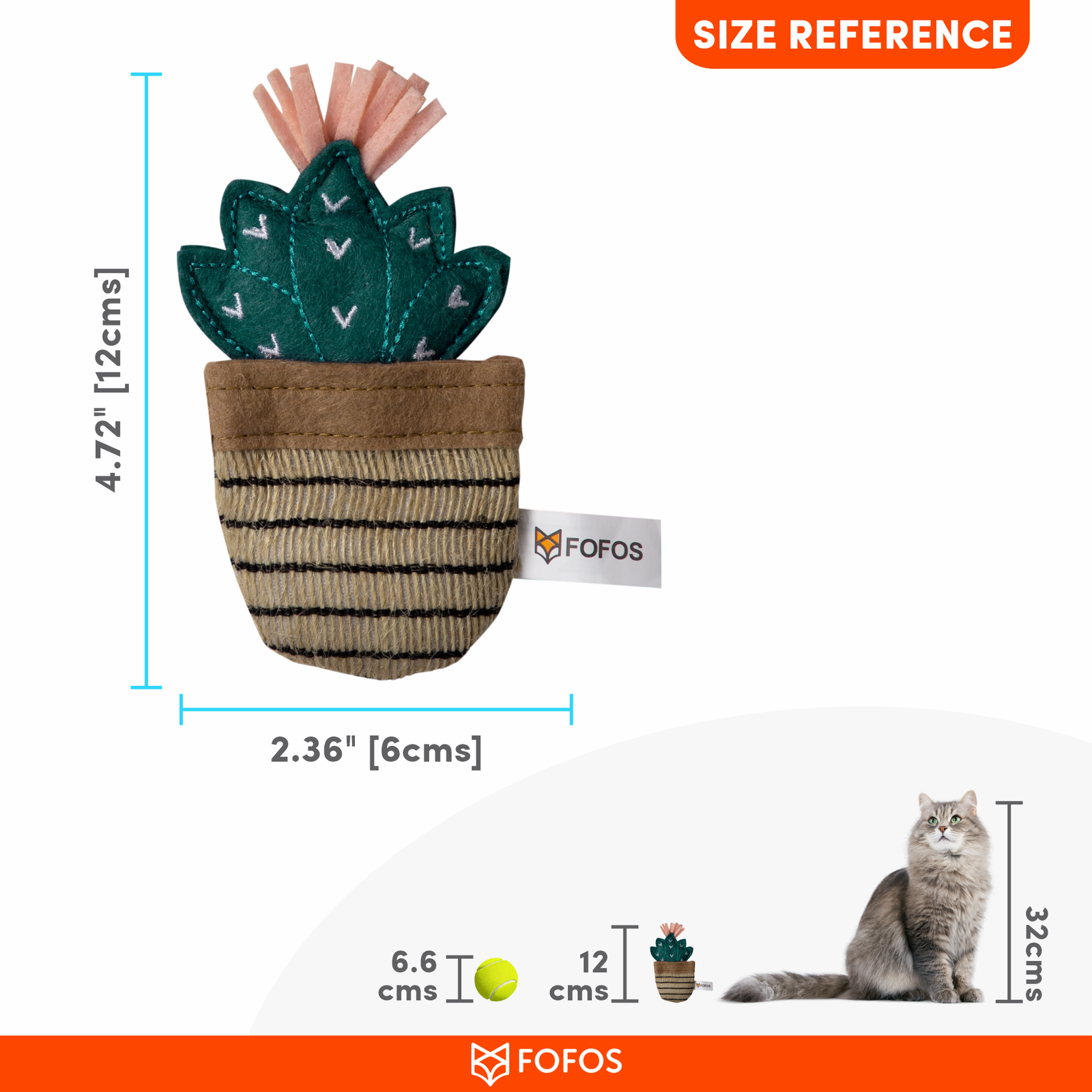 Catnip is a plant related to mint and contains an essential oil called nepetalactone that is known to cause euphoric, calming, and relaxing effects on cats. Catnip in small doses is completely safe, non-addictive for your kitten as the effects last about 10 mins for most cats. Fofos Dark Green Cactus is a cute cat playing toy filled with imported US grade catnip dried leaves and grass powder. This interactive toy allows your cat to chew, swat, nip, play, and even promotes harmless biting and scratching. Fun engaging cat toys give your cat a mouse chase-like feeling ensuring good physical stimulation while the catnips give them a calm and relaxing experience. Ideal for small pet kittens above 6 months of age as well as for older cats of Persian and other breeds as well. How to use: For maximum utility allow playtime for 30mins a day, then take away and repeat the following day.