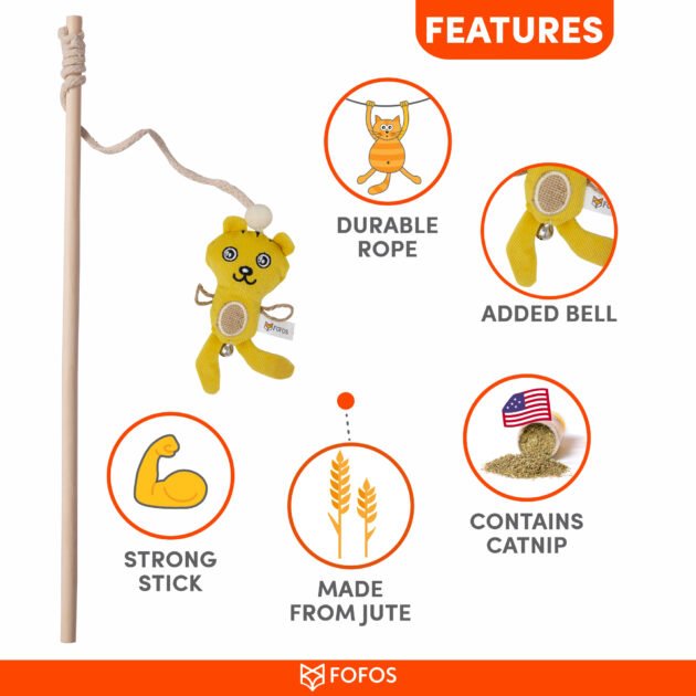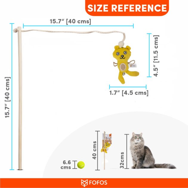 Fofos Cat Wand Tiger is a fun plush cat teaser toy with a bell and imported US grade dried catnip leaves and grass powder inside. A durable wooden stick and robust rope is attached to it. This catnip toy is a combination of durable wood and soft fabrics. Interactive toys are known to unleash a kitten’s natural desire to hunt, chase, play, chew, swat and even promote harmless biting and scratching. This catnip toy is shaped like a bunny and helps your cat pursue its true instinctive behaviour and is a great confidence builder especially for cats with anxiety. Kitten teaser toys are the best way to exercise your cat and keep them alert. Fun engaging cat toys give your cat a mouse or a ball chase-like feeling ensuring good physical stimulation while the catnips give them a calm and relaxing experience. Ideal for small pet kittens as well as for older cats of Persian and other breeds as well. How to use: We recommend consistent and scheduled playtime. Start with five-minute a day sessions. Just like a dog needs a walk, a cat needs playtime! What is Catnip: Catnip is a plant related to mint and contains an essential oil called nepetalactone that is known to cause euphoric, calming, and relaxing effects on cats. Catnip in small doses is completely safe, non-addictive for your kitten as the effects last about 10 mins for most cats.