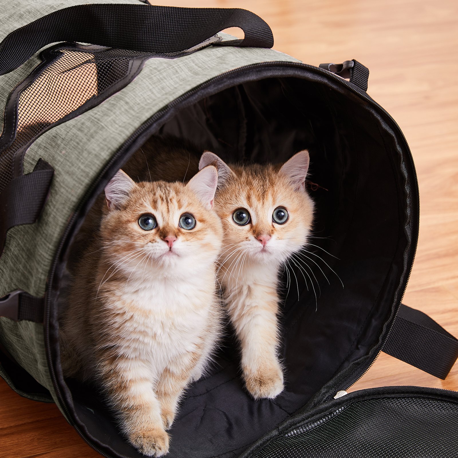 Soft-sided pet carrier with an anti-scratch breathable mesh window, fabric for maximum airflow/ventilation and vision. The bottom has a removable soft-padded base with a machine washable cover that acts like a cushion allowing your pet to rest with ease while travelling. are added for ease of use. This pet carrier has a 3 stage collapsible structure. It can be completely collapsed for easy storage and travel, It can be partially collapsed for carrying your pet conveniently and at full height, it can be opened on both sides and can be used as a tunnel toy to keep your pet engaged. It can be easily folded to fit in your car or suitcase making it convenient to travel with. 2 outer storage pockets are provided to hold food, treats, toys etc. This lightweight carrier has a durable ABS plastic leash and rubber gripped zippers for extra security. It provides a cosy and restful environment for your pet and reduces stress and anxiety travel. To choose the right carrier for your pet measure your pet’s length from neck to base of the tail (L), height from floor to top of the shoulder (H) and width (B) Carrier dimensions :L = x B = x H = in Max pet dimensions L = 13 x B = 13 X H = 13IN Max weight capacity of 12 kgs This will ensure enough support and room for your pet to stretch and get comfortable. This pet carrier is suitable for fitting into large bicycle baskets, road travel, trips to the vet/groomer, outdoor events etc