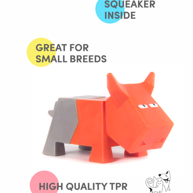 This ox rocks! If your dog is a nibbler, don’t think twice. This toy keeps hyper-active dogs busy as its inviting texture gives them something to do- chew. This squeaky toy for dogs squeaks when thrown, bitten into or pounced upon. Made from non-toxic Thermoplastic Rubber.