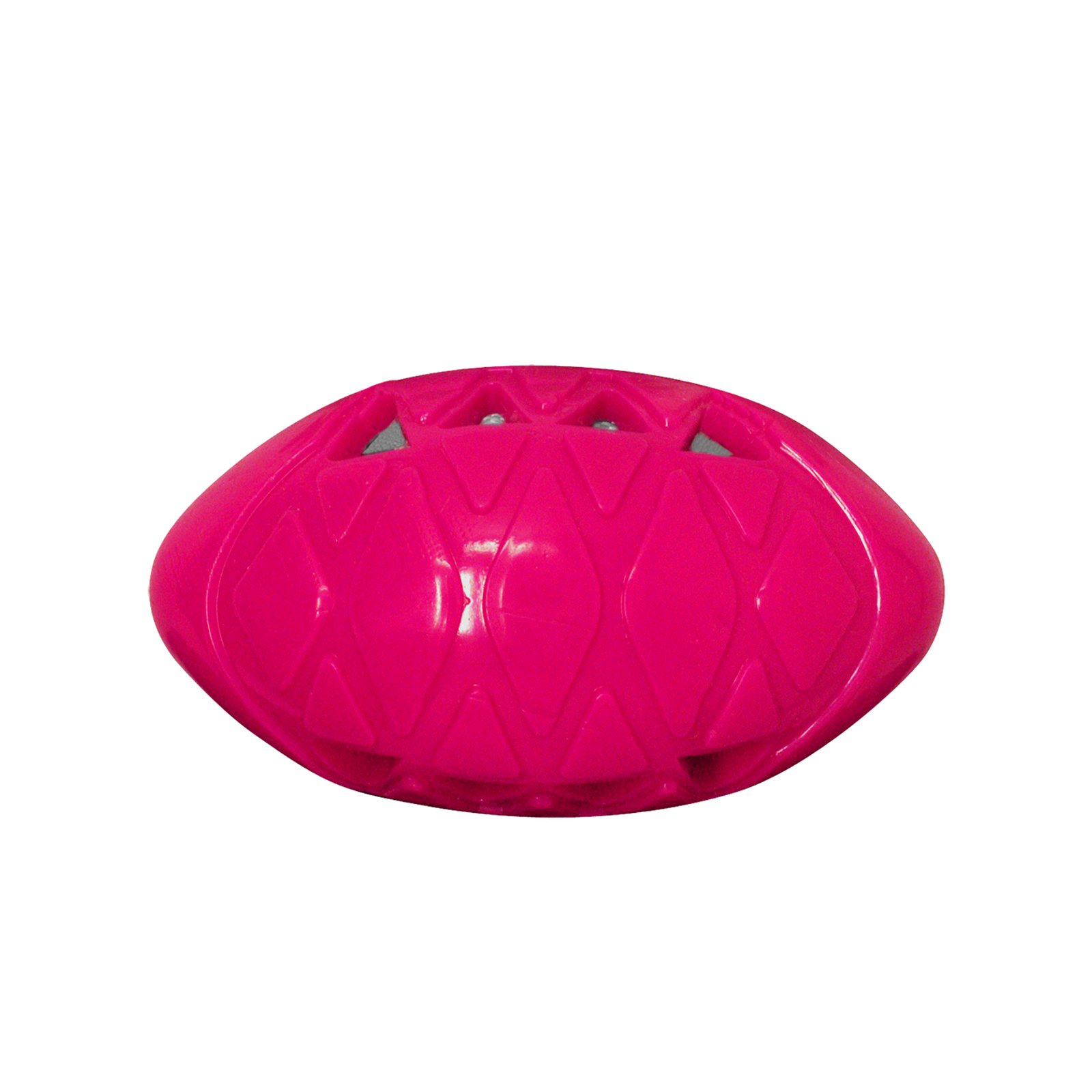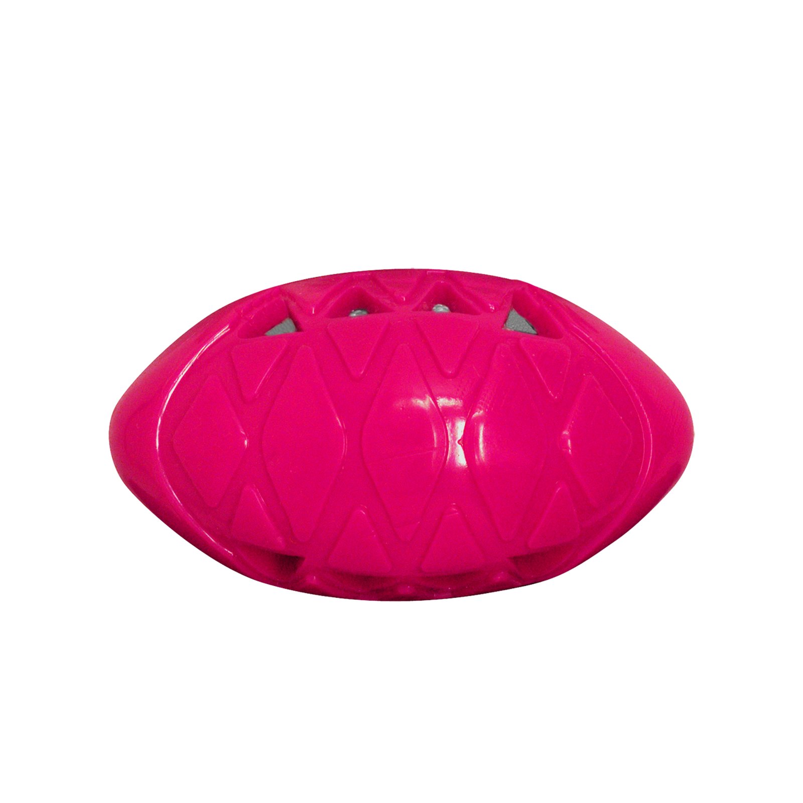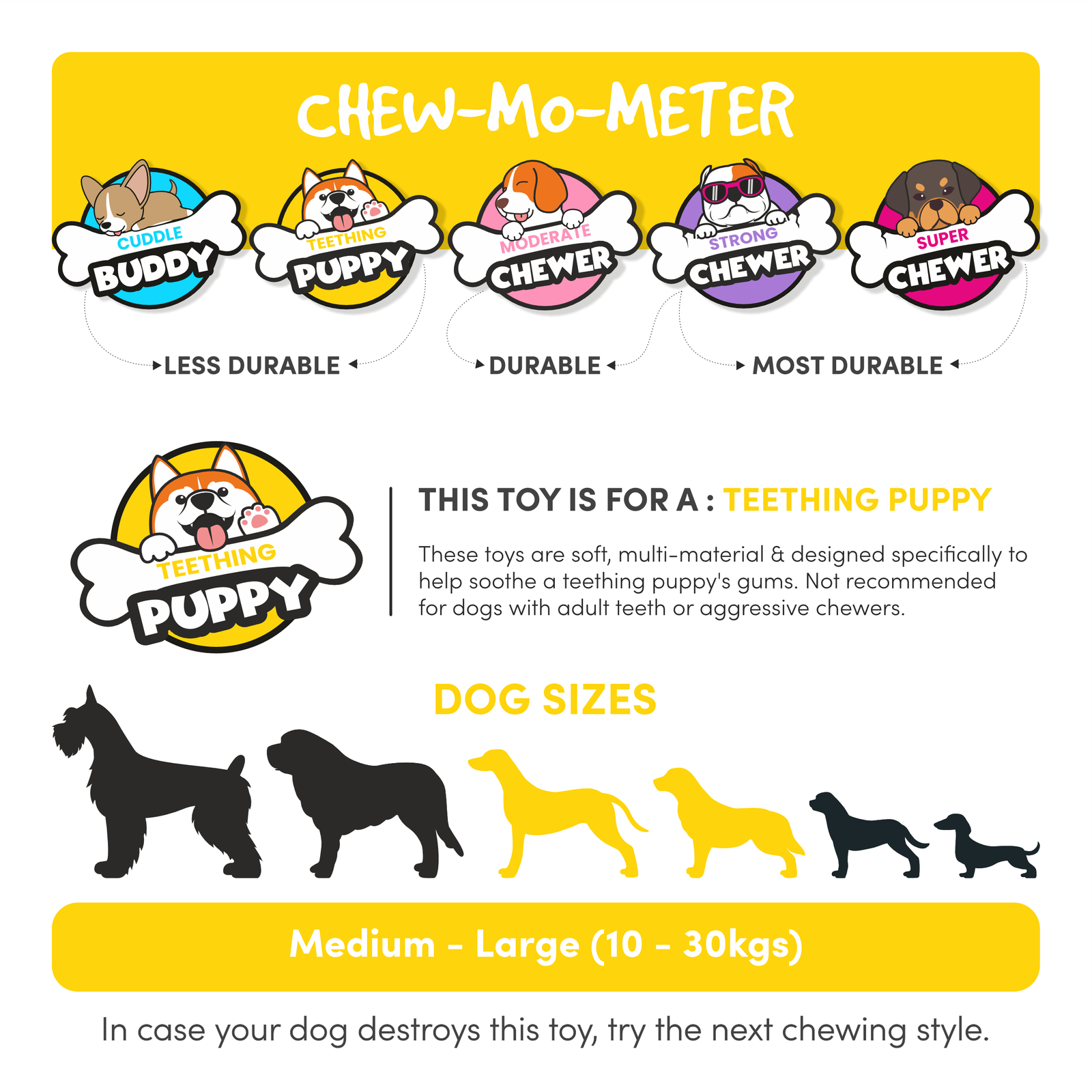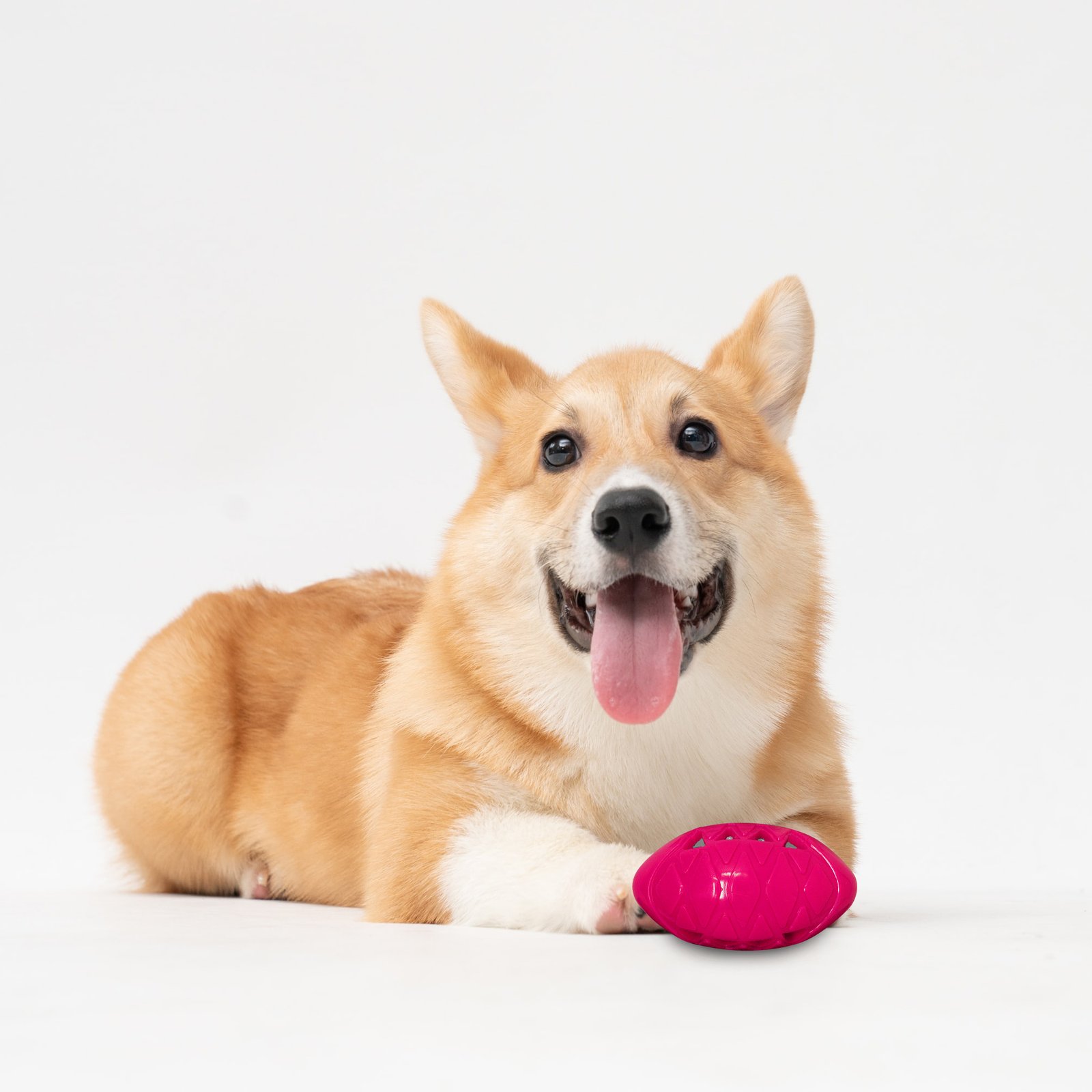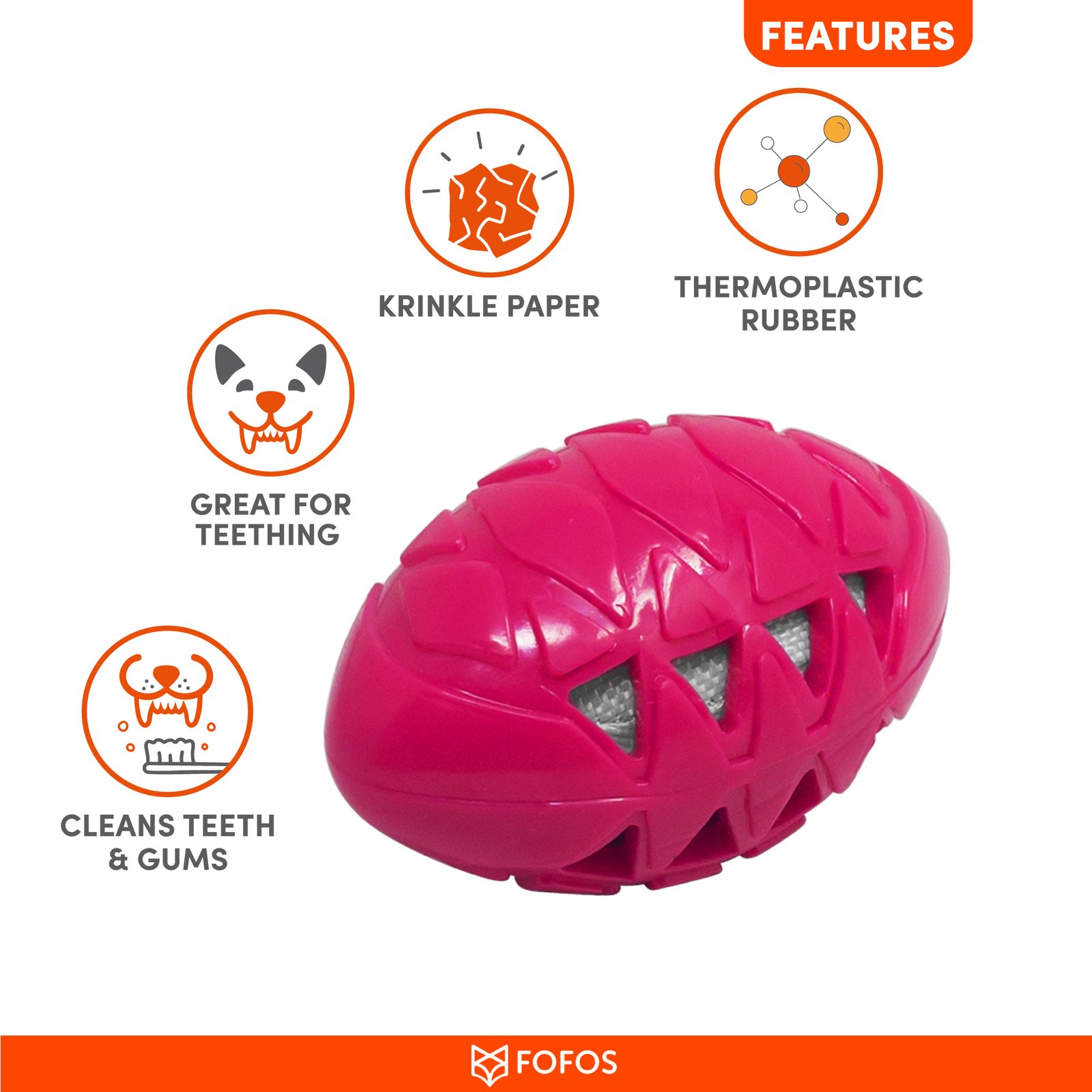 Fofos Crunch Football L is a durable dog toy that has a squeaker inside that generates a squeaky noise to get your dog’s attention. The krinkle paper inside the ball is provided to soothe teething pain in puppies. It has a soft and bumpy texture designed to be gentle on your dog’s teeth and helps massage the gums. This teething toy is made from high-quality TPR material, The soft texture makes this dog toy durable for interactive playing, biting and chewing. Engaging dog toys such as this allow your dog to play chew, fetch and bite on it while getting the right amount of exercise. This toy is ideal for Medium-large (10 – 30kg) of various breeds such as beagle, dachshund, labrador etc.. Teething toys are soft and designed specifically to help soothe teething pain in puppies’ gums. This toy is strong but not indestructible and is best suited for pet dogs that are teething, and have a chew and fetch playing style. Not recommended for dogs with adult teeth or aggressive chewers.