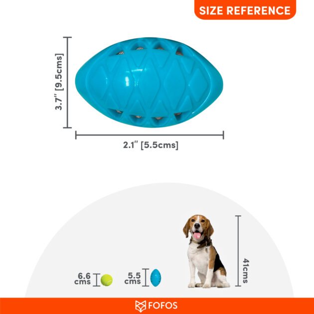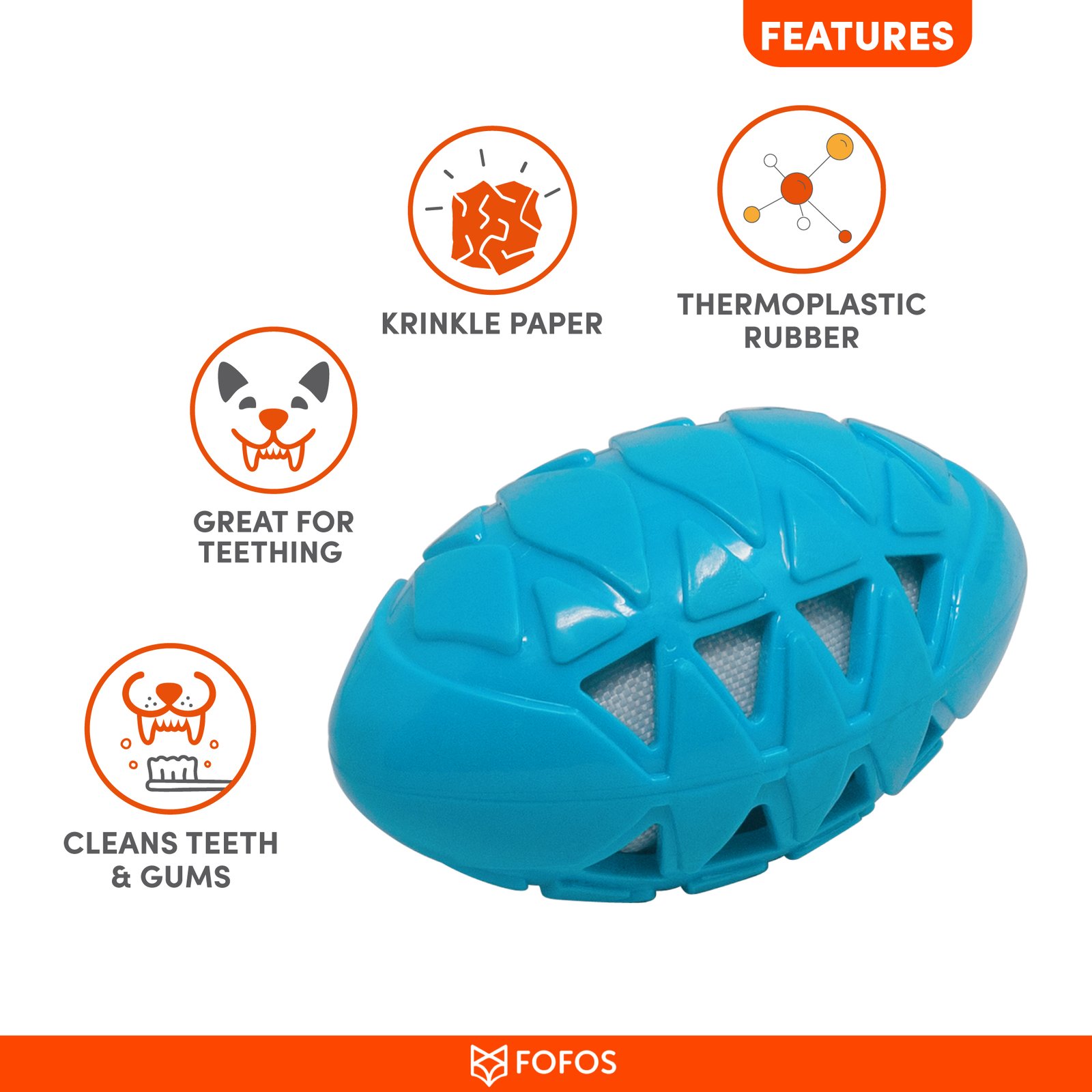 Fofos Crunch Football S is a durable dog toy that has a squeaker inside that generates a squeaky noise to get your dog’s attention. The krinkle paper inside the ball is provided to soothe teething pain in puppies. It has a soft and bumpy texture designed to be gentle on your dog’s teeth and helps massage the gums. This teething toy is made from high-quality TPR material, The soft texture makes this dog toy durable for interactive playing, biting and chewing. Engaging dog toys such as this allow your dog to play chew, fetch and bite on it while getting the right amount of exercise. This toy is ideal for X-small – Small (0 – 10kg) of various breeds such as spitz, shih-tzu, pom, pug etc. Teething toys are soft and designed specifically to help soothe teething pain in puppies’ gums. This toy is strong but not indestructible and is best suited for pet dogs that are teething, and have a chew and fetch playing style. Not recommended for dogs with adult teeth or aggressive chewers.