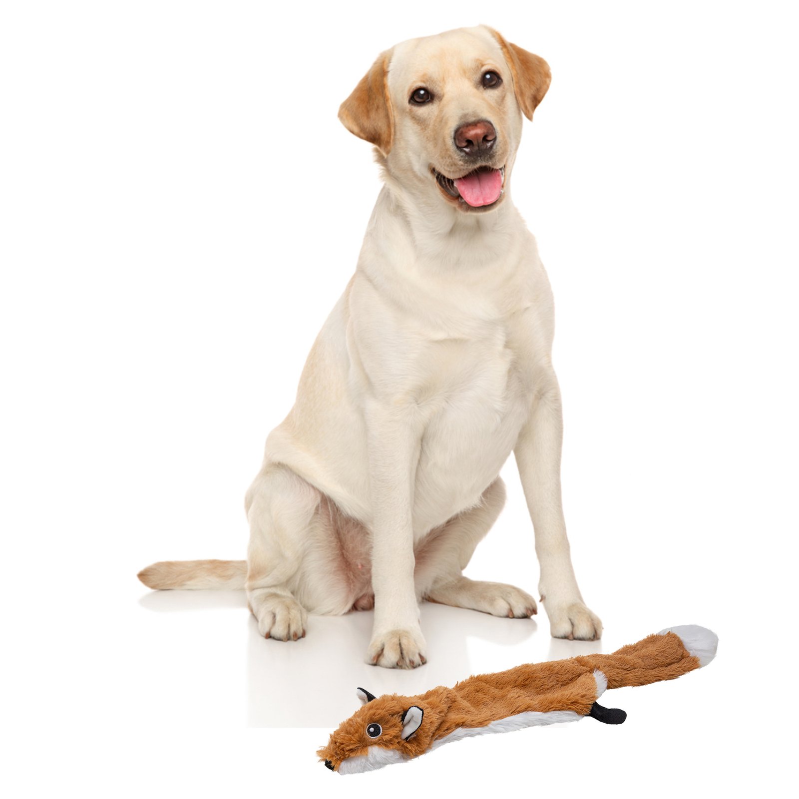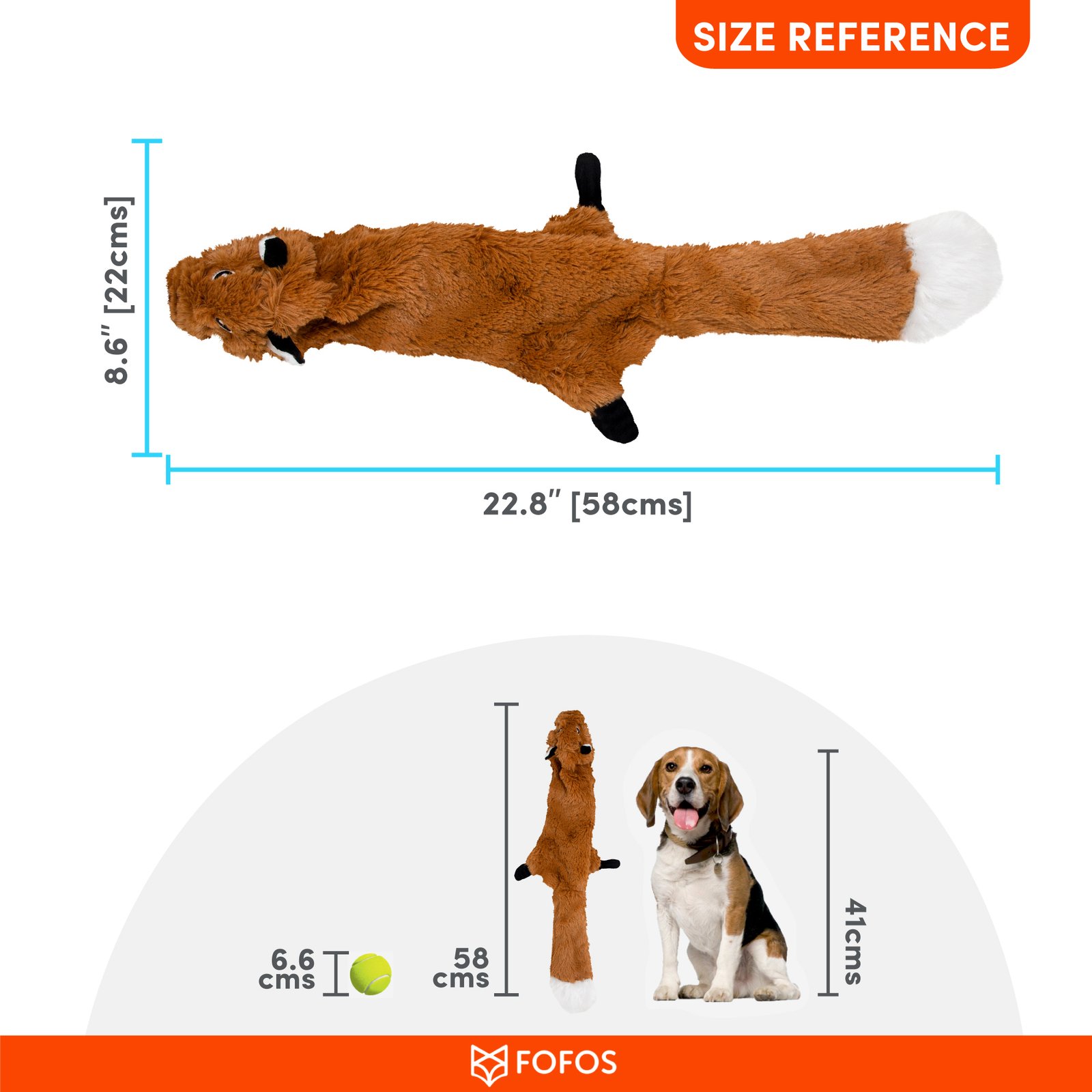 Fofos dog toy skinneez fox is a interactive stuffing-less long dog toy. Stuffing- less toys ensure less destruction and also prevents your dog to chew through the inside of the toy. This toy is perfect for a fun game of tug of war. It is made from super-soft polyester fabric This tug toy has two squeakers inside- at the head and the tail and can easily get your dogs attention through the squeaky noise generated. Engaging toys such as this allow your dog to chew, fetch tug, and bite on it while getting the right amount of exercise. This soft toy is recommended for small-large dogs (5-30kgs) of various breeds such as dachshund, pom, spitz, lab, st bernard etc.These toys are recommended for dogs who like to tug, snuggle, fetch and chew mildly. Not recommended for aggressive chewers.