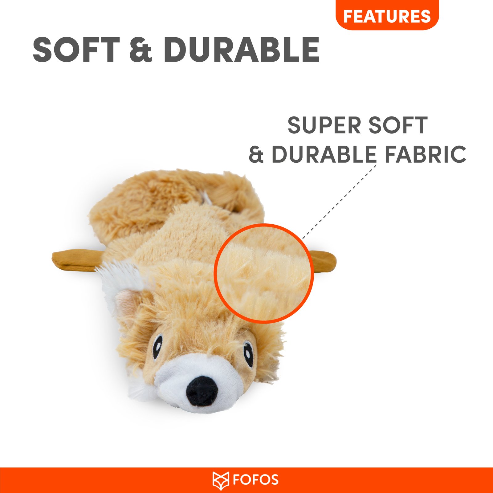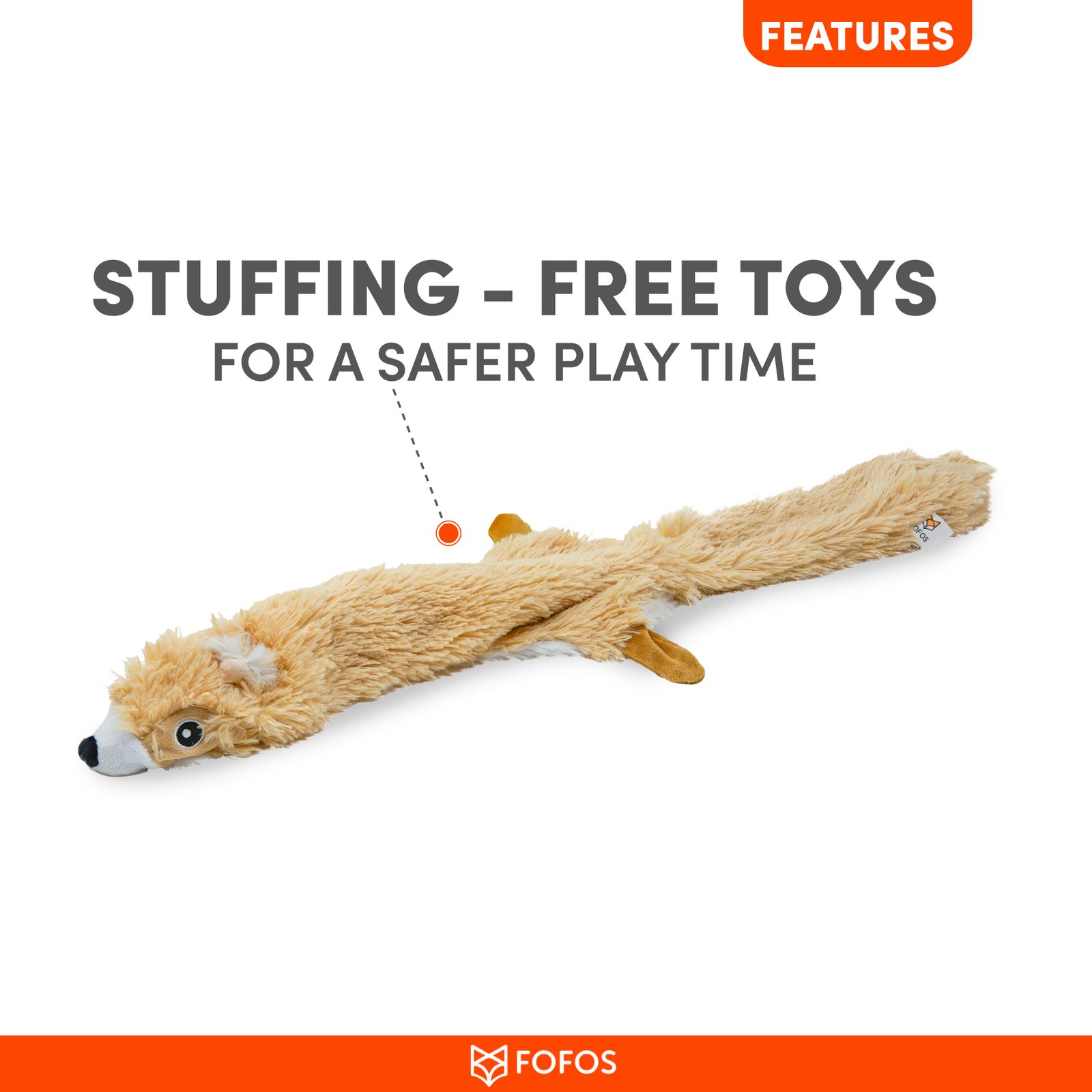 Fofos dog toy skinneez squirrel is a interactive stuffing-less long dog toy. Stuffing- less toys ensure less destruction and also prevents your dog to chew through the inside of the toy. This toy is perfect for a fun game of tug of war. It is made from super-soft polyester fabric This tug toy has two squeakers inside- at the head and the tail and can easily get your dogs attention through the squeaky noise generated. Engaging toys such as this allow your dog to chew, fetch tug, and bite on it while getting the right amount of exercise. This soft toy is recommended for small-large dogs (5-30kgs) of various breeds such as dachshund, pom, spitz, lab, st bernard etc.These toys are recommended for dogs who like to tug, snuggle, fetch and chew mildly. Not recommended for aggressive chewers.