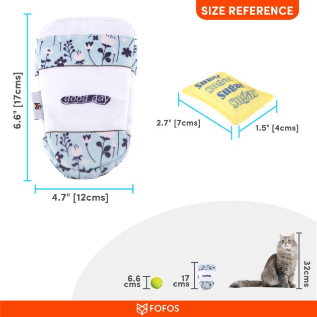 Catnip is a plant related to mint and contains an essential oil called nepetalactone that is known to cause euphoric, calming, and relaxing effects on cats. Catnip in small doses is completely safe, non-addictive for your kitten as the effects last about 10 mins for most cats. Fofos dreamland coffee toy pack is a cute cat playing toy filled with imported US grade dried catnip leaves and grass powder. These interactive puzzle toys come as 1 coffee pouch toy and 4 catnip sachets with bells inside that can be used as a separate toy and are a great way to stimulate your cat’s curiosity. It allows your cat to chew, swat, nip, play, and even promotes harmless biting and scratching. Fun engaging cat toys give your cat a mouse chase-like feeling ensuring good physical stimulation while the catnips give them a calm and relaxing experience. Ideal for small pet kittens above the age of 6 months as well as for older cats of Persian and other breeds as well. How to use: The sachets can be inserted inside the coffee pouch. Shake the toy and let your kitten find the bells.