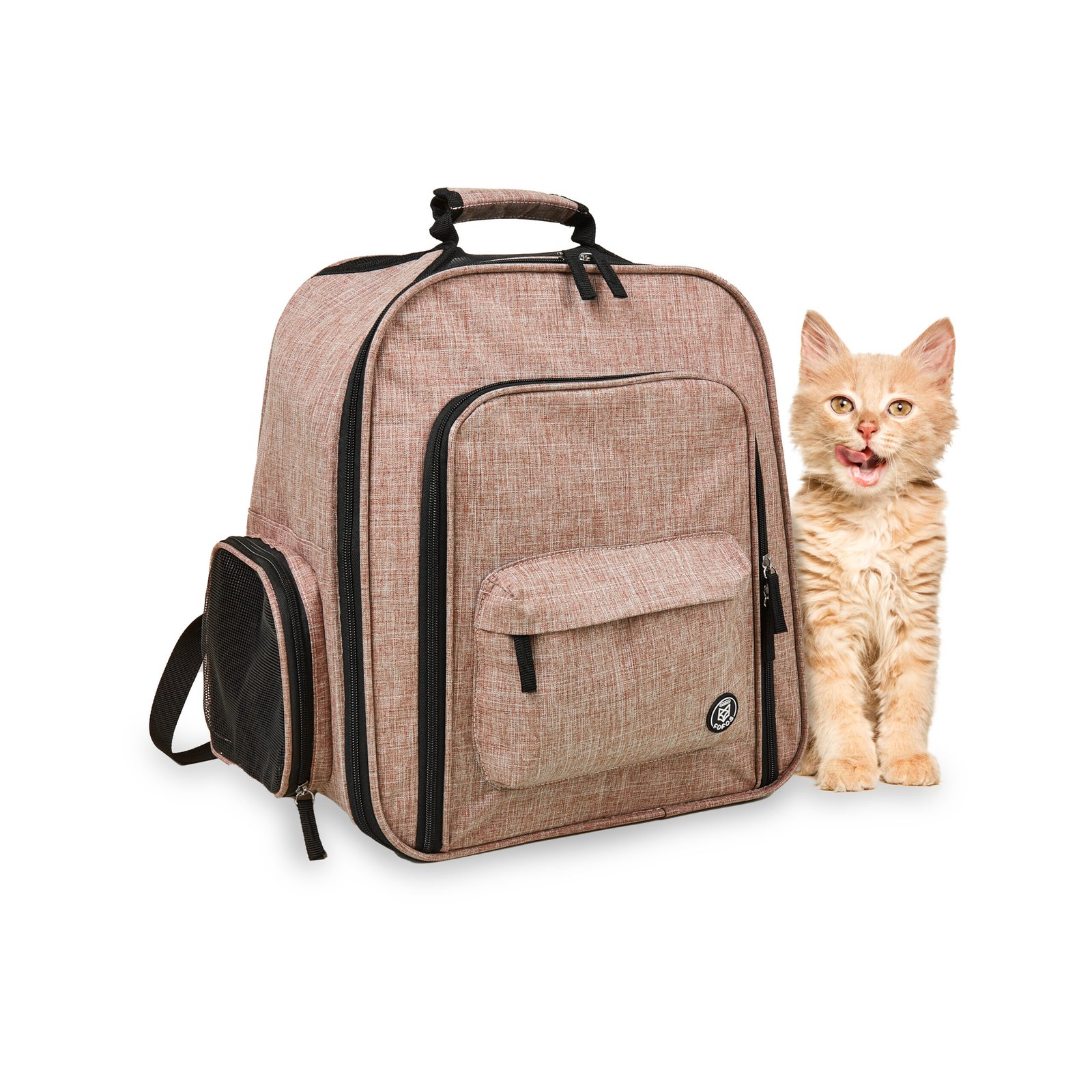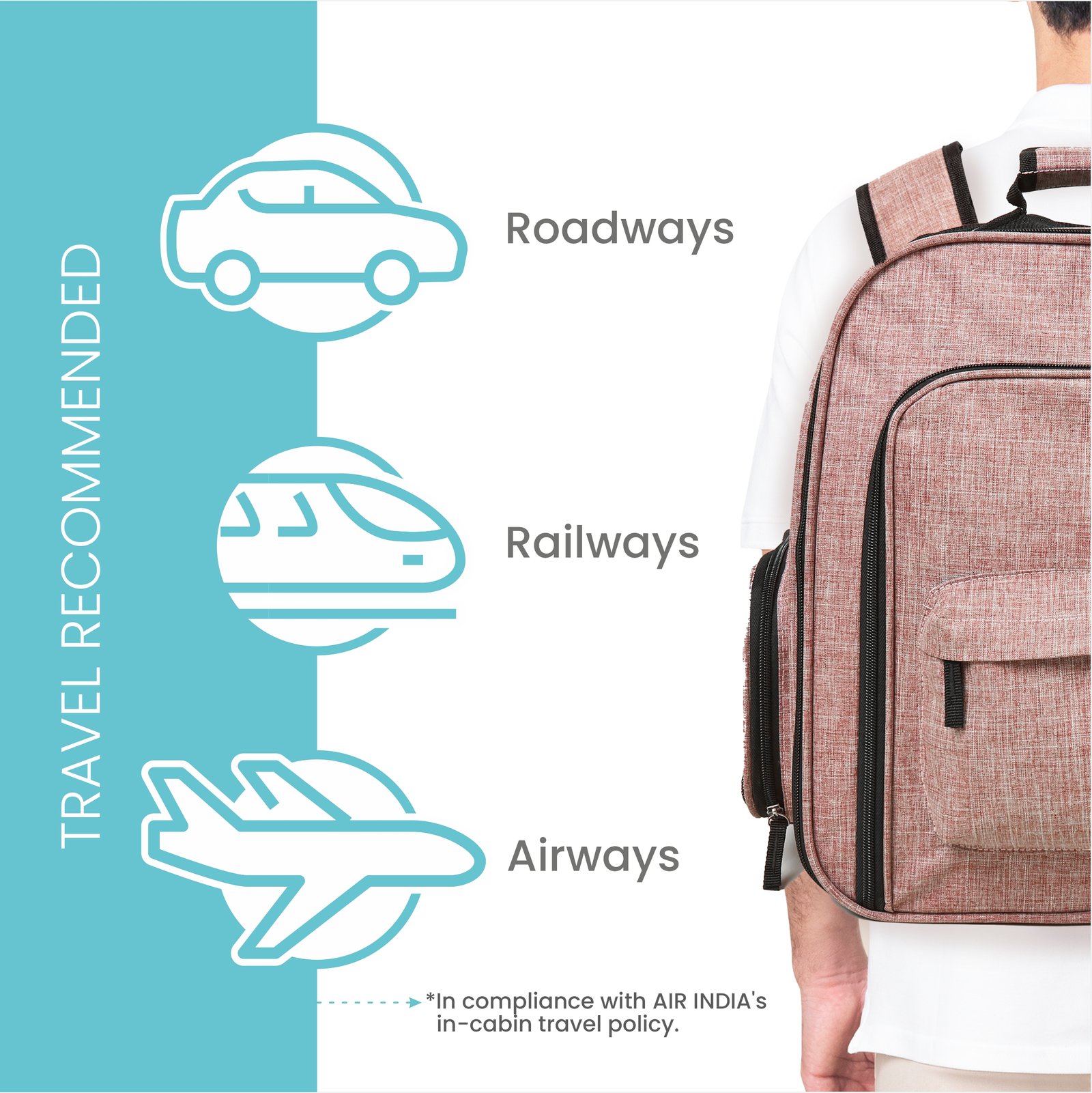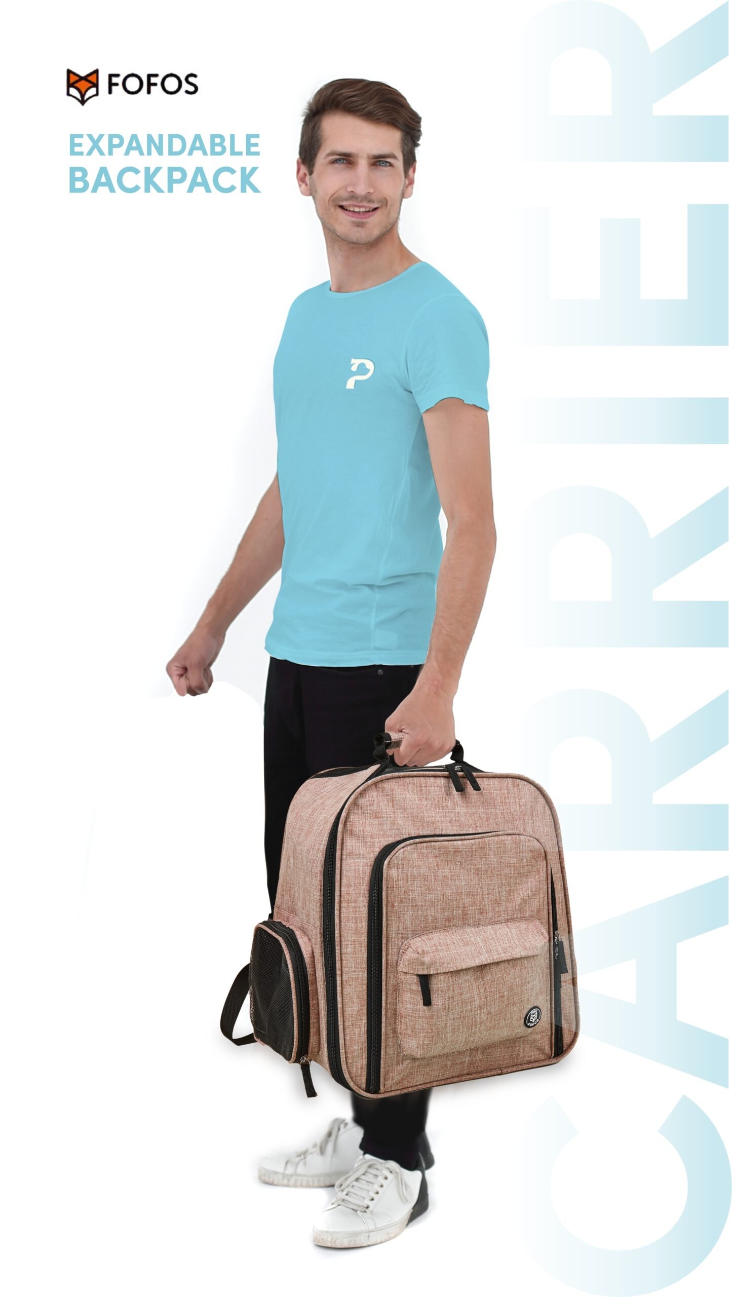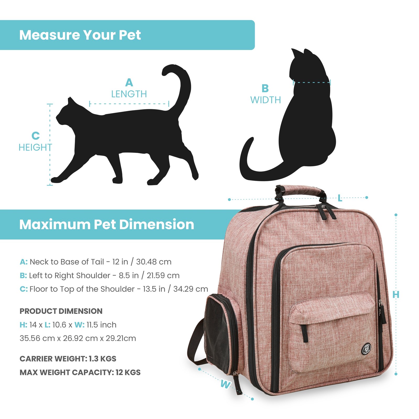 Soft-sided expandable pet carrier backpack with an anti-scratch breathable mesh window, fabric and mesh extensions on both sides for maximum airflow/ventilation and vision. The bottom has a removable padded base with a machine washable cover that acts like a cushion allowing your pet to rest with ease while travelling. Sturdy structure design with memory iron rods, a metal leash clip inside prevents your pet from jumping out. 1 large zipper pocket is added for food, toys, treats, water bottles etc and 1 side zipper pocket with a headphone outlet for extra storage This lightweight carrier comes with sturdy straps for hand & shoulder carry. Durable zippers provide extra security and safety. The Rubber Knuckle grid guard under the carrier prevents the bag from touching the ground and it can be folded to fit in your car or suitcase making it convenient to travel with. It provides a cosy and restful environment for your pet and reduces stress and anxiety travel. To choose the right carrier for your pet measure your pet’s length from neck to base of the tail (L), height from floor to top of the shoulder (H) and width (B) Carrier dimensions :L = 18.5 x B = 11 x H = 11 in Max pet dimensions L = 16 x B = 9 X H = 9IN Max weight capacity of 12 kgs This will ensure enough support and room for your pet to stretch and get comfortable. This pet carrier is suitable for fitting into large bicycle baskets, road travel, trips to vet/groomers etc