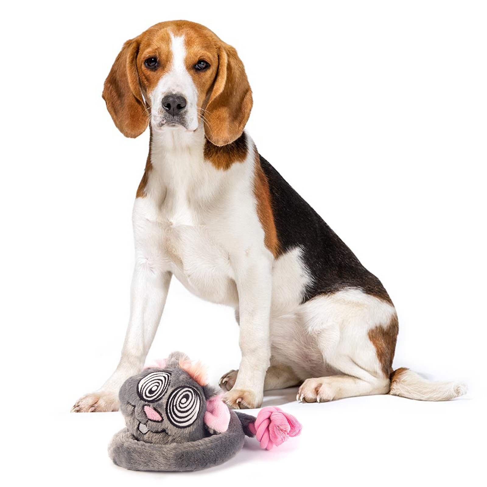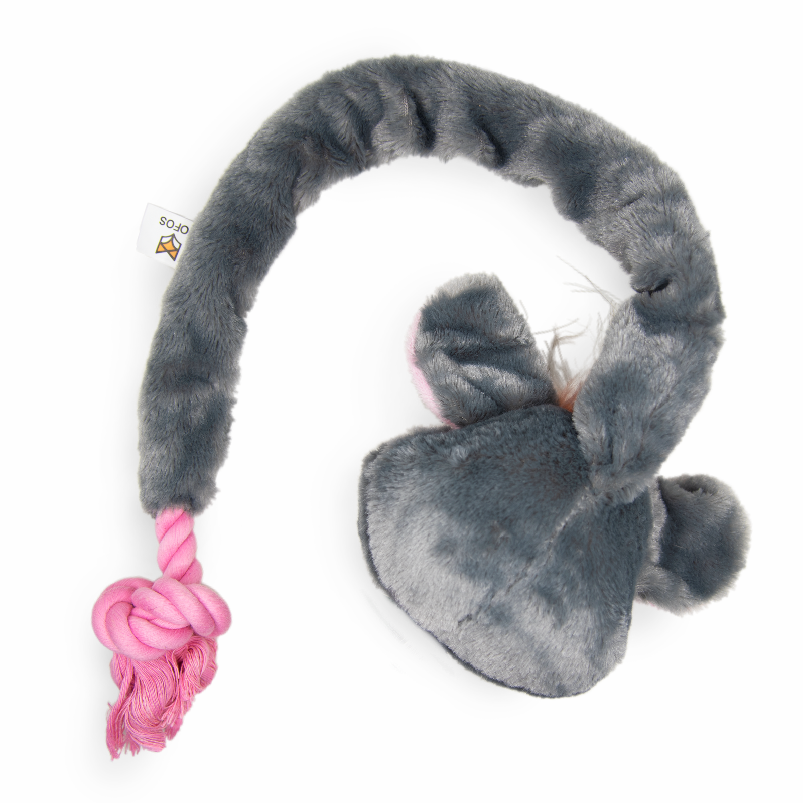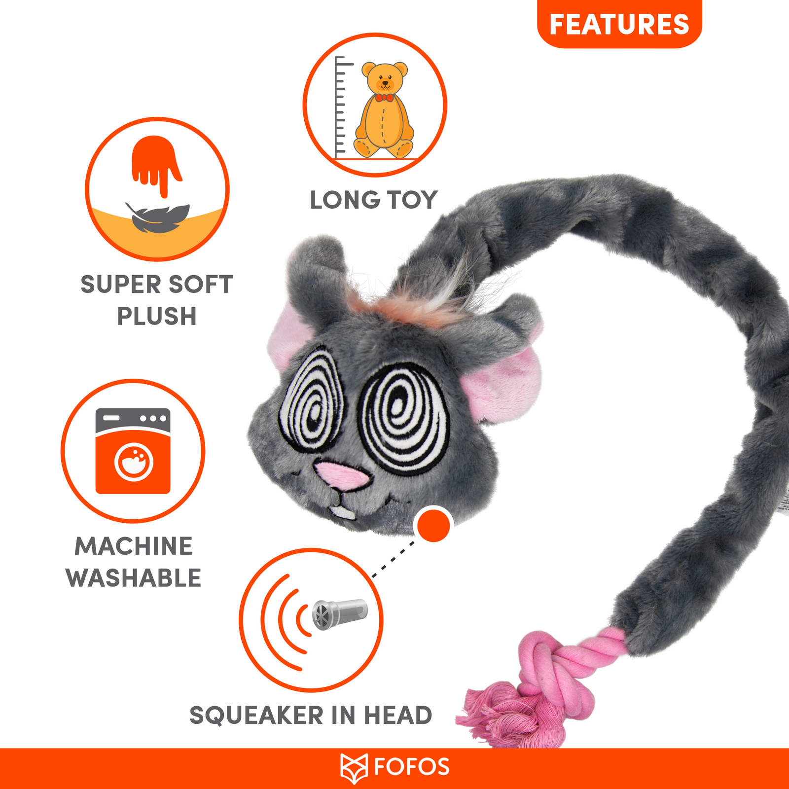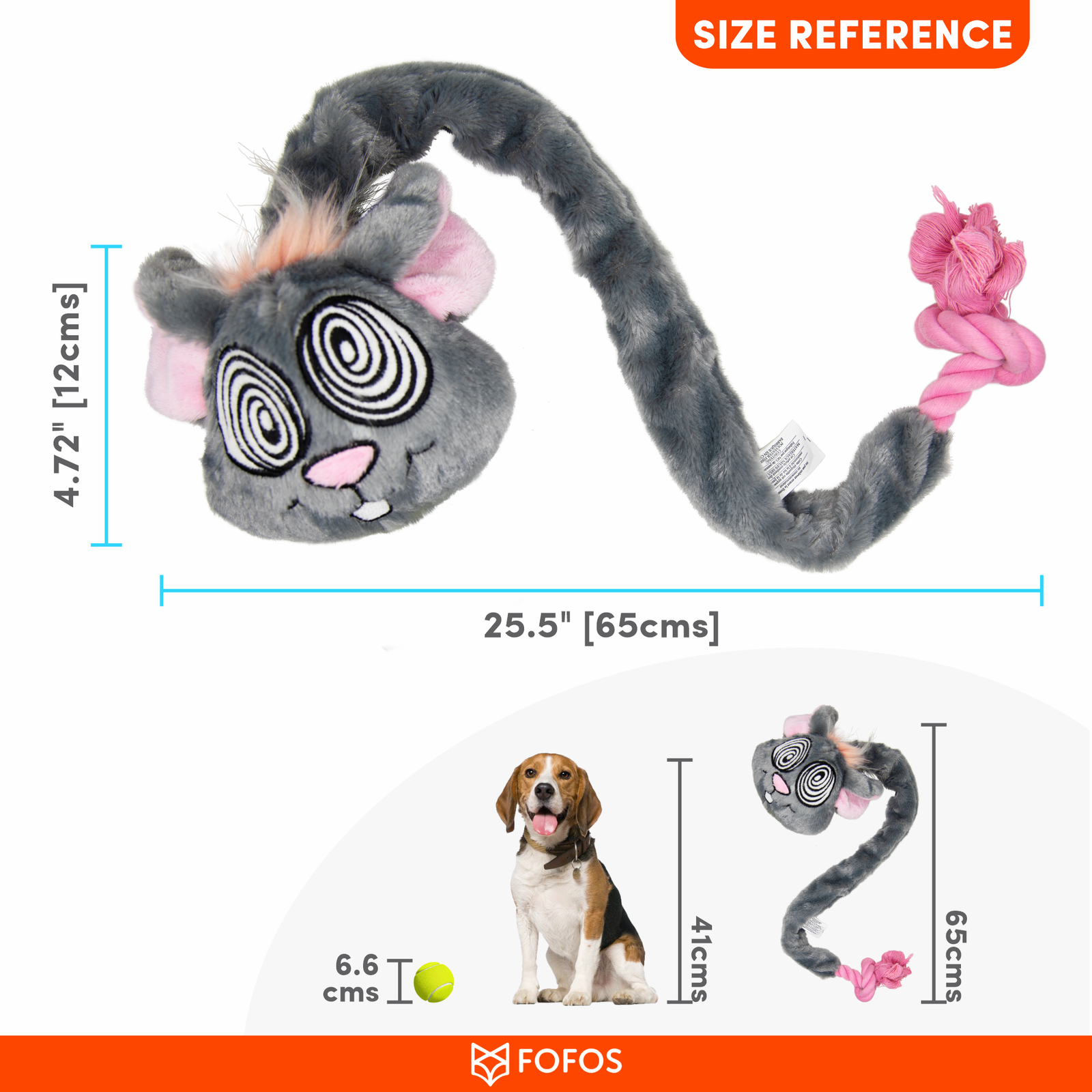 Fofos Forest eye mouse rope is a durable and vibrant looking dog tug toy and is made from super-soft polyester fabric. This dog toy is long and is perfect for games like tug of war. The squeaker inside makes a squeaky noise every time your pet interacts with it by tugging/playing. Interactive dog toys such as this allow your dog to chew, fetch tug, and bite on it while getting the right amount of exercise. This soft toy is ideal for small-medium dogs (5-20kg) of various breeds such as dachshund, pom, labrador, etc. This toy is strong but not indestructible and is best suited for pet dogs that have light chewing, cuddle and indoor playing styles. Not recommended for aggressive chewers.
