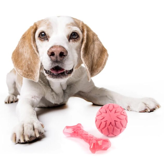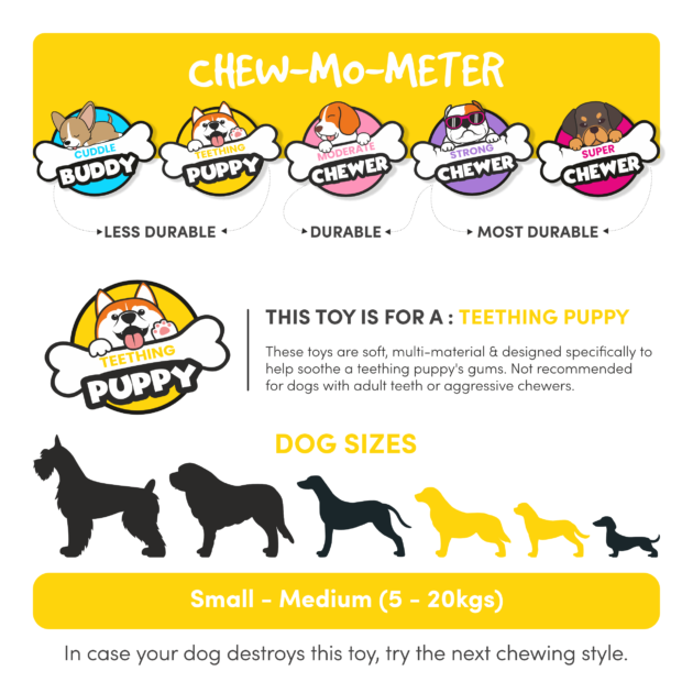 Fofos milk bone and ball is a set of dog toys that have a bumpy texture to soothe teething while being gentle on gums. This set of teething toys include a bone and a ball with a squeaker inside that gives rise to a squeaky noise when your pet interacts with it. This toy is made from a combination of 100% natural rubber and TPR. The squeaker inside the ball toy makes playtime engaging for your pet. Interactive dog toys such as this allow your dog to chew, fetch, and bite on them while getting the right amount of exercise. This toy is ideal for small-medium (5-20kg) of various breeds such as dachshund, pom, spitz, Shih Tzu, pug, beagle, labrador, etc. Teething toys are soft and designed specifically to help soother teething pain in puppies’ gums. It is a set of strong but not indestructible toys and is best suited for pet dogs that are teething, and have a chew and fetch playing style. Not recommended for dogs with adult teeth or aggressive chewers.