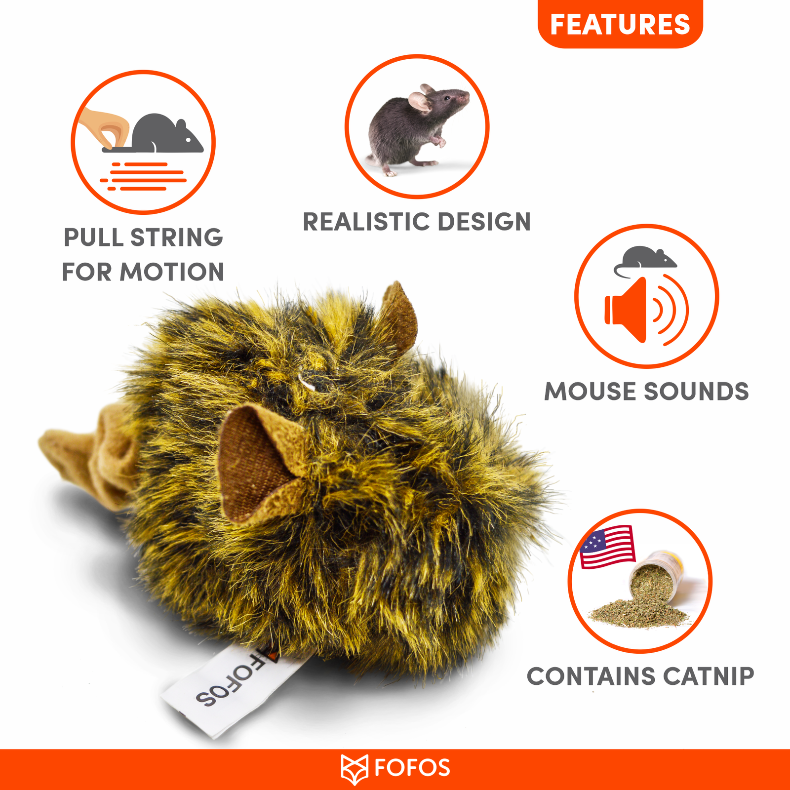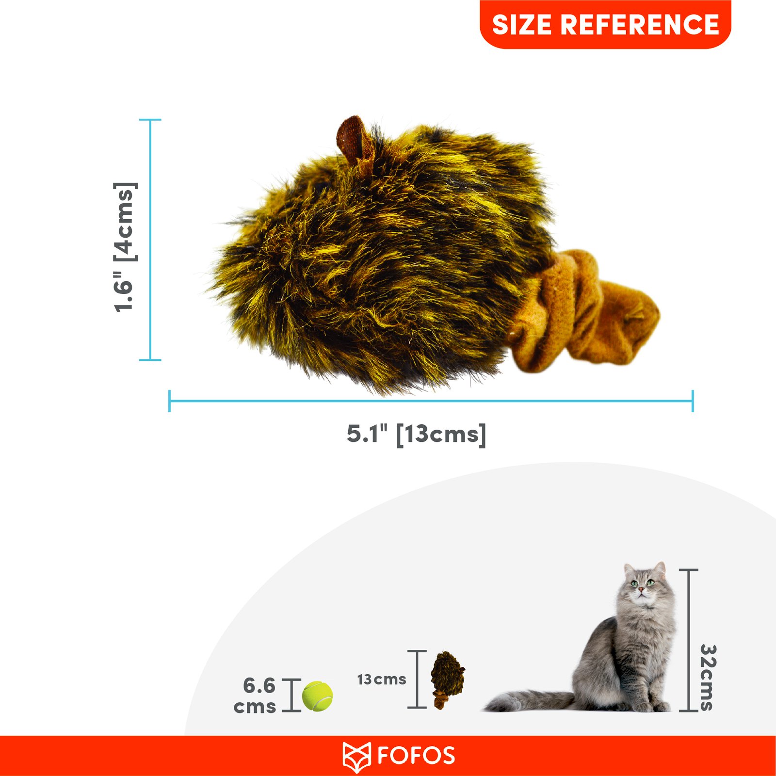 “Fofos Pull String and Sound Chip Mouse is a cute cat toy that mimics an actual mouse with its life-like features. It is made from soft plush polyester fabric resembling a rat or a mouse. This cat playing toy is battery operated and can be moved to generate a squeak like sound and the tail acts as a string that can be pulled, allowing the mouse to vibrate for a few seconds. It has imported US grade dried catnip leaves and grass powder inside. Interactive toys are known to unleash a kitten’s natural desire to chase, nip, play, chew, swat and even promote harmless biting , scratching and chewing. Kitten toys are the best way to exercise your cat and keep them alert. Fun engaging toys give your cat the sensation of interacting with an actual mouse or a fish ensuring good physical stimulation while the catnips give them a calm and relaxing experience. Ideal for small pet kittens as well as for older cats of Persian and other breeds as well. How to use: We recommend consistent and scheduled playtime. Start with five-minute a day sessions. Just like a dog needs a walk, a cat needs playtime! What is Catnip: Catnip is a plant related to mint and contains an essential oil called nepetalactone that is known to cause euphoric, calming, and relaxing effects on cats. Catnip in small doses is completely safe, non-addictive for your kitten as the effects last about 10 mins for most cats.”