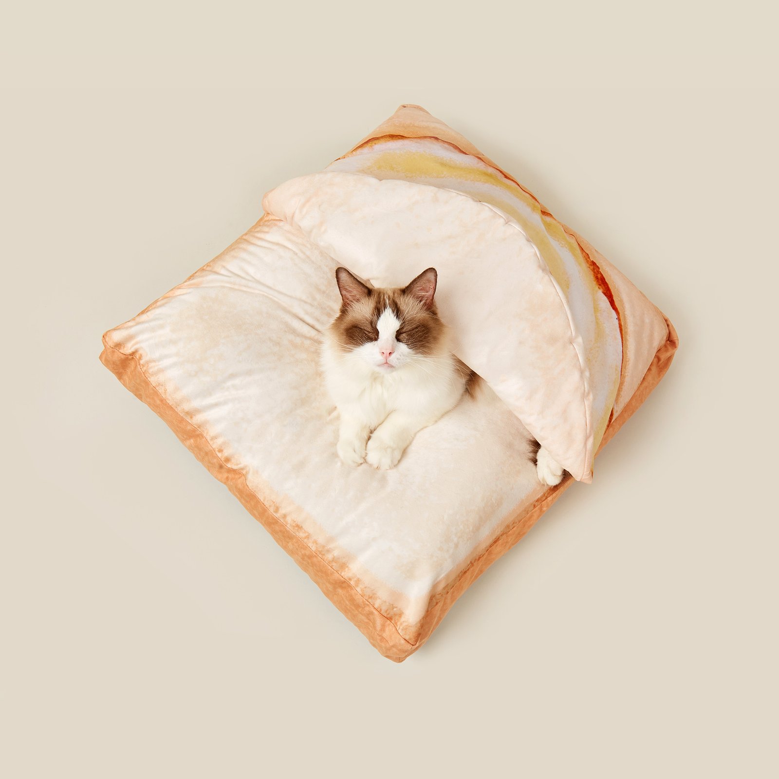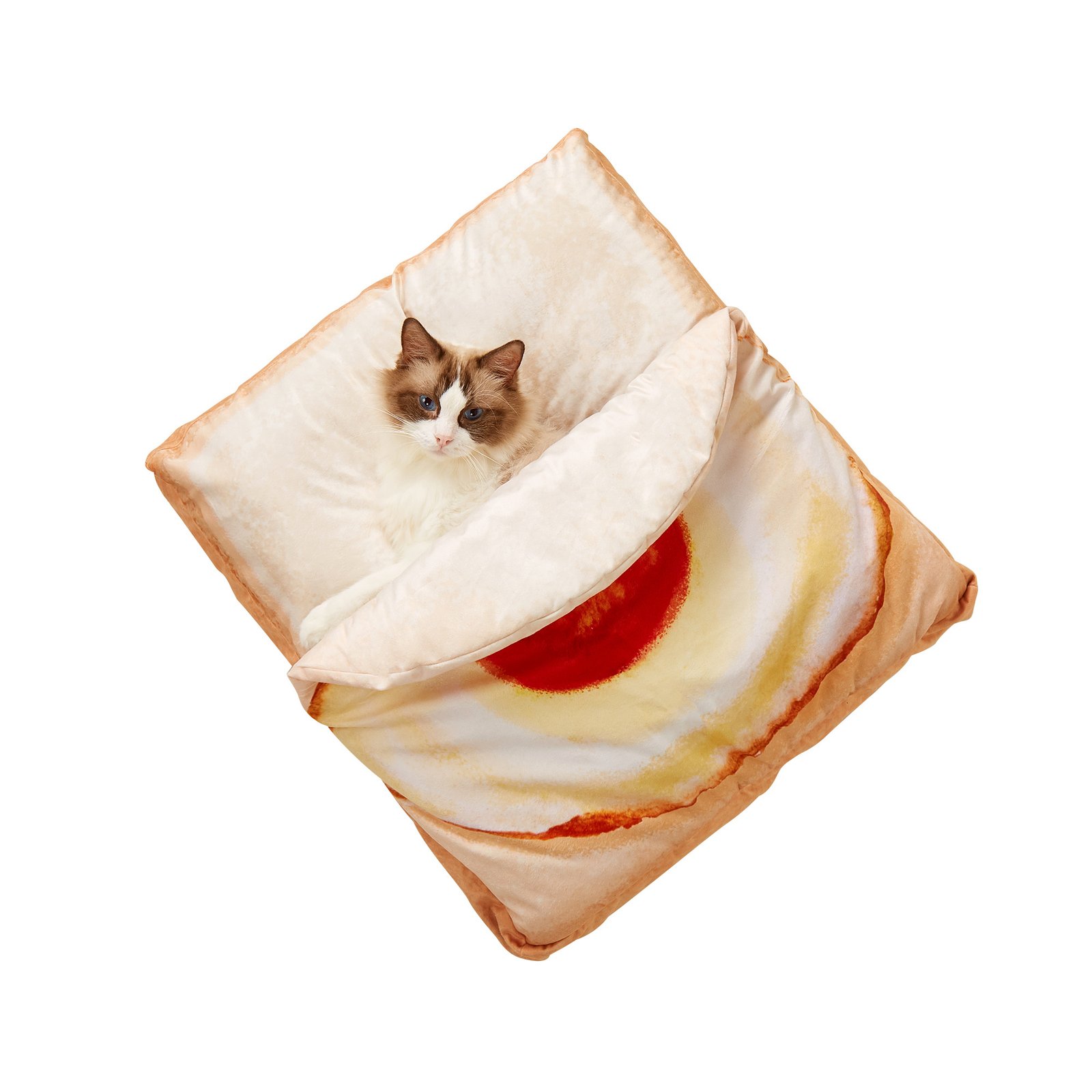 Slice of bread, slice of bed, slice of life. A warm morning breakfast inspired design, blanket shaped like an omlette and your pretty kitty in the middle’ who wouldn’t want that? Toasty(pun intended) and extremely comfortable, makes you want to jump in, set aside the cat. A catto that deserves it all must have a blanket and preferably one shaped like an omelet, we don’t make the rules. How many zoomies can a cat take before saying ‘good night’ and going to sleep? Not enough. How about a toasty nap then? Okay that will do! Just dunk them in the washing machine and hide from your cat till it’s done. No loose stitching and 100% polyester guarantees a smooth ‘zz” sailing. Just be clear of people who might judge you for letting your pet sleep in such a suave way, they wouldn’t get your humour.