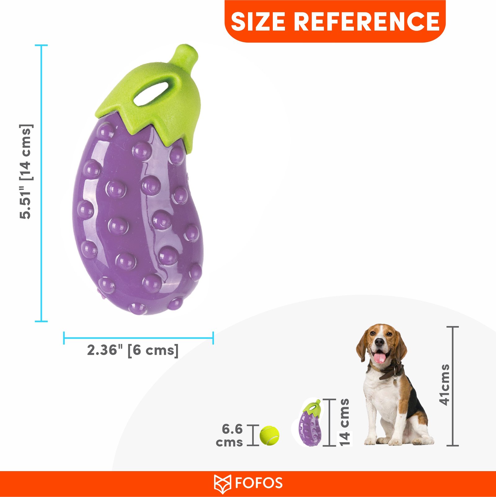 Fofos Vegi-bites Eggplant is an engaging screaming squeaker dog toy that generates a loud squeaky noise. This fun toy can float in water and can be used during bath times to distract your pet for a hassle-free experience. This dog toy has a bumpy texture and is good for massaging teeth and gums. This green top of this toy is made from soft foam rubber and the bottom is made using durable TPR. Interactive dog toys such as this allow your dog to chew, fetch, and bite on them while getting the right amount of exercise. This toy is ideal for medium-large dogs (10-30kg) of various breeds such as dachshund, pom, spitz, etc. This toy is strong but not indestructible and is best suited for pet dogs that have moderate chewing, and fetch playing style. Not recommended for aggressive chewers.