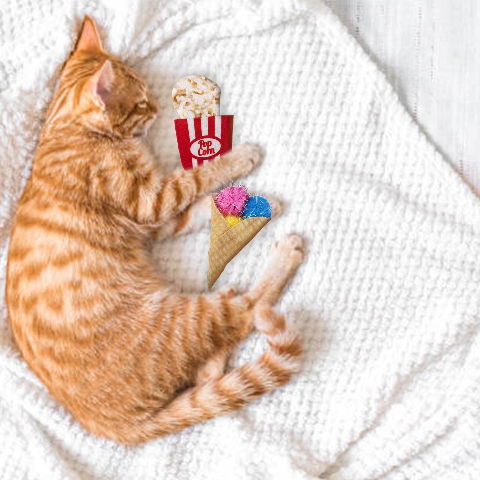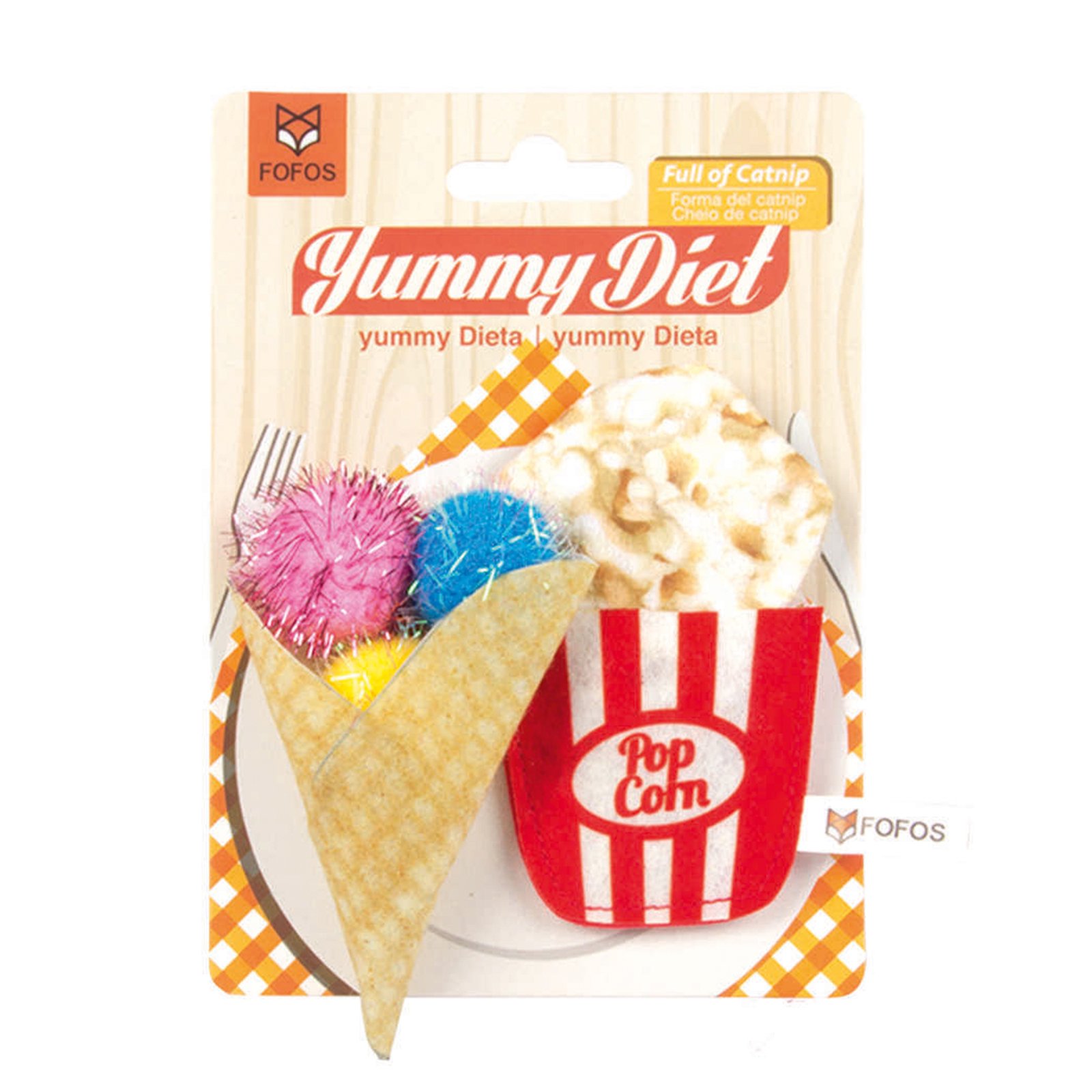 Catnip is a plant related to mint and contains an essential oil called nepetalactone that is known to cause euphoric, calming, and relaxing effects on cats. Catnip in small doses is completely safe, non-addictive for your kitten as the effects last about 10 mins for most cats. Fofos Yummy Diet Popcorn and Cone are cute cat playing toys filled with imported US grade catnip dried leaves and grass powder. These Interactive toys allow your cat to chew, swat,nip, play,and even promote harmless biting and scratching. Fun engaging cat toys give your cat a mouse chase-like feeling ensuring good physical stimulation while the catnips give them a calm and relaxing experience. Ideal for small pet kittens above 6 months of age as well as for older cats of Persian and other breeds as well.