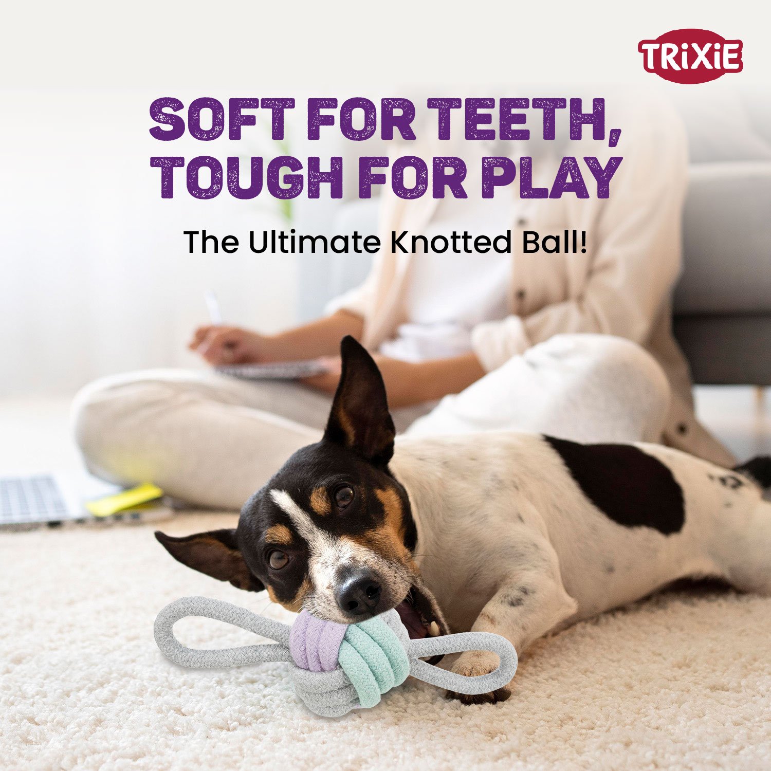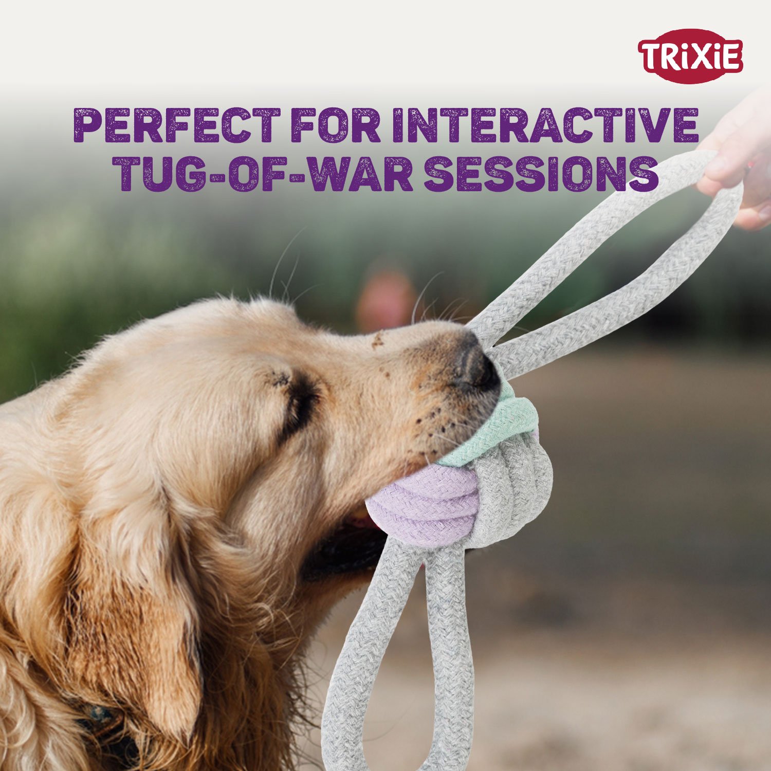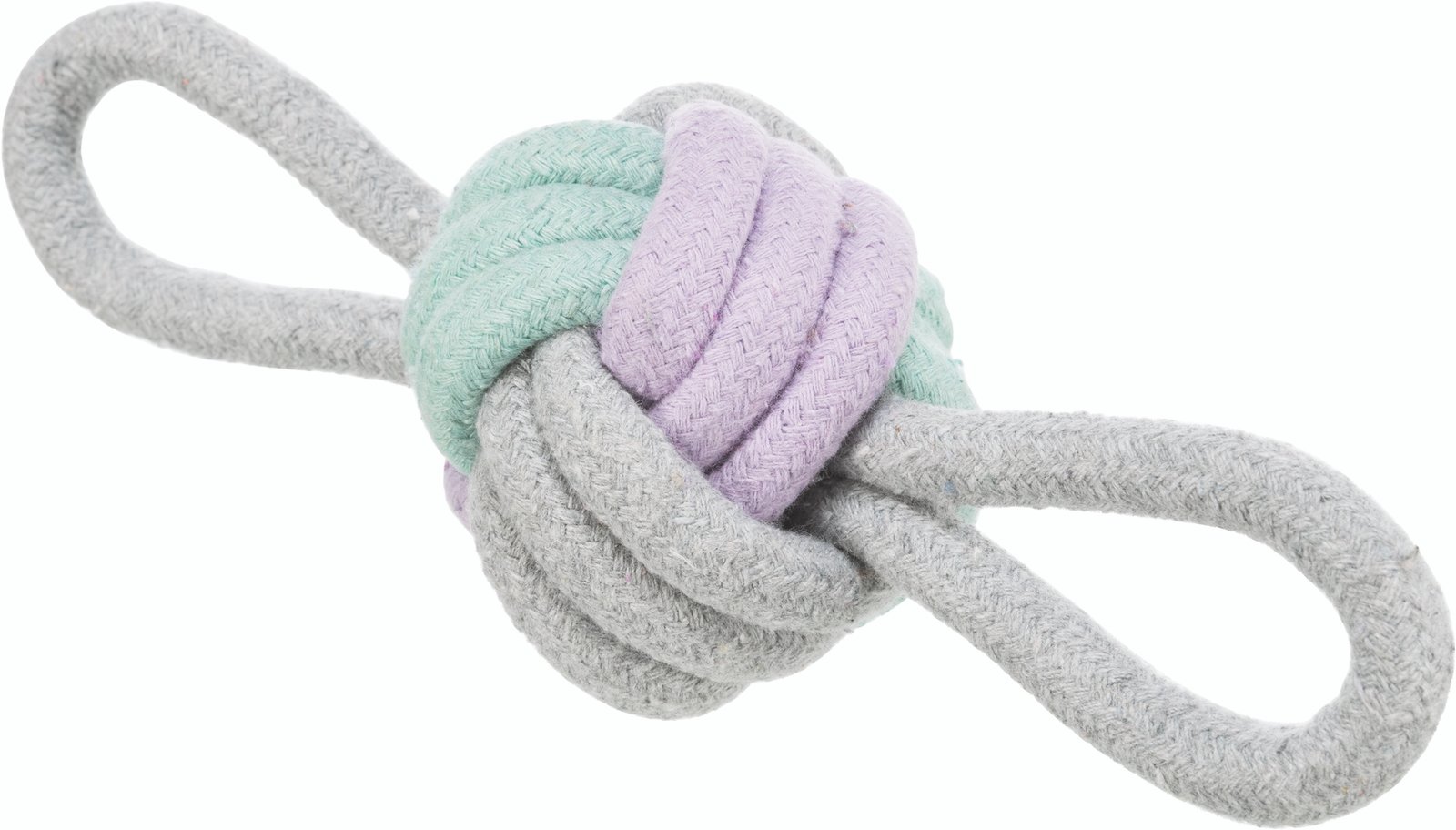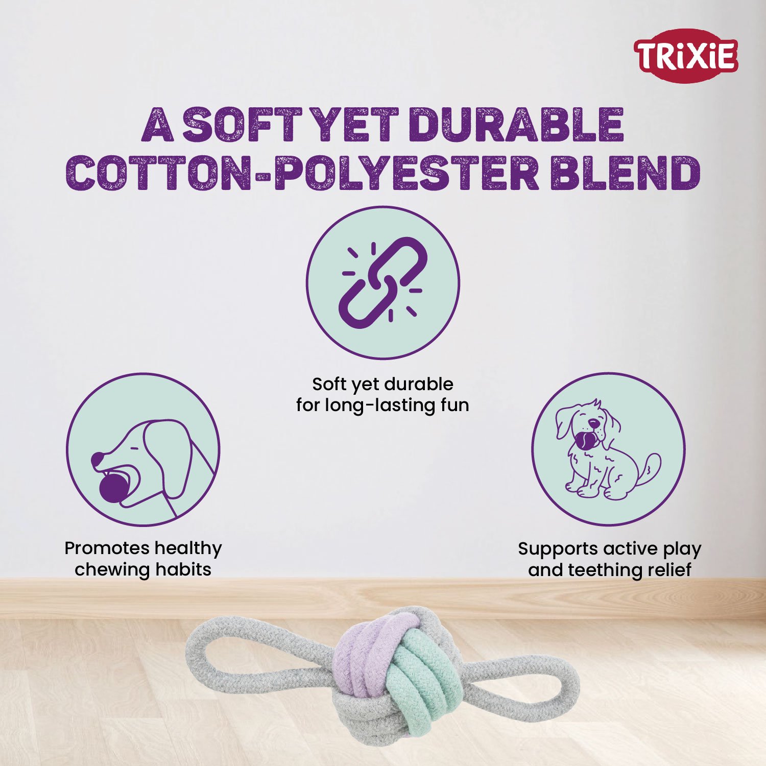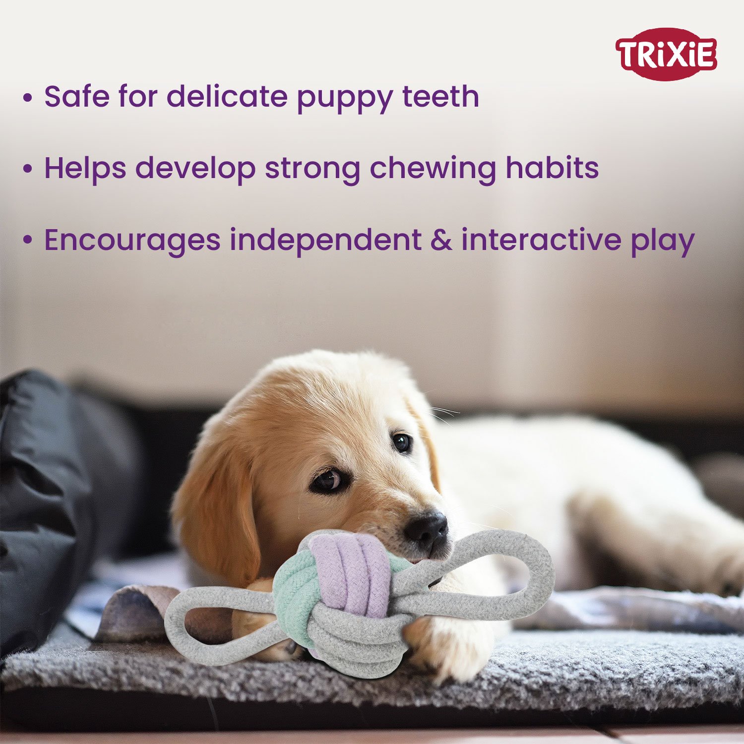 A durable rope toy designed for tug, chew, and fetch play, especially for puppies and smaller breeds.