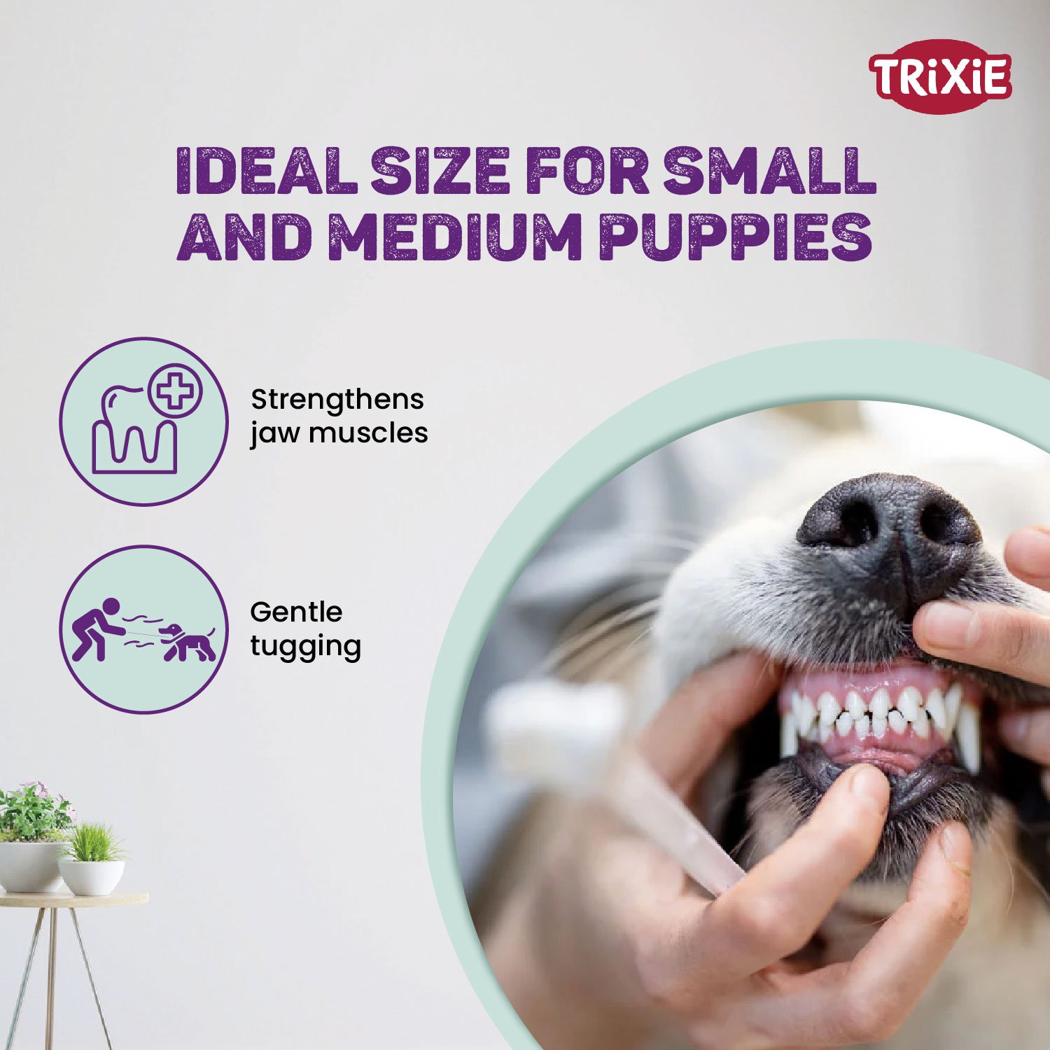 A durable rope toy designed for tug,  chew, and fetch play, especially for puppies and smaller breeds.
