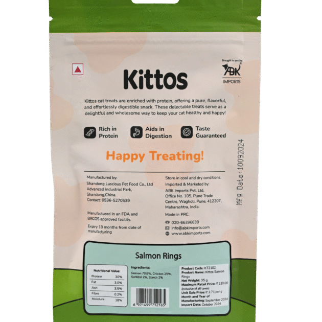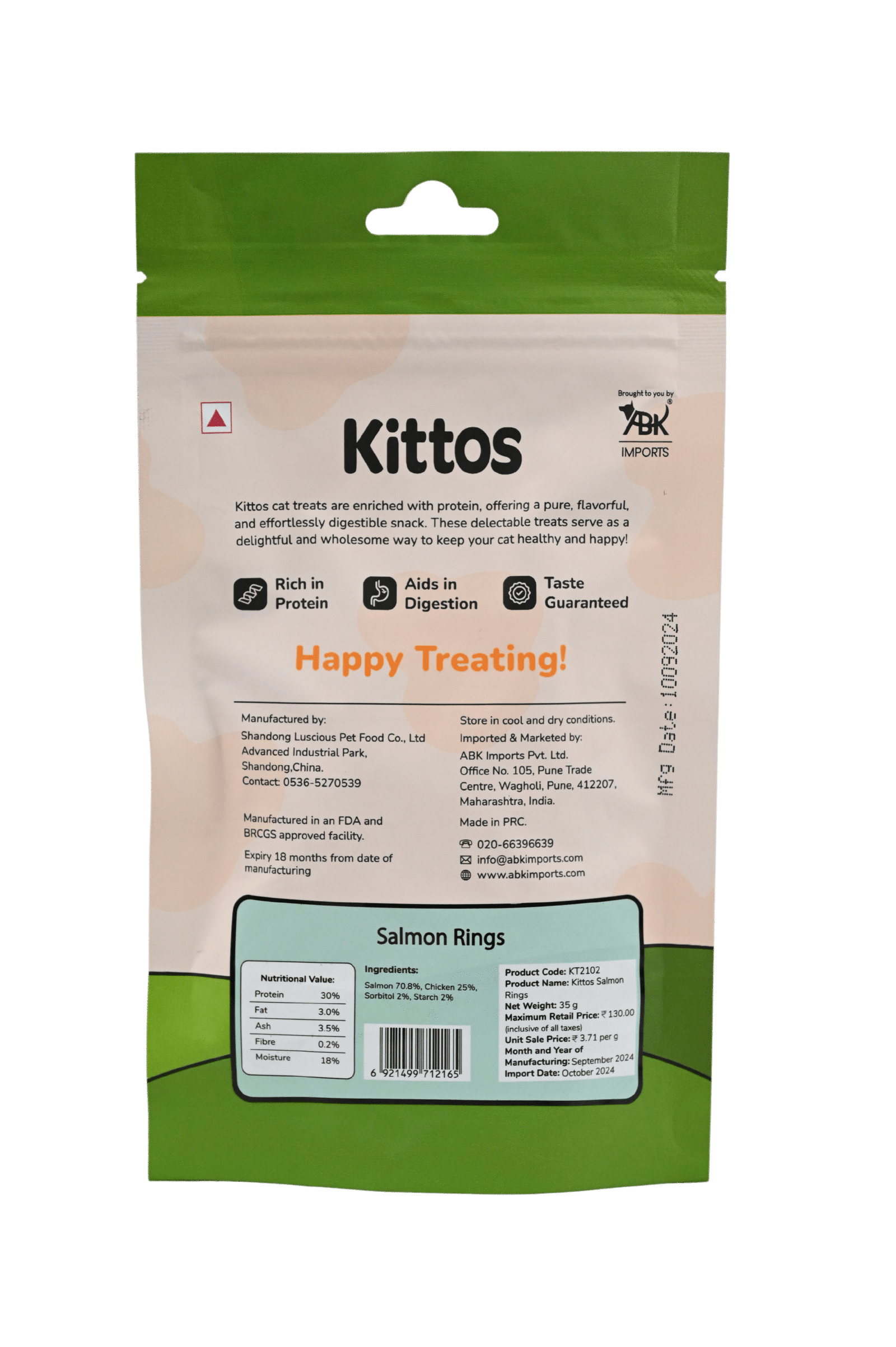| Ring-shaped cat treats with real salmon. Adds a fun twist to regular feeding time. Perfect for training or independent play. |