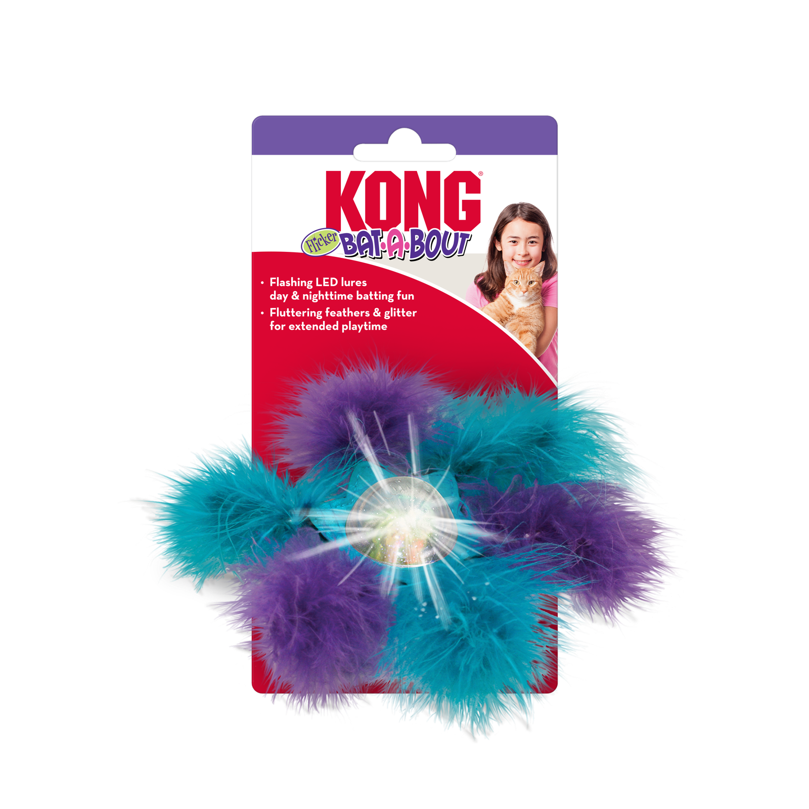 | Even the most indifferent kitty will be dazzled by the Kong Bat-a-Bout Flicker Flurry toy! Pounce-worthy feathers surround a glittery ball that flashes when it moves, creating a fun multi-sensory experience. It’s great during the day and perfect for encouraging independent play at night! |