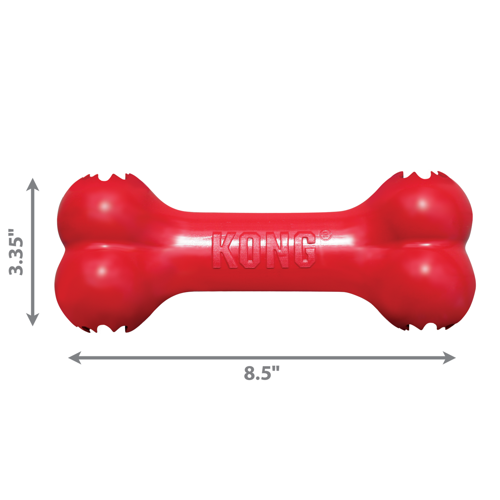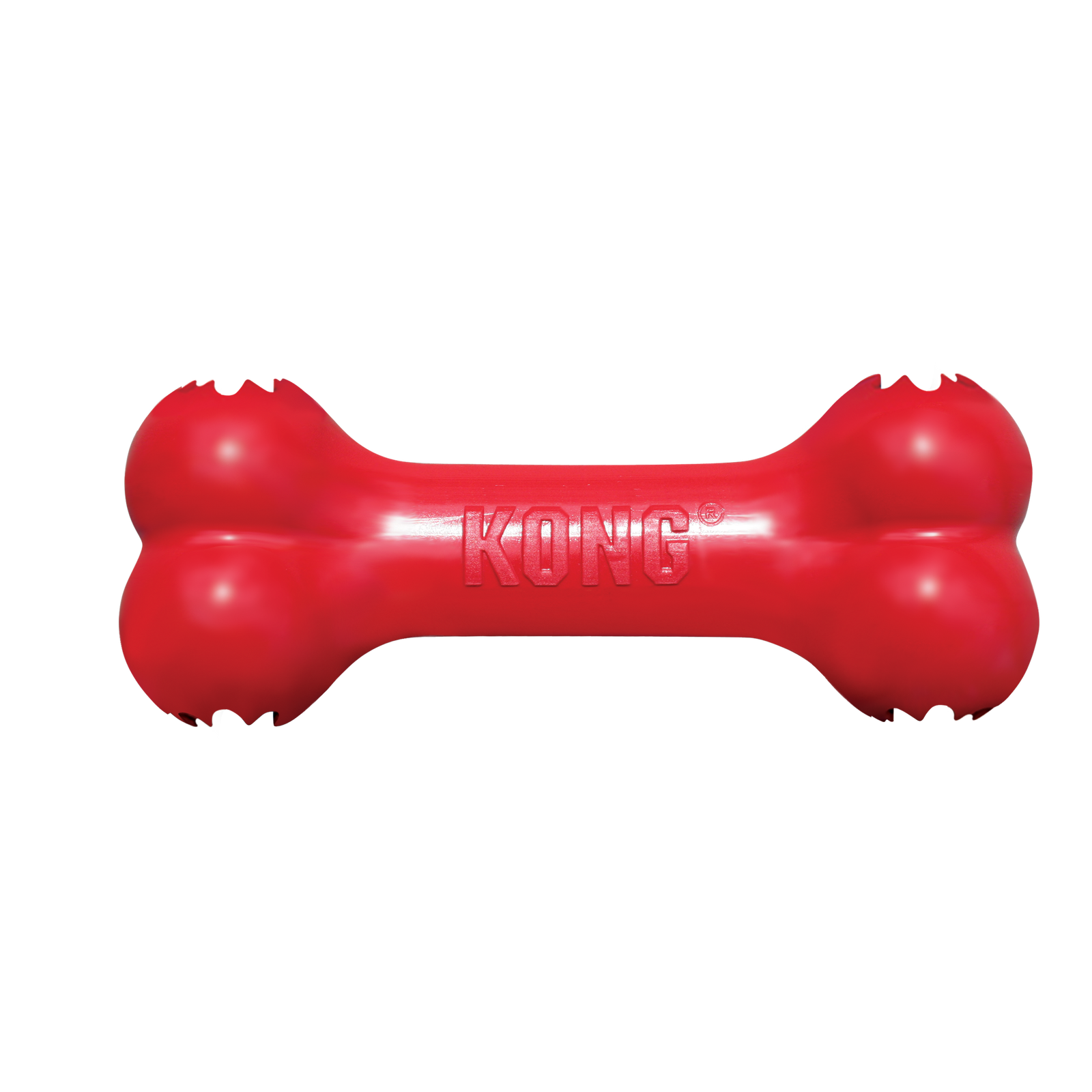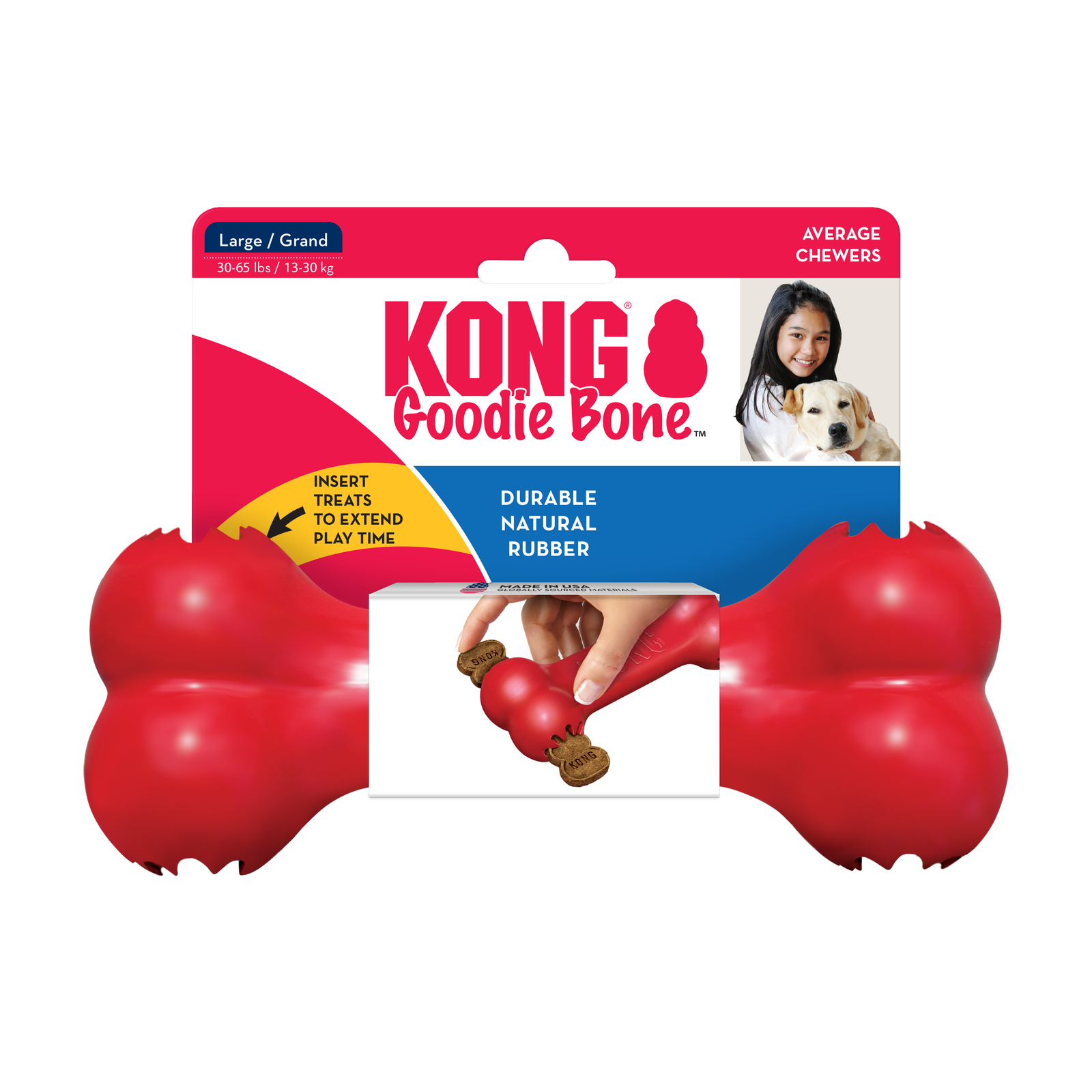 | The KONG Goodie Bone™ toy engages dogs that delight in chew sessions. Made from the KONG Classic unique natural red rubber formula, this bone features the patented Goodie Grippers ™ that turn this entertaining toy into a fun treat dispensing challenge that can be stuffed with your dog’s favorite kibble. |