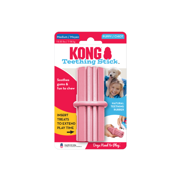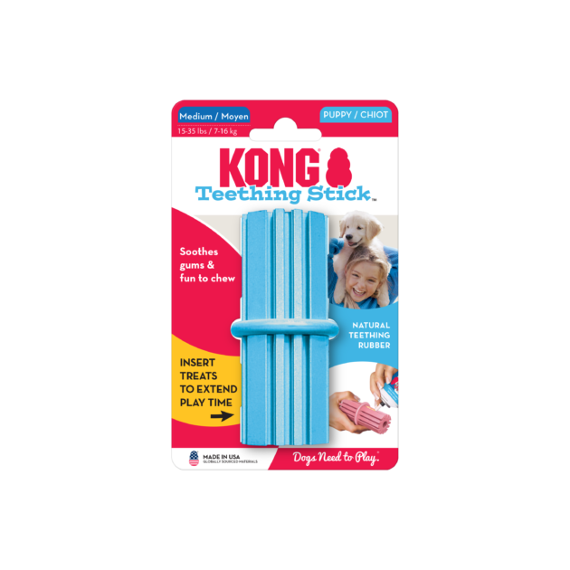 | The KONG Puppy Teething Stick is made with unique KONG Classic puppy rubber. The ridges gently clean teeth and soothe sore gums when chewed. Fill them with Easy Treat or Peanut Butter to encourage long-lasting play sessions. Playing with the Puppy Teething Stick helps teach puppies appropriate chewing behavior. Use with puppies until they reach 9 months, then they can graduate to KONG Classic Rubber toys. |