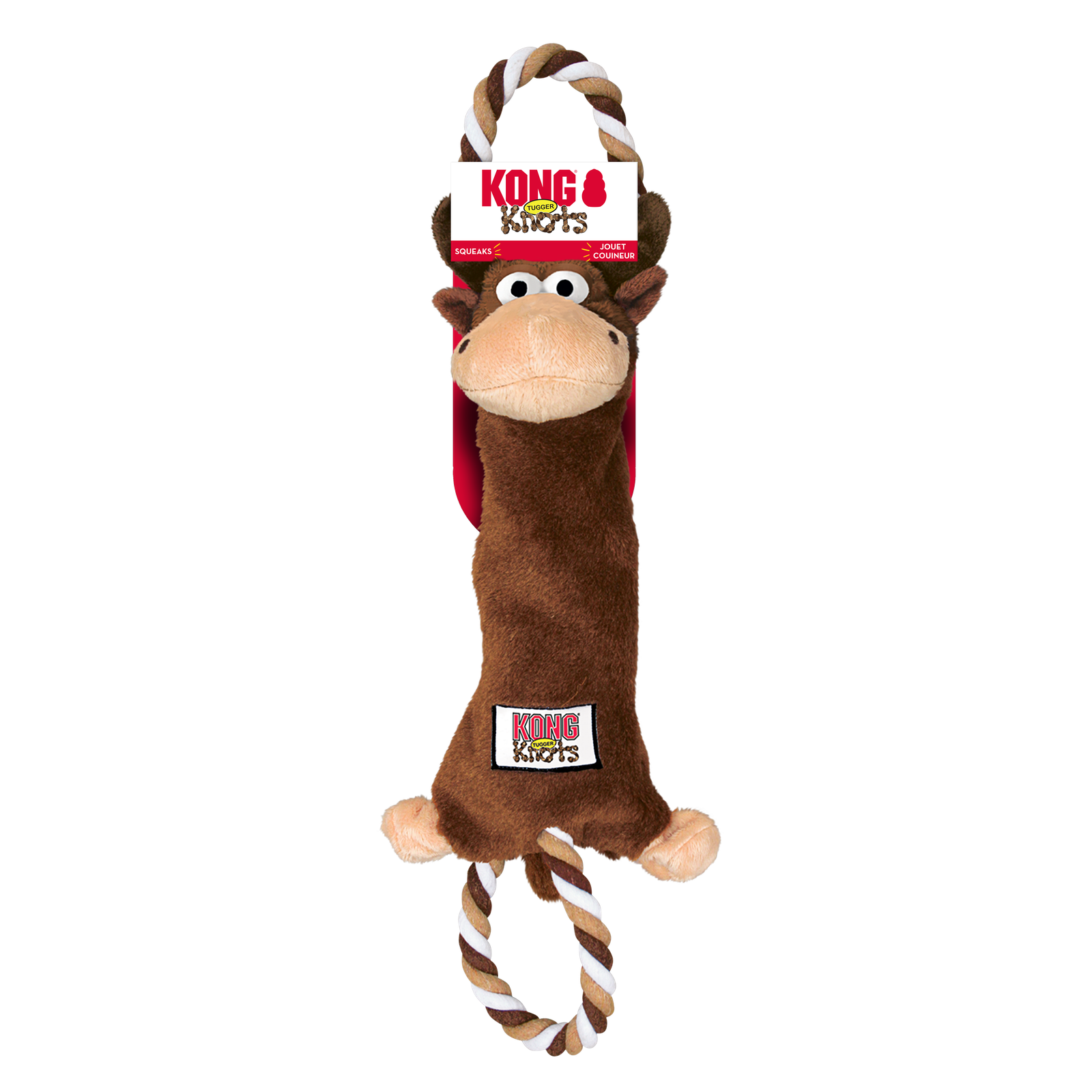 | The KONG Tugger Knots Moose is a tough, interactive tug and shake toys that dogs love. Each toy has knotted ropes inside for a realistic feel, which extend outside the toy creating tug handles at both ends. This unique design creates a captivating variety of textures and resistance that dogs love – and it contains a squeaker for added fun. |