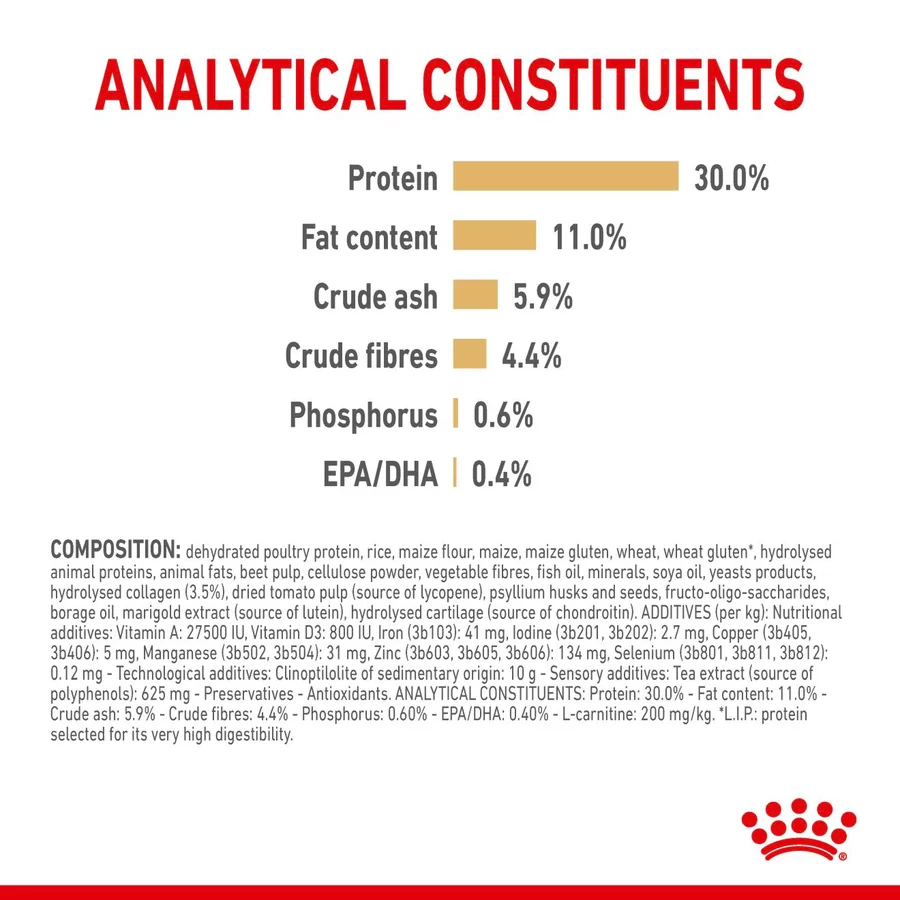 Ideal weight & muscle mass support : As the Labrador Retriever ages, the activity level decreases. This specific formula helps maintain the mature Labrador Retriever’s ideal weight with an adapted fat and calorie content. This formula also helps maintain muscle mass with an adapted protein content and L-carnitine.