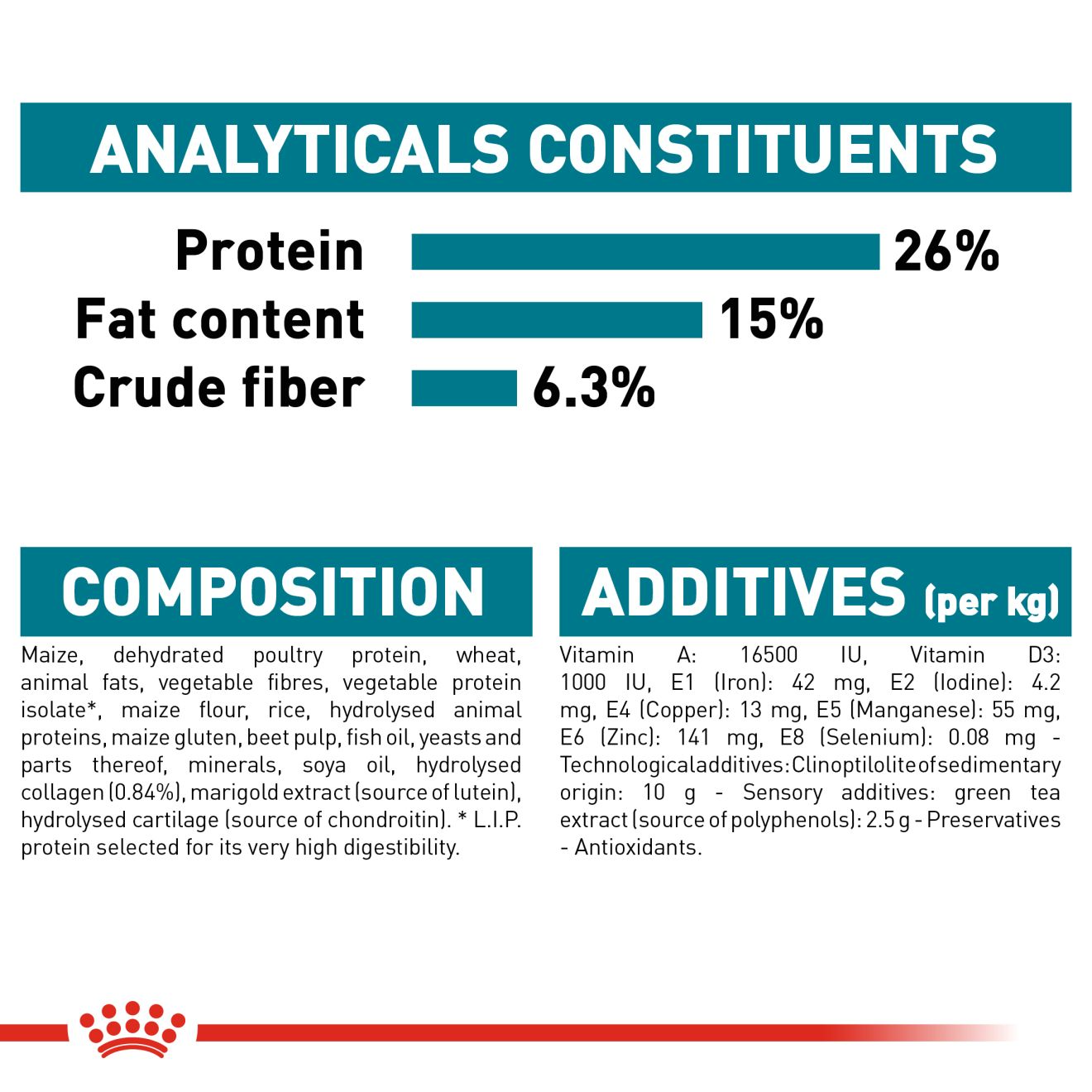 Additives (per kg): Nutritional additives: Vitamin A: 16500 IU, Vitamin D3: 1000 IU, E1 (Iron): 42 mg, E2 (Iodine): 4.2 mg, E4 (Copper): 13 mg, E5 (Manganese): 55 mg, E6 (Zinc): 141 mg, E8 (Selenium): 0.08 mg – Technological additives: Clinoptilolite of sedimentary origin: 10 g – Sensory additives: green tea extract (source of polyphenols): 2.5 g – Preservatives – Antioxidants.  Analytical constituants: Protein: 26.0% – Fat content: 15.0% – Crude ash: 6.3% – Crude fibres: 6.3%. For RSA: Guaranteed analysis g/kg: Crude protein (min) 240 – Moisture (max) 110 – Crude fat (min) 130 – Crude fibre (max) 73 – Crude ash (max) 69. Product registration number: XXXXXX – Act 36/1947. For Namibia: N-FF XXXX.