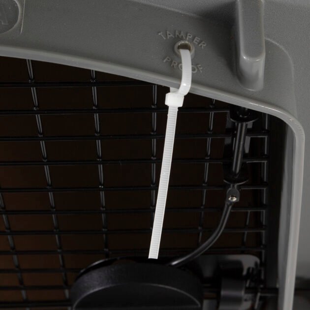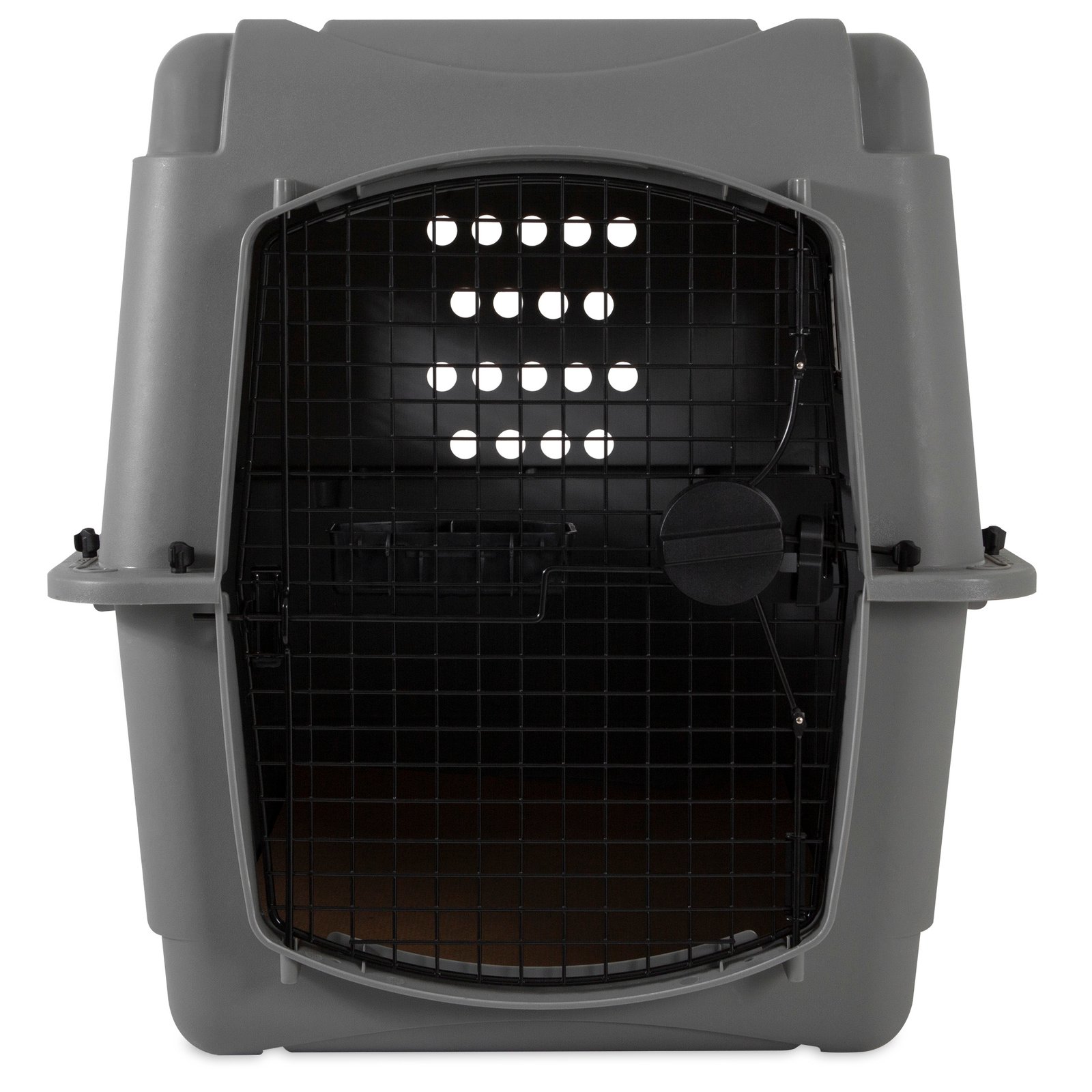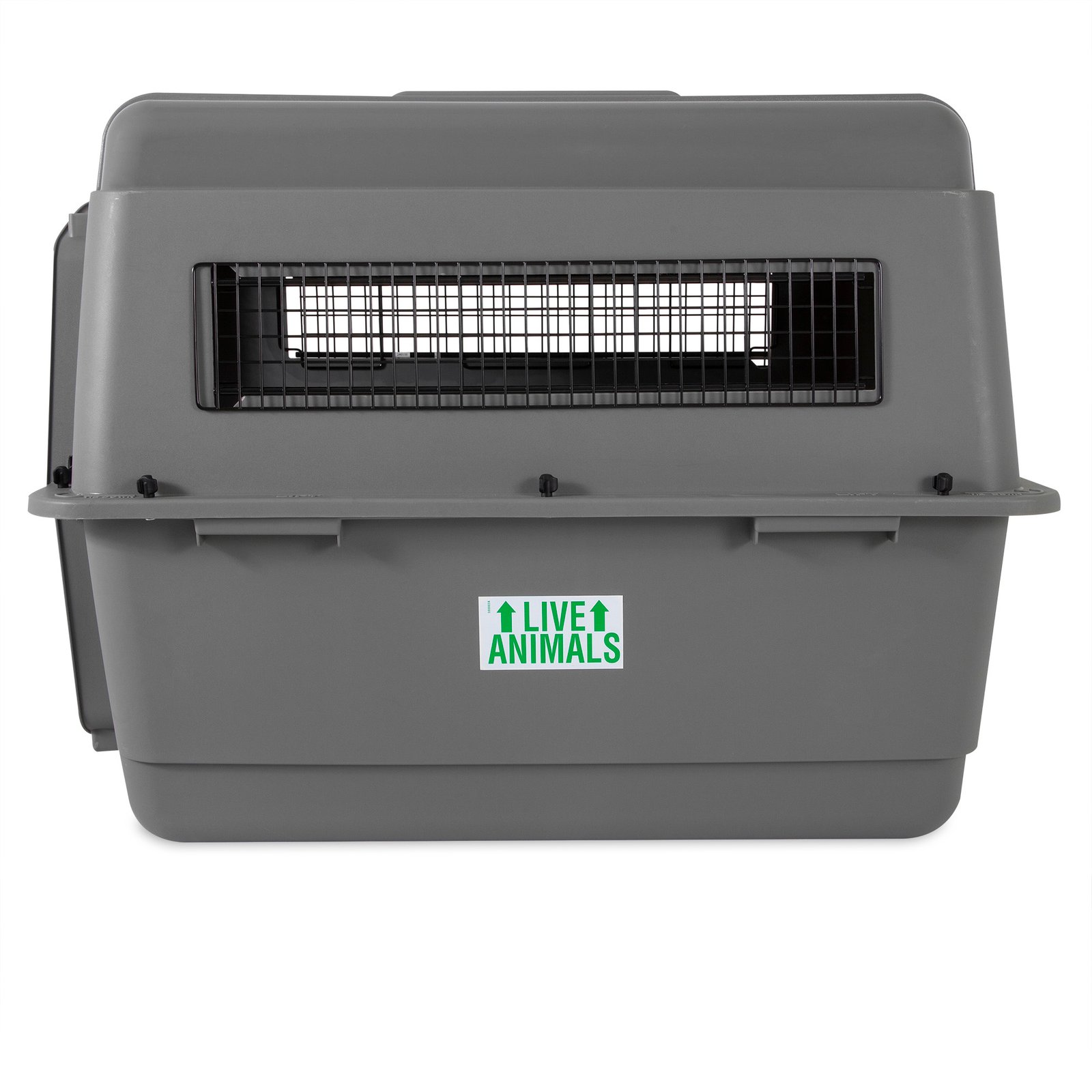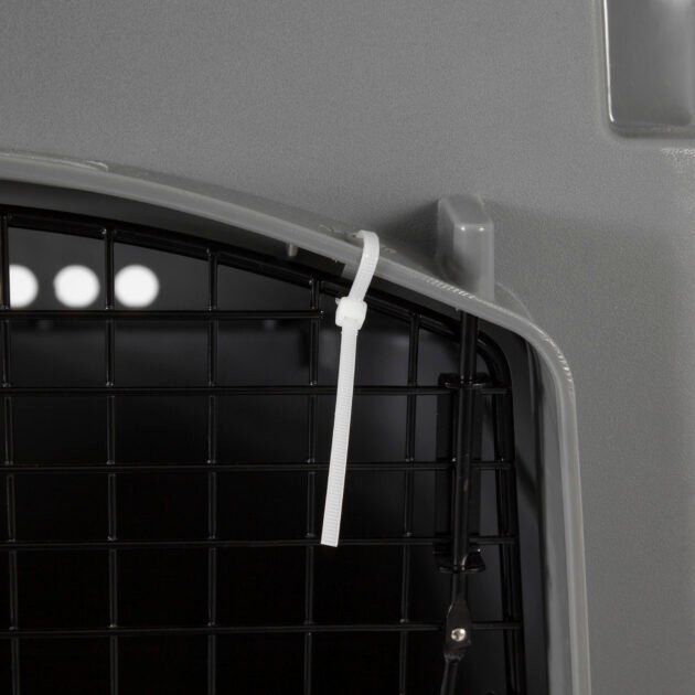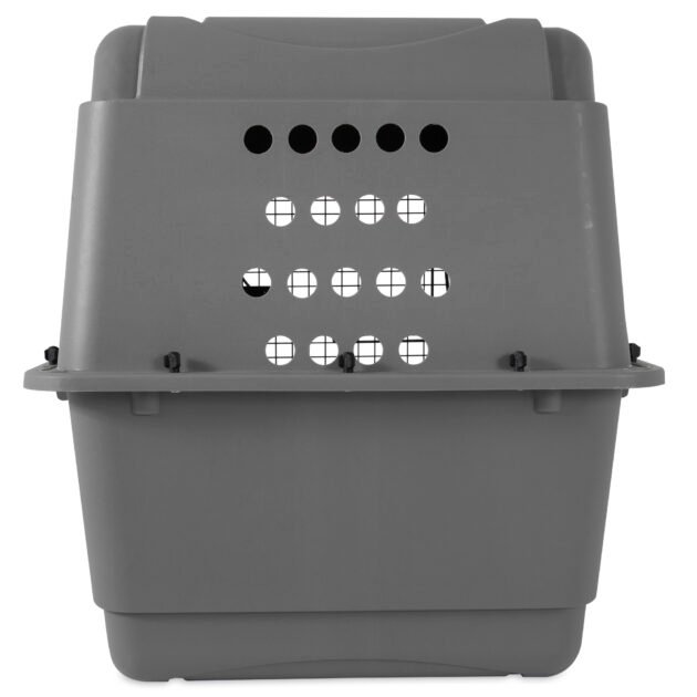 This heavy-duty travel kennel features high-strength construction made with 90% pre-consumer recycled plastic, 360-degree wire ventilation windows for plenty of healthy airflow, and non-corrosive wing-nuts and bolts for durable assembly.