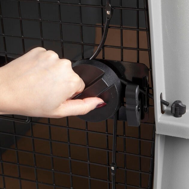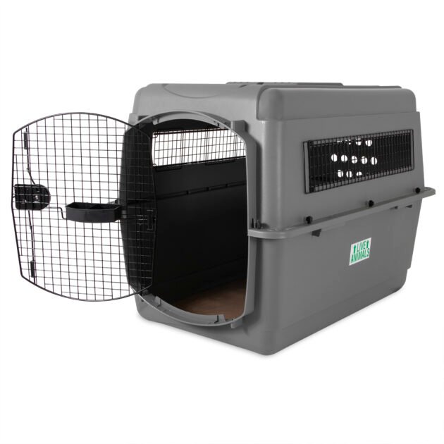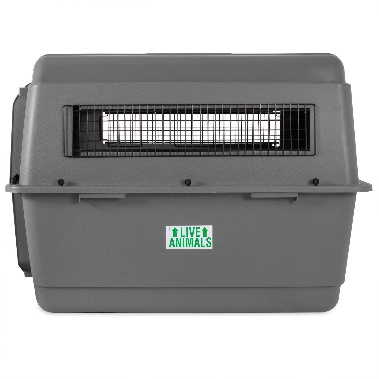 This heavy-duty travel kennel features high-strength construction made with 90% pre-consumer recycled plastic, 360-degree wire ventilation windows for plenty of healthy airflow, and non-corrosive wing-nuts and bolts for durable assembly.