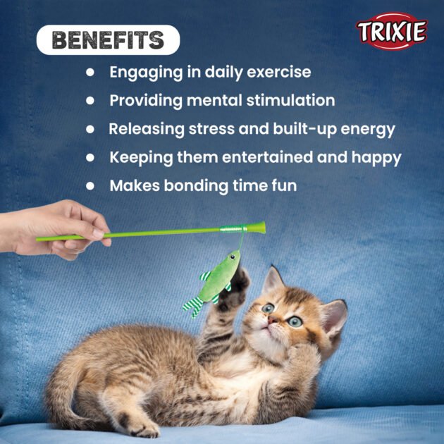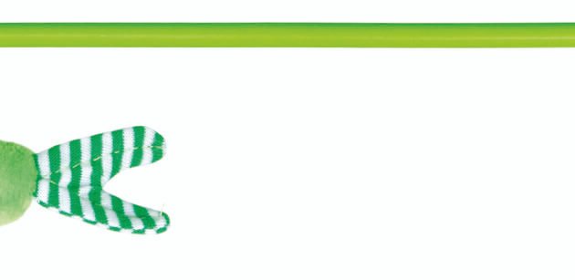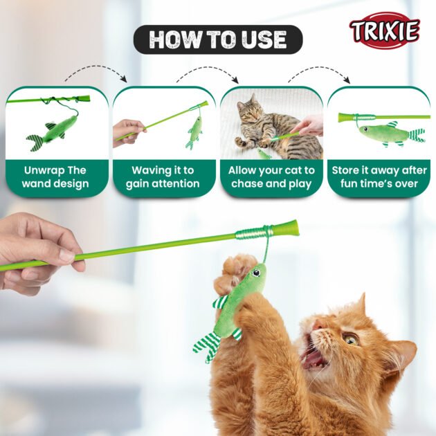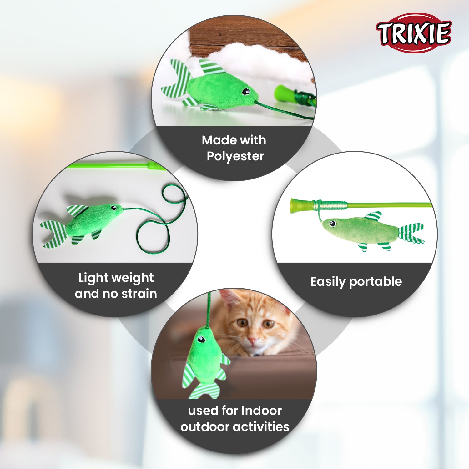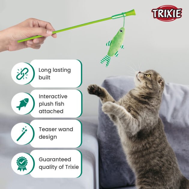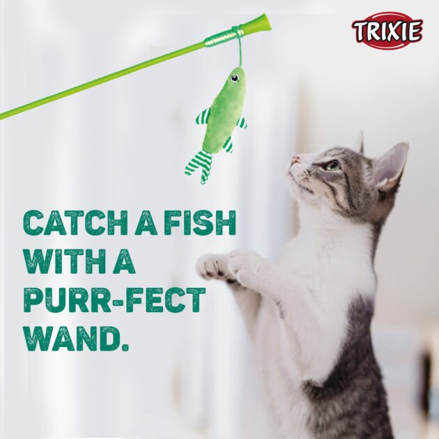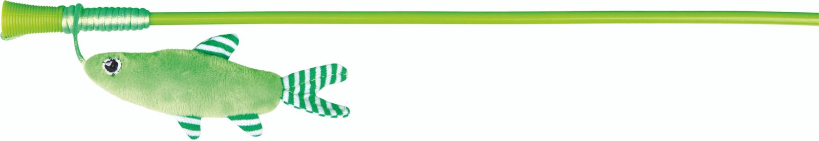 | A teaser rod with a plush fish toy filled with catnip – ideal for interactive cat play. |