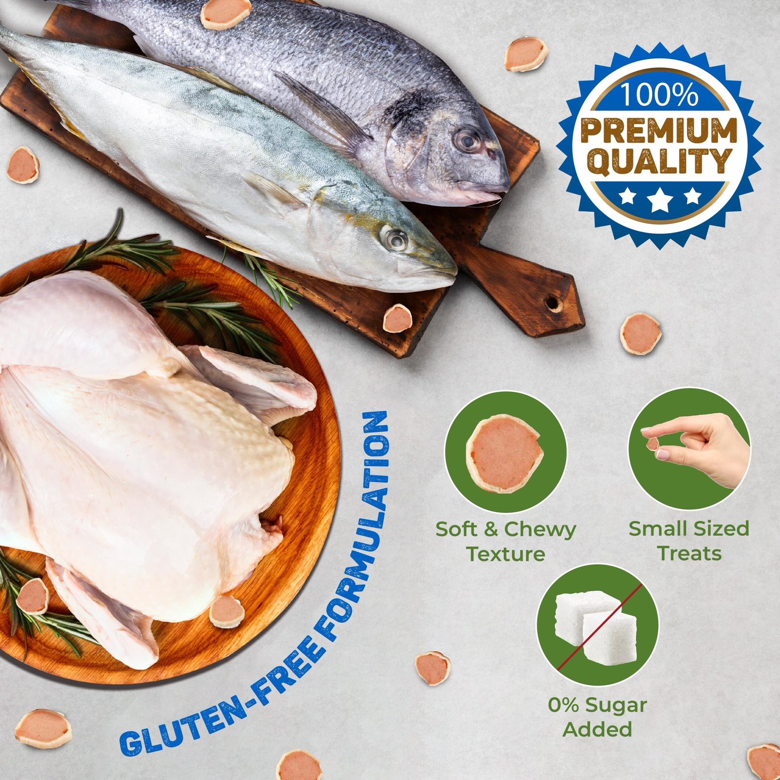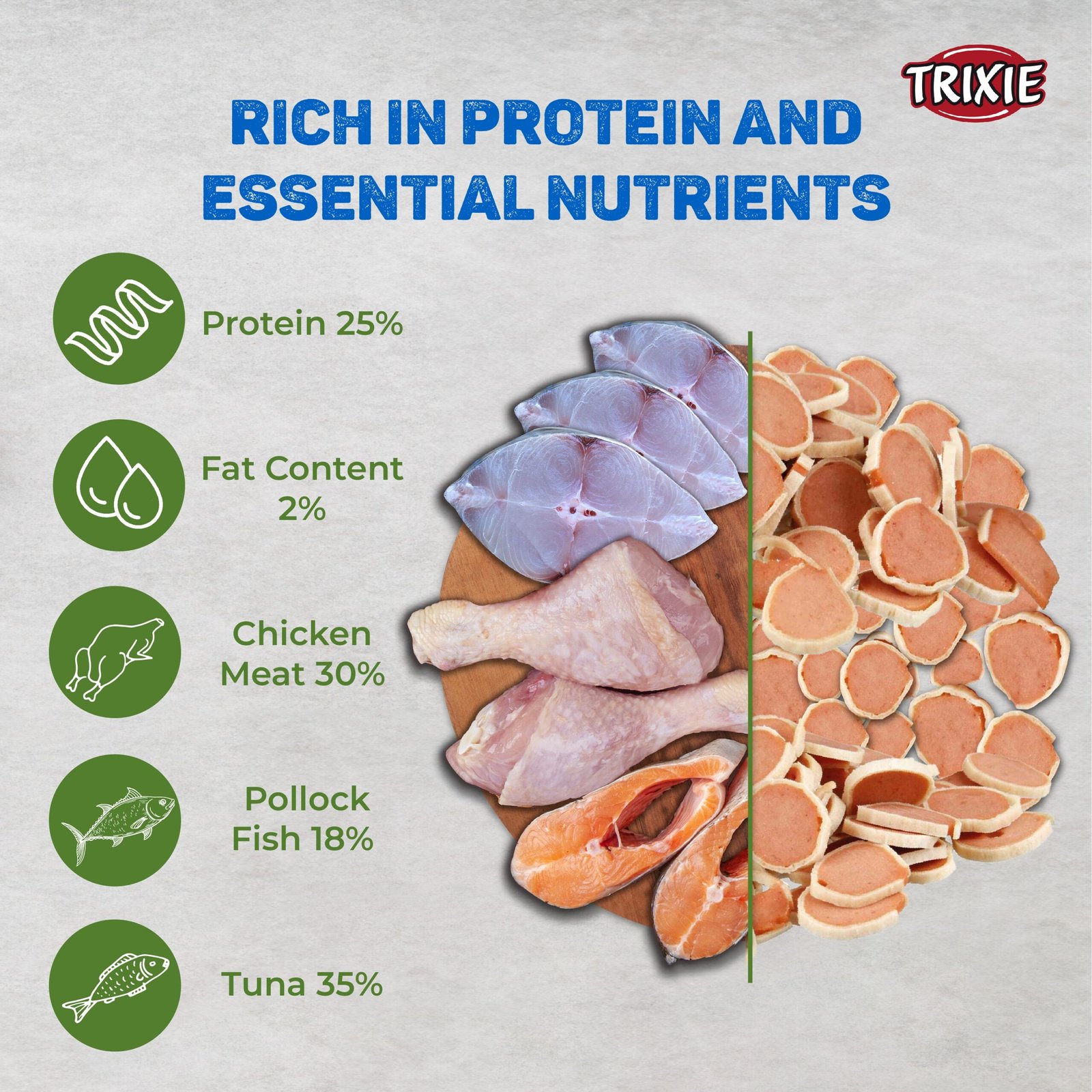 Rolled tuna treats for a chewy  experience.  Created to mimic the experience of a hearty bite.  Ideal for rewarding or occasional indulgence.