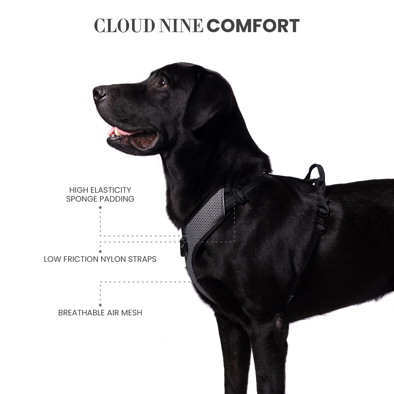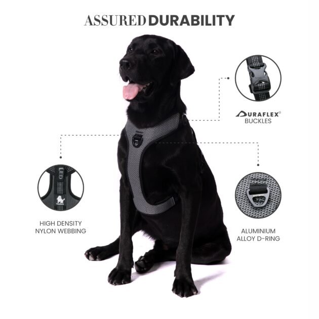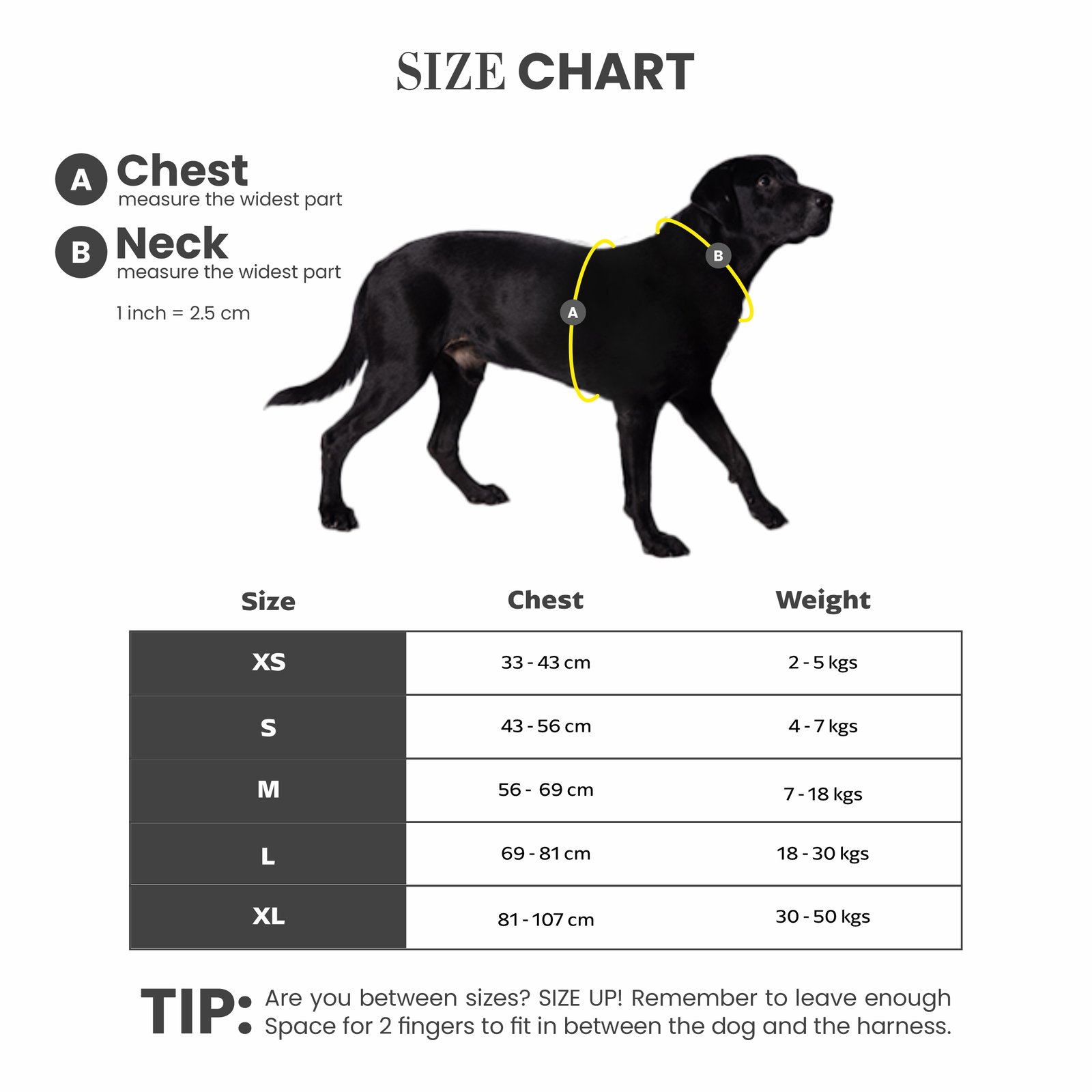 Barkbutler x Truelove Reflective No-Pull, no choke dog padded harness is the only H harness you need for your doggy. What makes Truelove pet vest one of the best in the world? This cute chest harness design has been equipped with patented, heavy load-bearing capacity Duraflex buckles for enhanced security, High-density nylon webbing for longevity, and the aluminium alloy D-rings keeps the harness light while maintaining durability. When it comes to comfort, the ultra-soft & comfortable, breathable air mesh with high elasticity sponge padding, combined with low friction soft nylon straps makes it an extremely comfortable choice for long & short walks. The 3M reflective stitching & piping by 3M Scotchlite – pioneers in Safety equipment around the world, makes walking in the dark with this dog body harness brighter & much safer. For the perfect fit, this harness is made adjustable at the chest & neck area. For maximum control, a Safety/Support handle has been provided on the back of the harness as well. Measure your pet before purchase, refer to the sizing chart in our product images section. Matching leash option available with this Y harness. Pro Tip: Does your dog pull? Connect the leash to the chest or front clip and say goodbye to pulling.