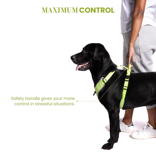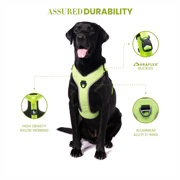 Barkbutler x Truelove Super Reflective No-Pull, no choke dog padded harness is the only H harness you need for your doggy. What makes Truelove pet vest one of the best in the world? This cute chest harness design has been equipped with patented, heavy load-bearing capacity Duraflex buckles for enhanced security, High-density nylon webbing for longevity, and the aluminium alloy D-rings keeps the harness light while maintaining durability. When it comes to comfort, the ultra soft & comfortable, breathable air mesh with high elasticity sponge padding, combined with low friction soft nylon straps makes it an extremely comfortable choice for long & short walks. The 3M reflective stitching & piping by 3M Scotchlite – pioneers in Safety equipment around the world, makes walking in the dark with this dog body harness brighter & much safer. For the perfect fit, this harness is made adjustable at the chest & neck area. For maximum control a Safety/Support handle has been provided on the back of the harness as well. Measure your pet before purchase, refer to the sizing chart in our product images section. Matching leash option available with this Y harness. Hand Wash, only. Pro Tip: Does your dog pull? Connect the leash to the chest or front clip and say goodbye to pulling
