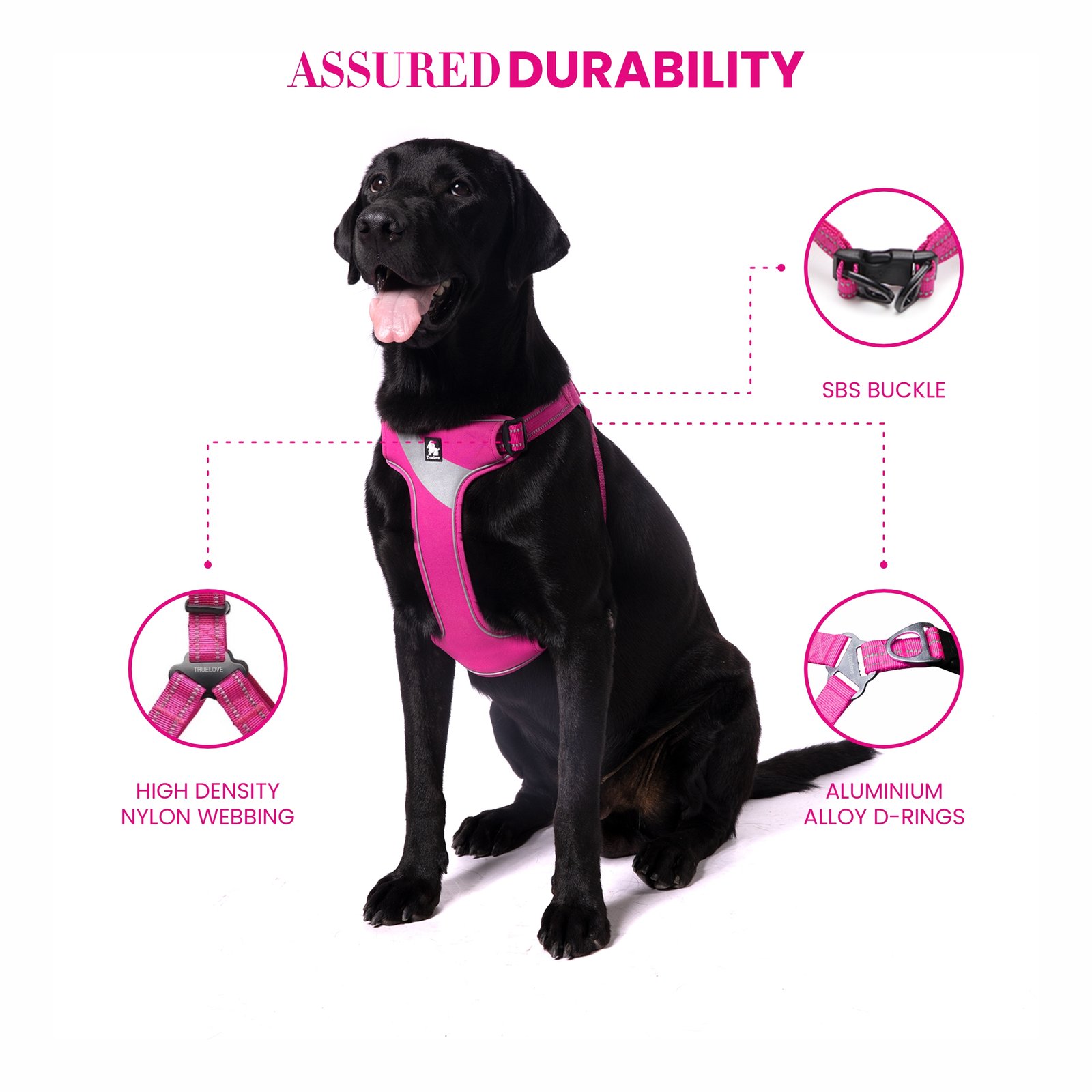 Barkbutler x Truelove No-Escape Step-in no choke dog padded harness is the only harness you need for your doggy. What makes Truelove pet vest one of the best in the world? This cute chest harness design has been equipped with heavy load-bearing capacity SBS buckles for enhanced security, High-density nylon webbing for longevity and the Aviation Grade Aluminium D-rings keeps the harness light while maintaining durability. When it comes to comfort, the ultra-soft & comfortable, breathable air mesh with high elasticity sponge padding, combined with low friction soft nylon straps makes it an extremely comfortable choice for long & short walks. The 3M reflective stitching & piping by 3M Scotchlite – pioneers in Safety equipment around the world, makes walking in the dark with this dog body harness brighter & much safer. For the perfect fit, this harness is adjustable at the chest area. Measure your pet before purchase, refer to the sizing chart in our product images section. Hand Wash only. Fun Fact: Step-in harnesses were invented for nervous dogs who object to having harnesses put on over their heads. They are also much harder to escape from in comparison to other harnesses.